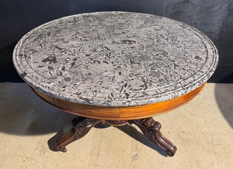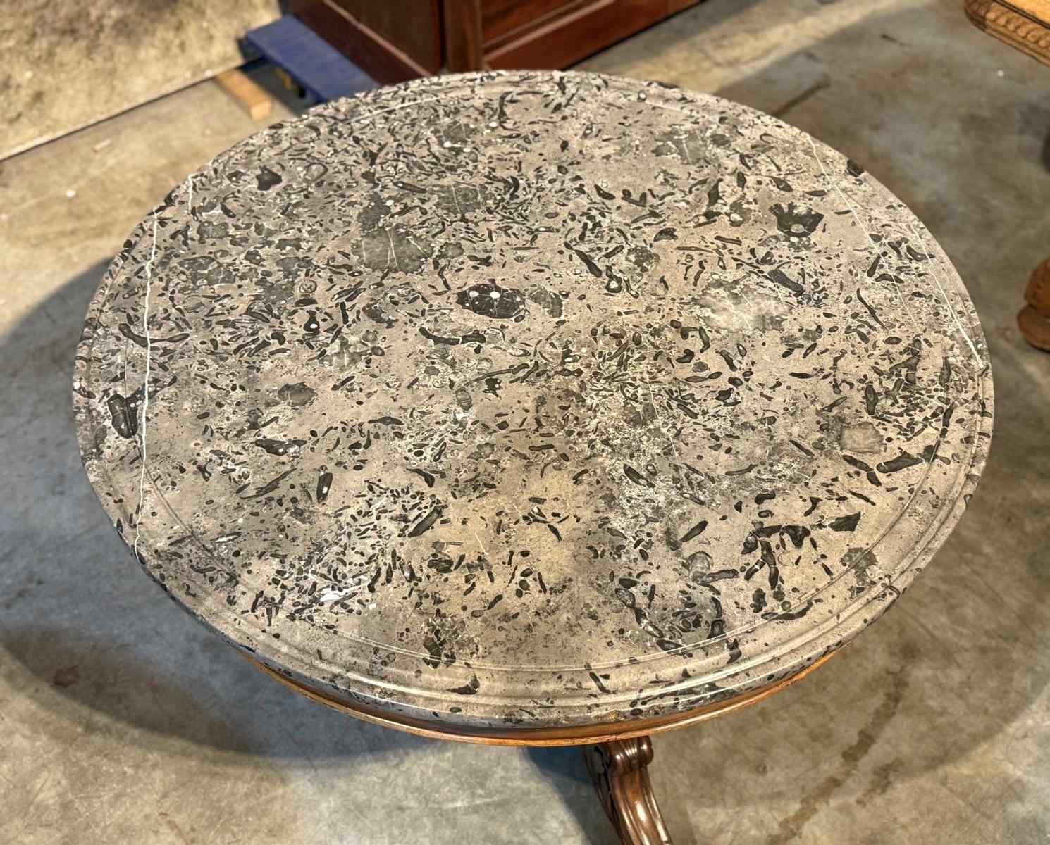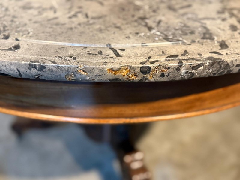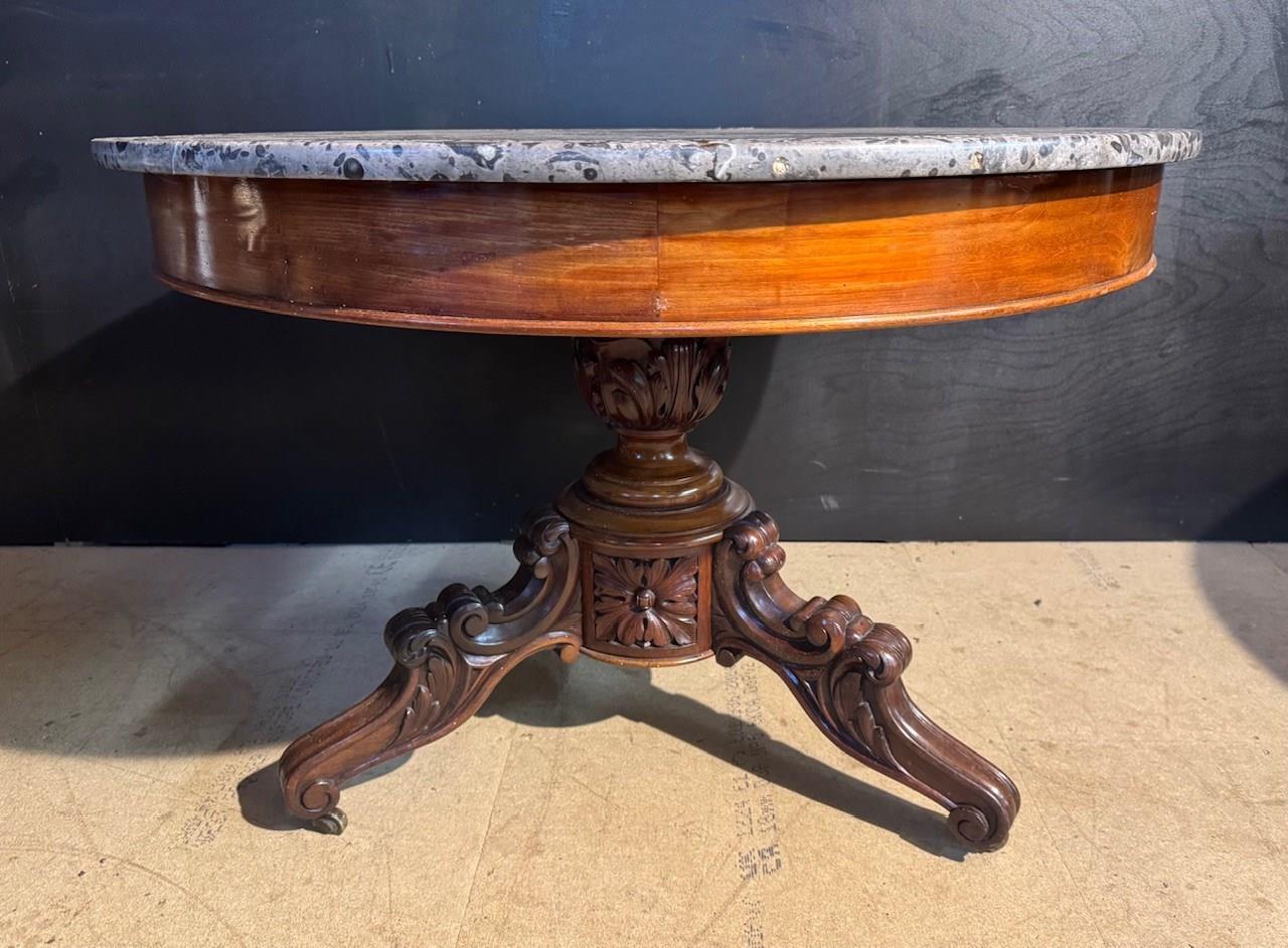 A lovely Gueridon Centre or Hall Table dating to the early 19th Century. Really nice original variegated marble top with carved concentric circles towards the edge. The base is mahogany with crisp carved decoration.