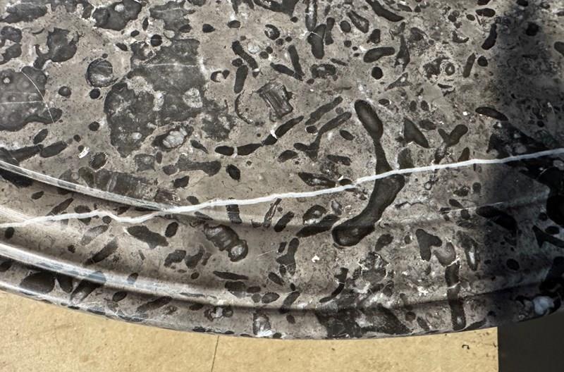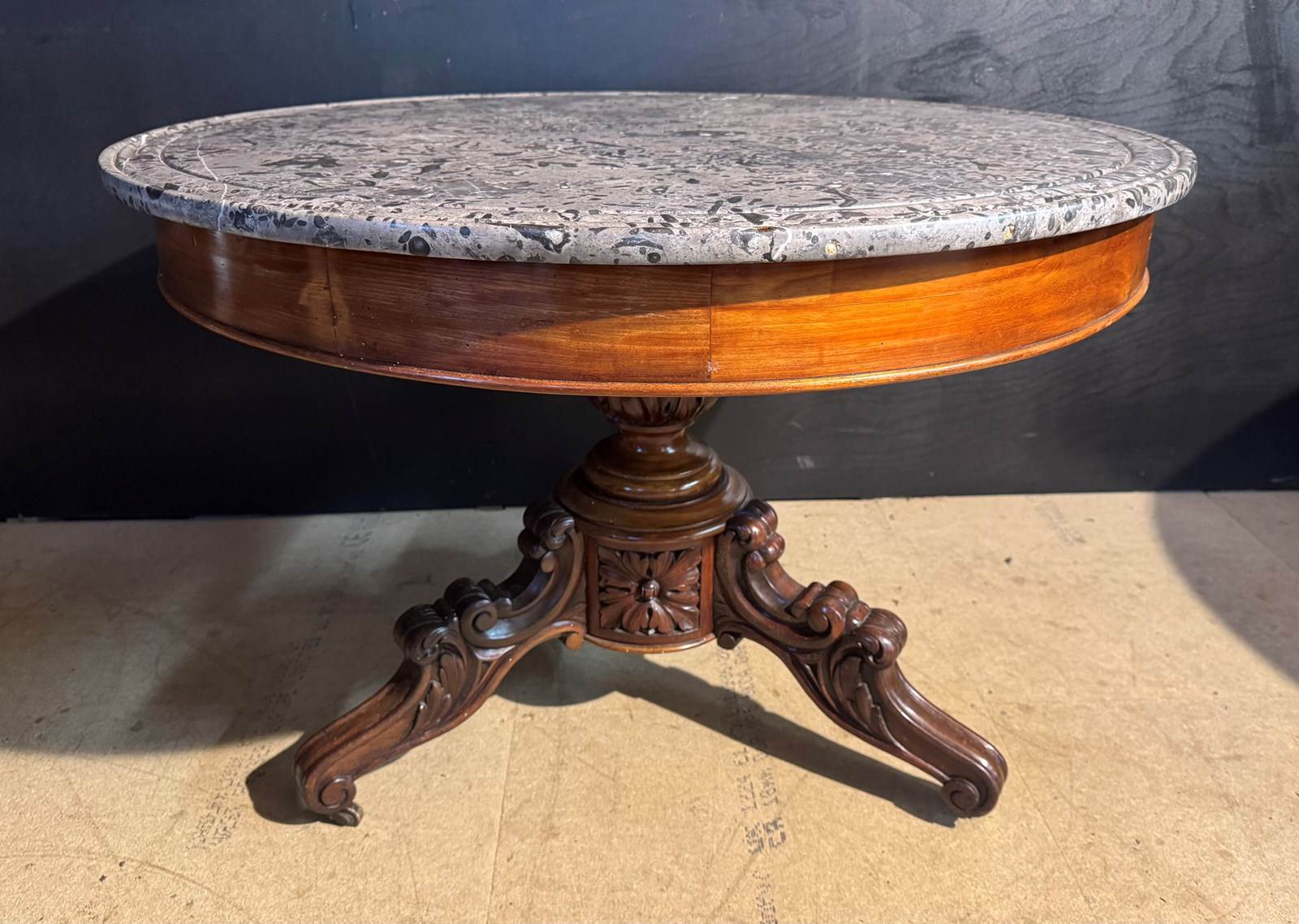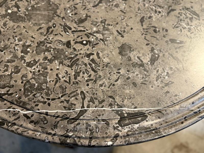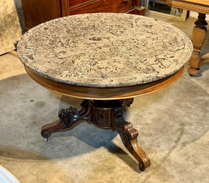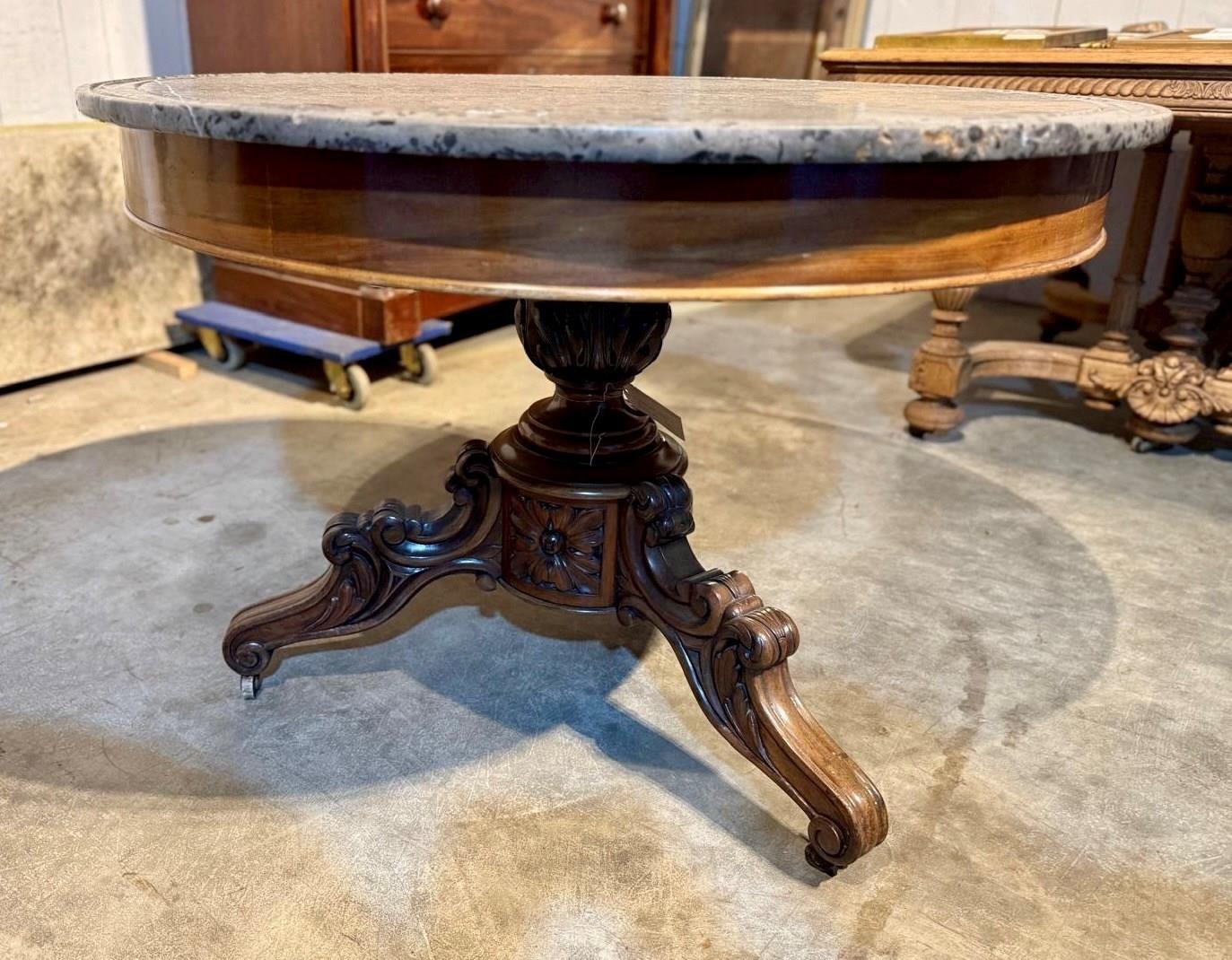 A lovely Gueridon Centre or Hall Table dating to the early 19th Century. Really nice original variegated marble top with carved concentric circles towards the edge. The base is mahogany with crisp carved decoration.
