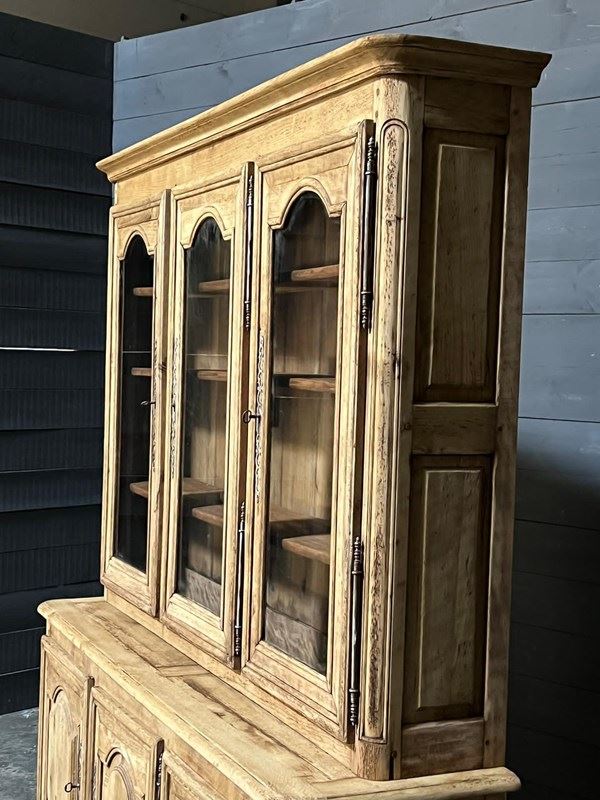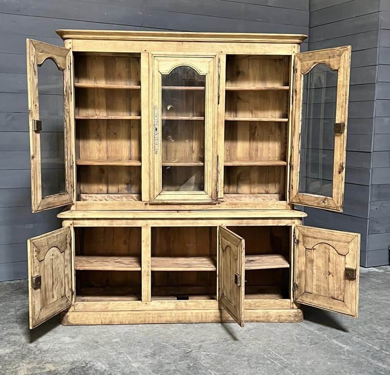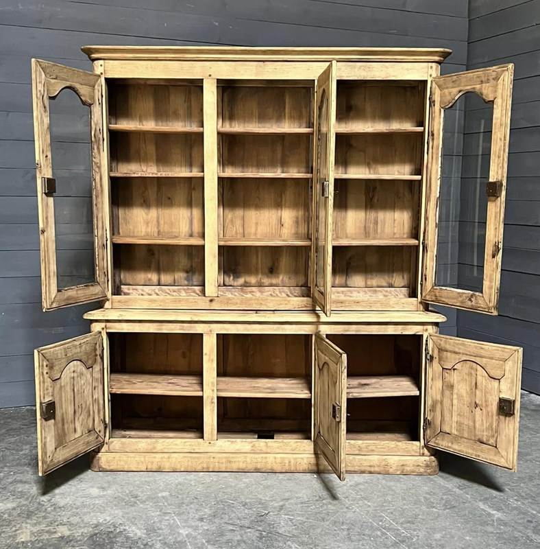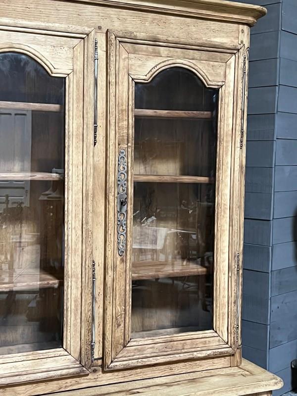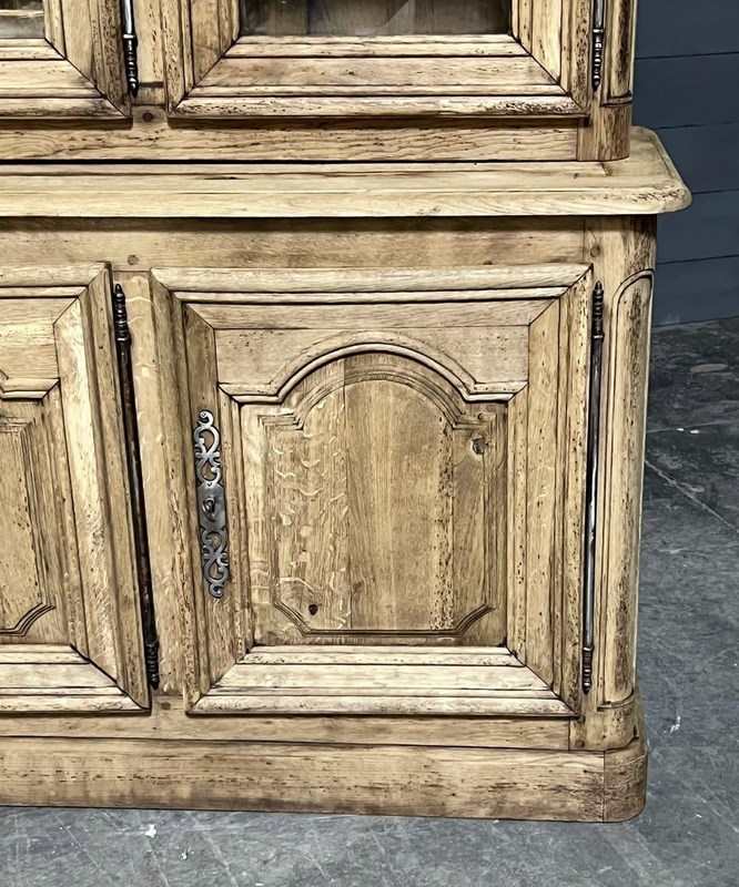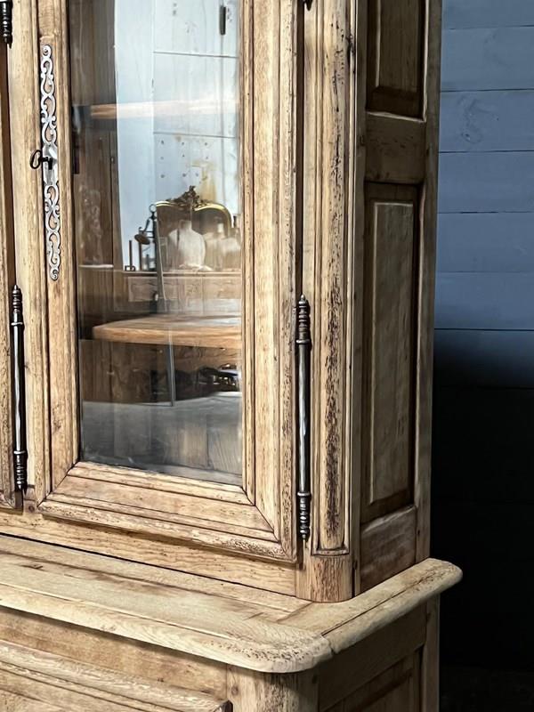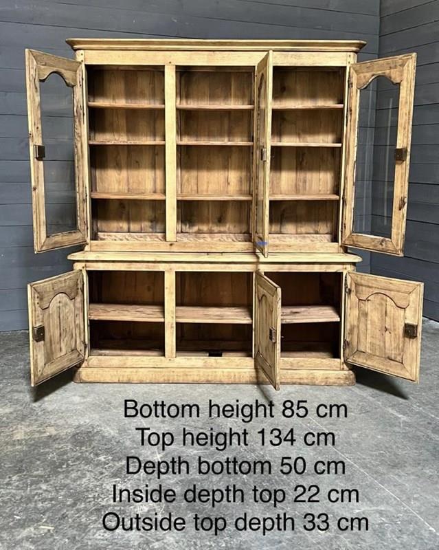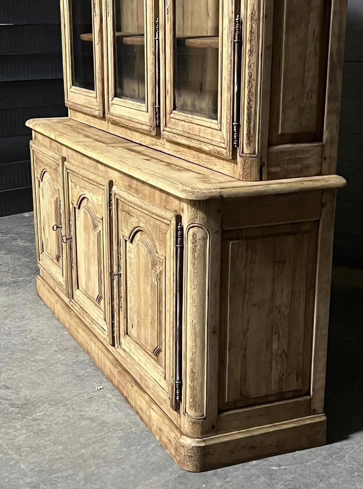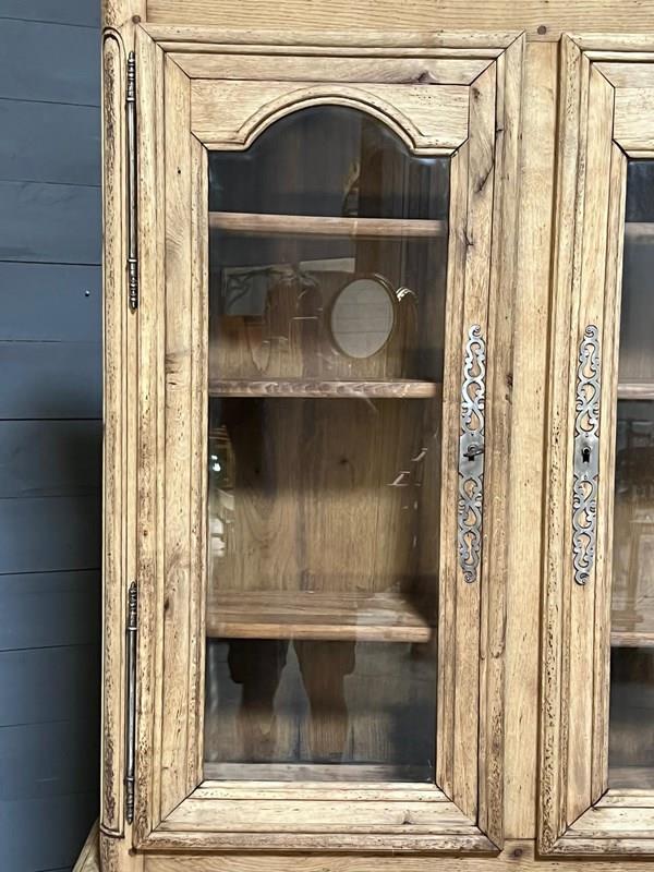 An amazing French Oak Library Bookcase. Lovely style and excellent quality construction, made from solid oak. The top 3 lockable (keys present) glazed doors open to reveal 3 shelves in each section, the shelf depth is 22 cm. The bottom 3 lockable doors open to reveal a single shelf. It comes apart into 2 sections for access into the home. We have bleached this to bring out the natural beauty of the wood and it would look amazing in any setting including farmhouse style. In excellent original condition for the home. Height 219 cm Width 190 cm Top Depth 33 cm Bottom Depth 50 cmI’m
