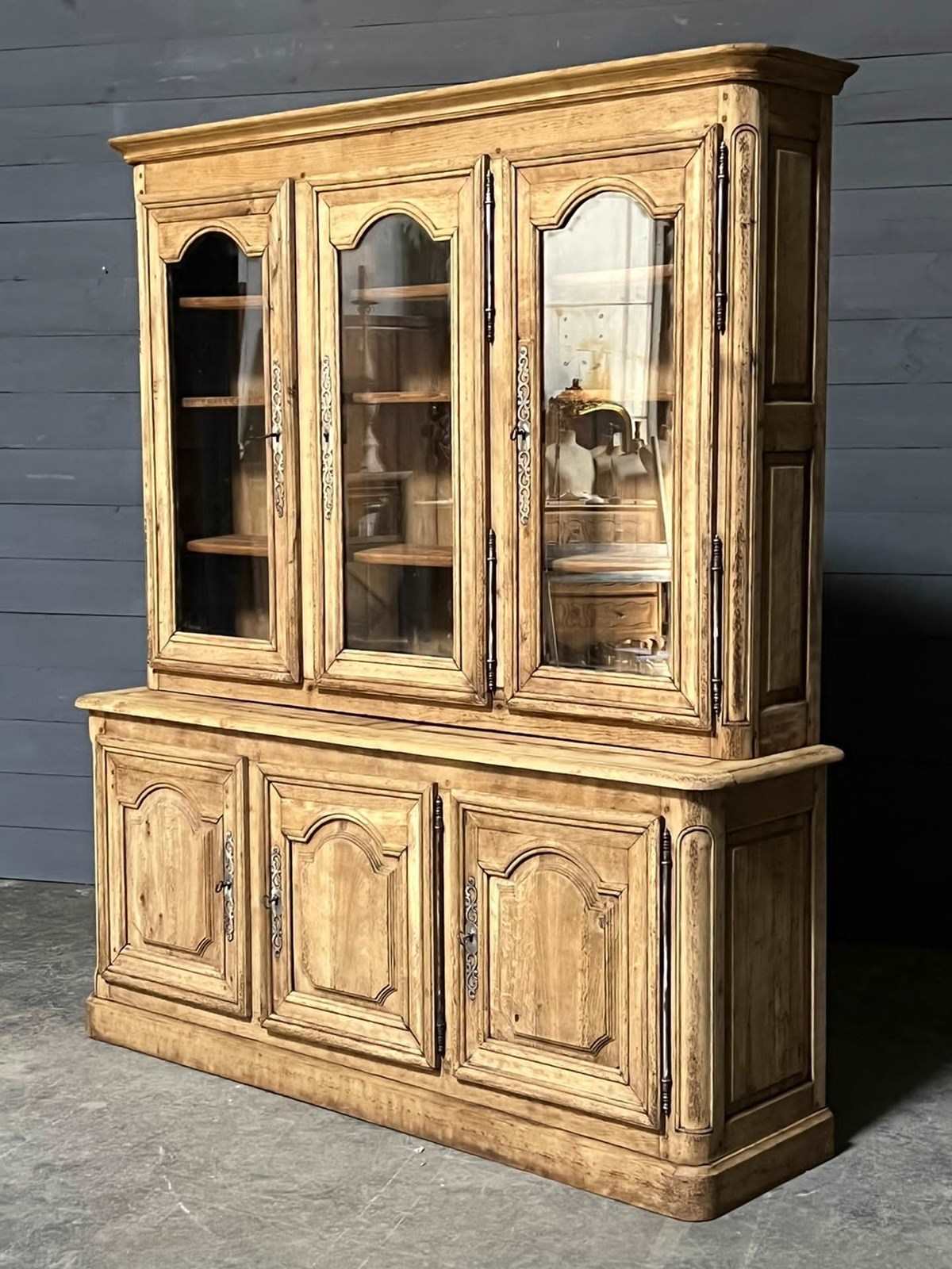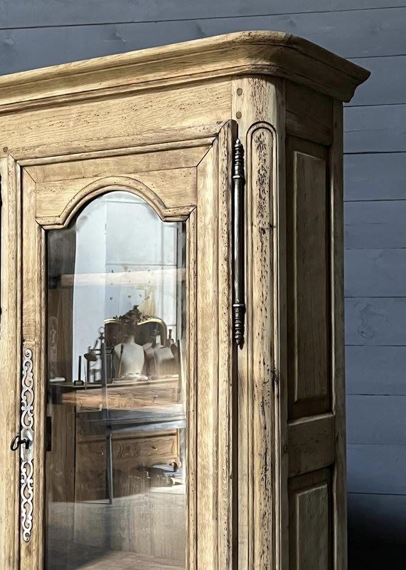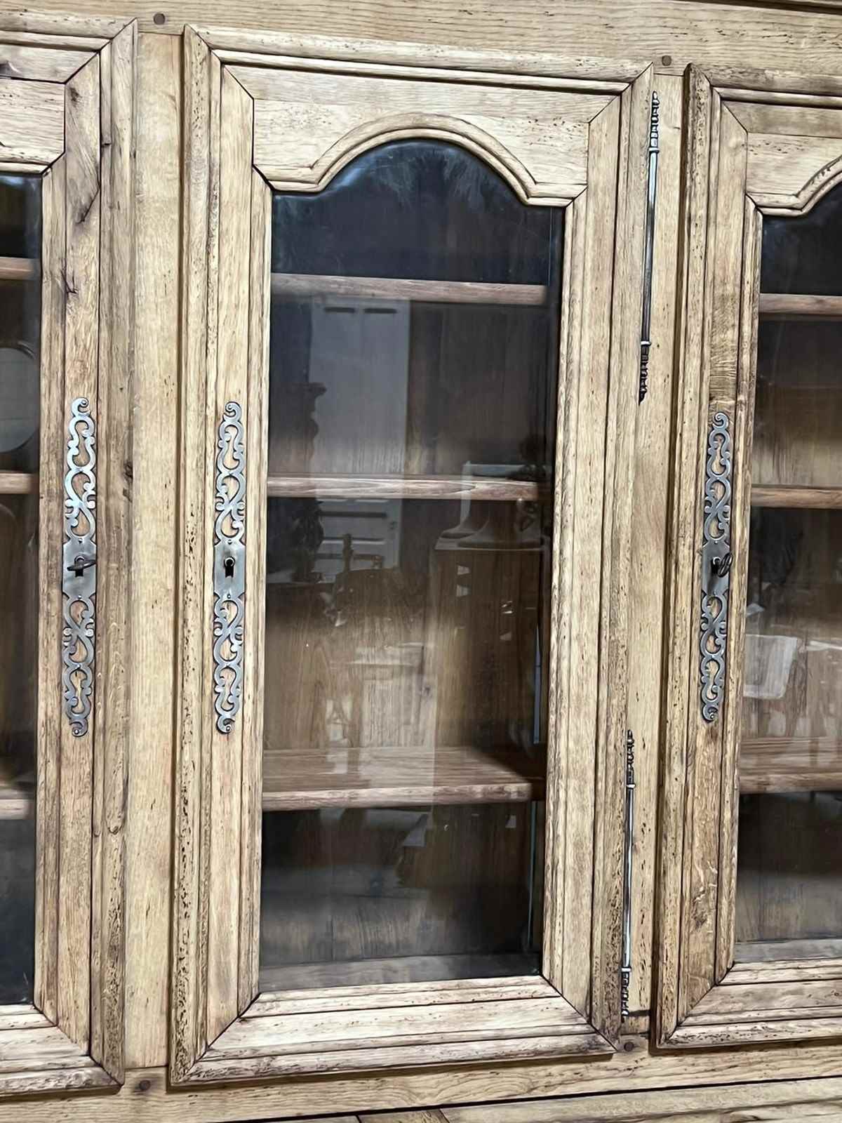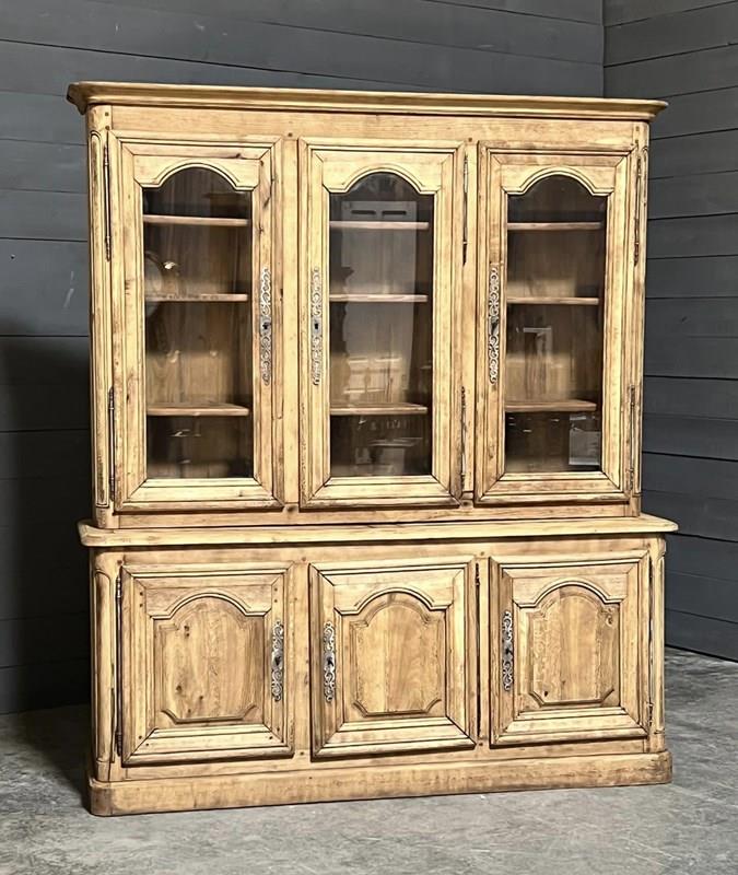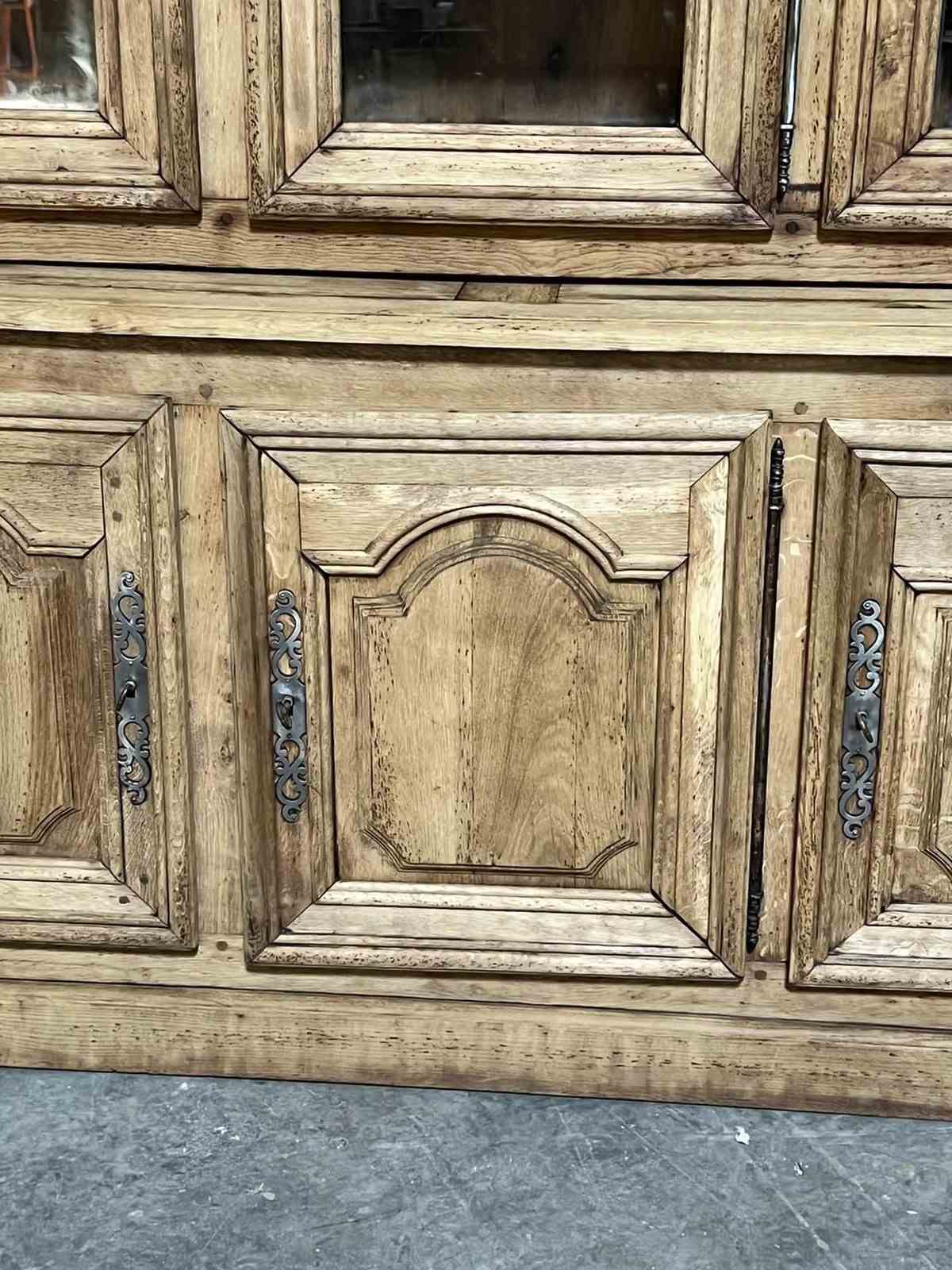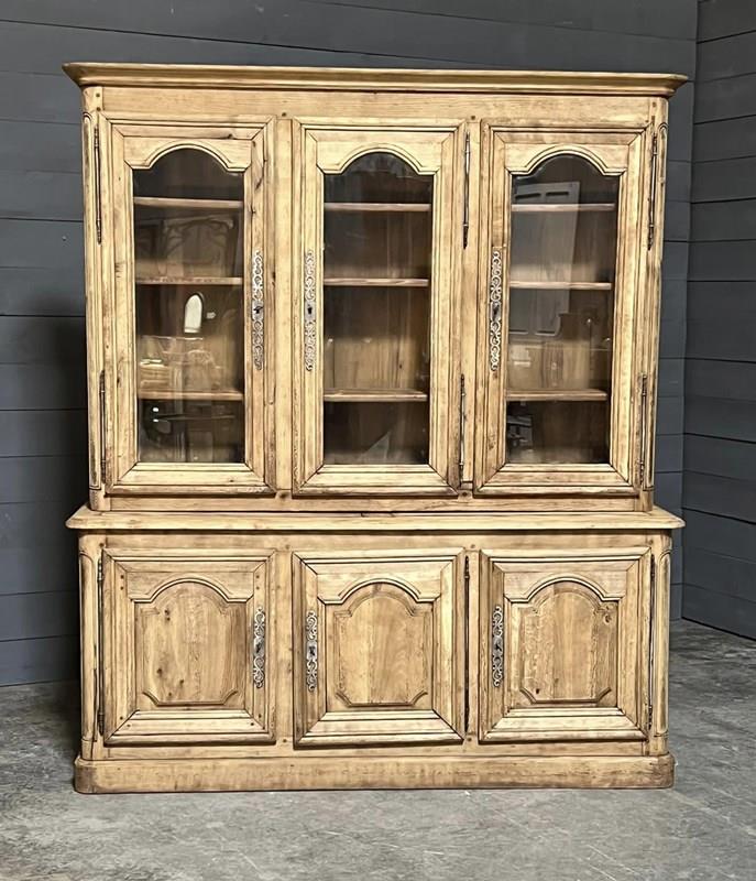 An amazing French Oak Library Bookcase. Lovely style and excellent quality construction, made from solid oak. The top 3 lockable (keys present) glazed doors open to reveal 3 shelves in each section, the shelf depth is 22 cm. The bottom 3 lockable doors open to reveal a single shelf. It comes apart into 2 sections for access into the home. We have bleached this to bring out the natural beauty of the wood and it would look amazing in any setting including farmhouse style. In excellent original condition for the home. Height 219 cm Width 190 cm Top Depth 33 cm Bottom Depth 50 cmI’m