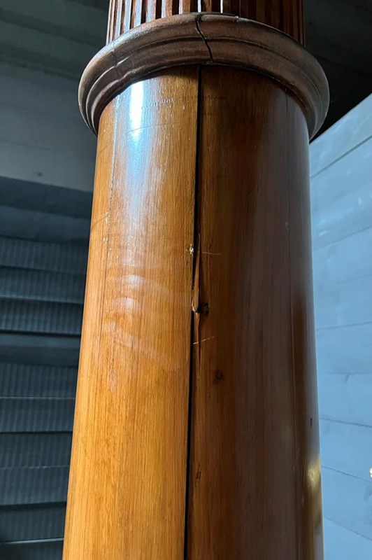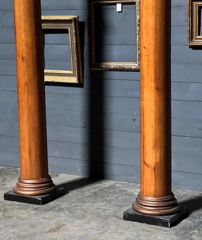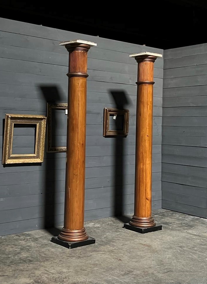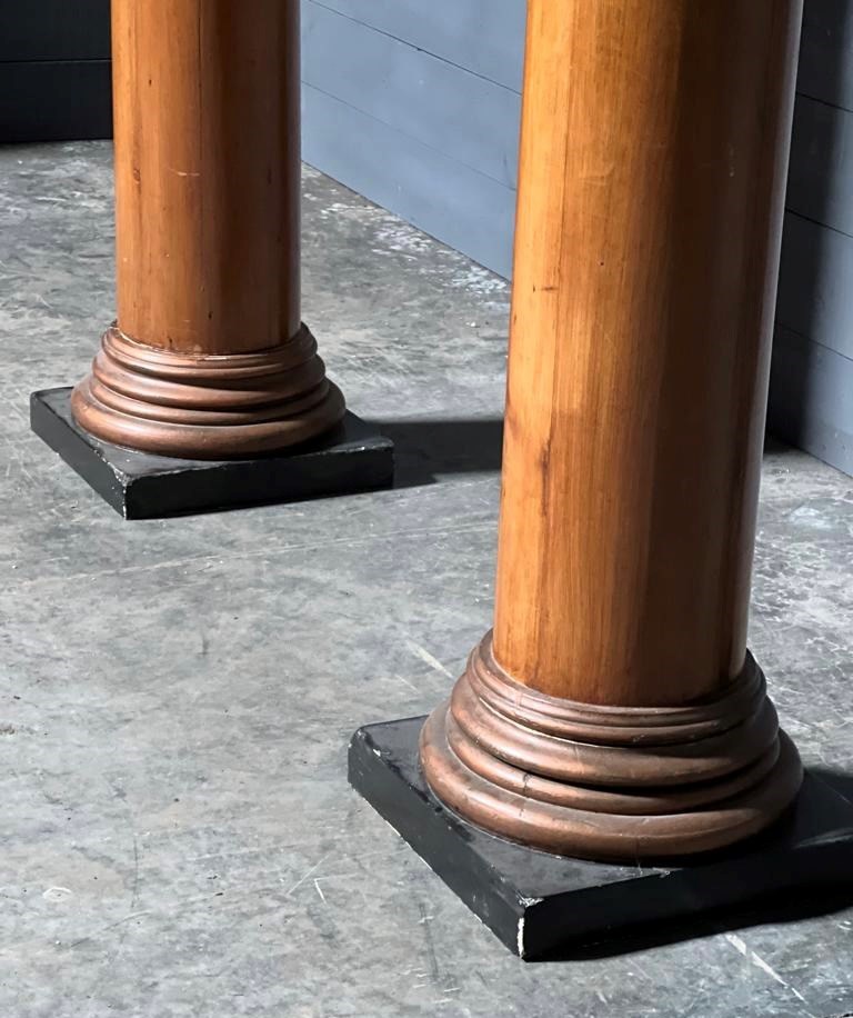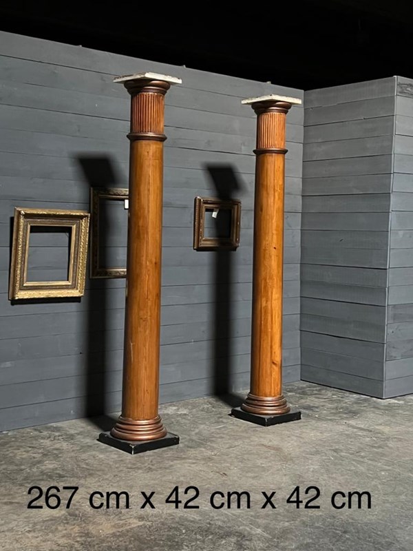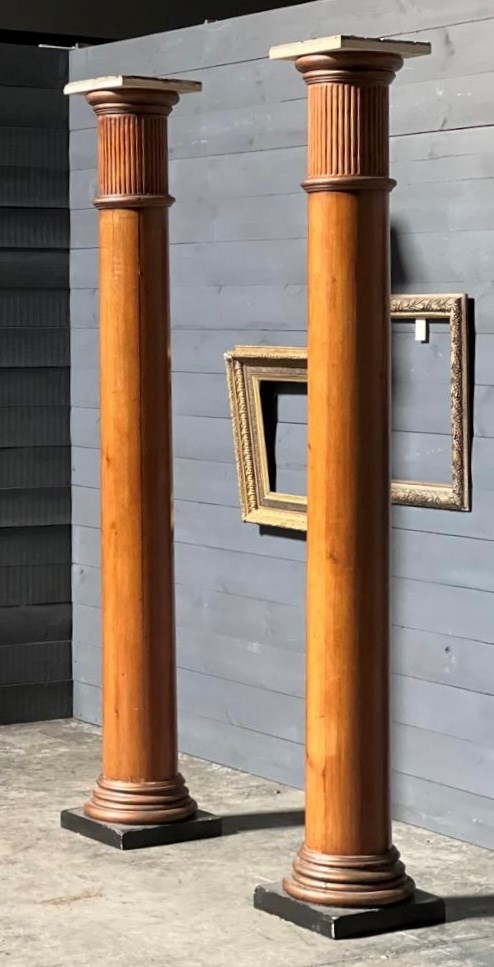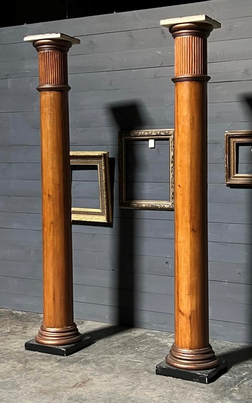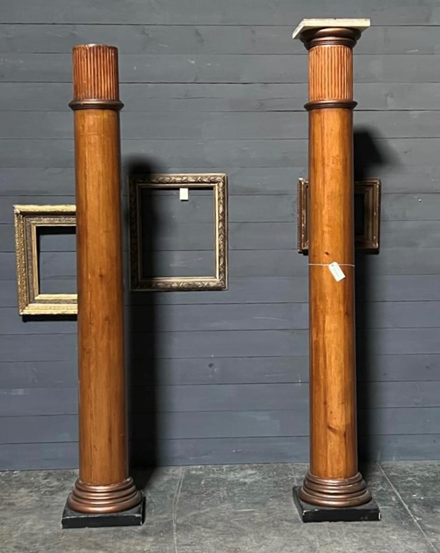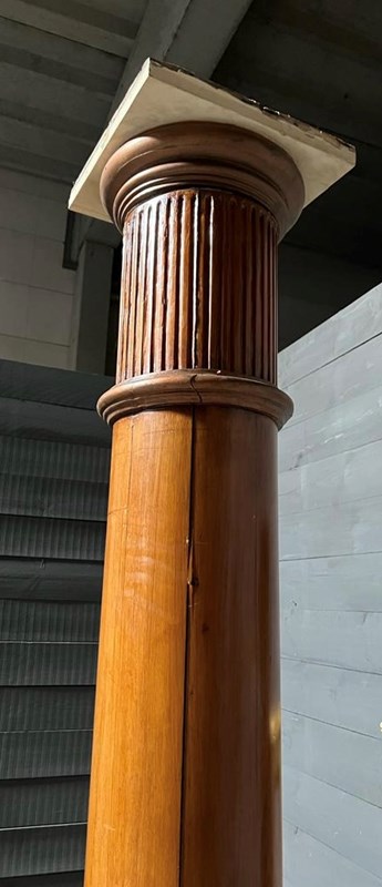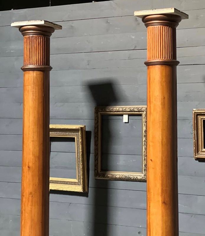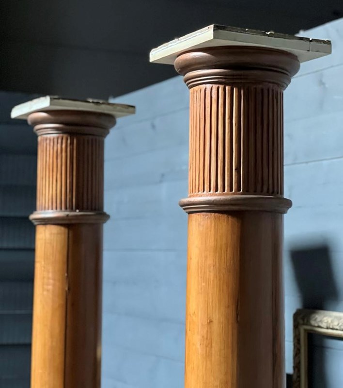 A superb pair of 19th Century Architectural Columns. Made from pine having fluted tops and the very top cap can removed if preferred (see photo). They came from France and have a great decorative look and feel. One has a slight split that could be repaired if needed but other than that in excellent original condition. Height 267 cm Width 42 cm Depth 42 cm