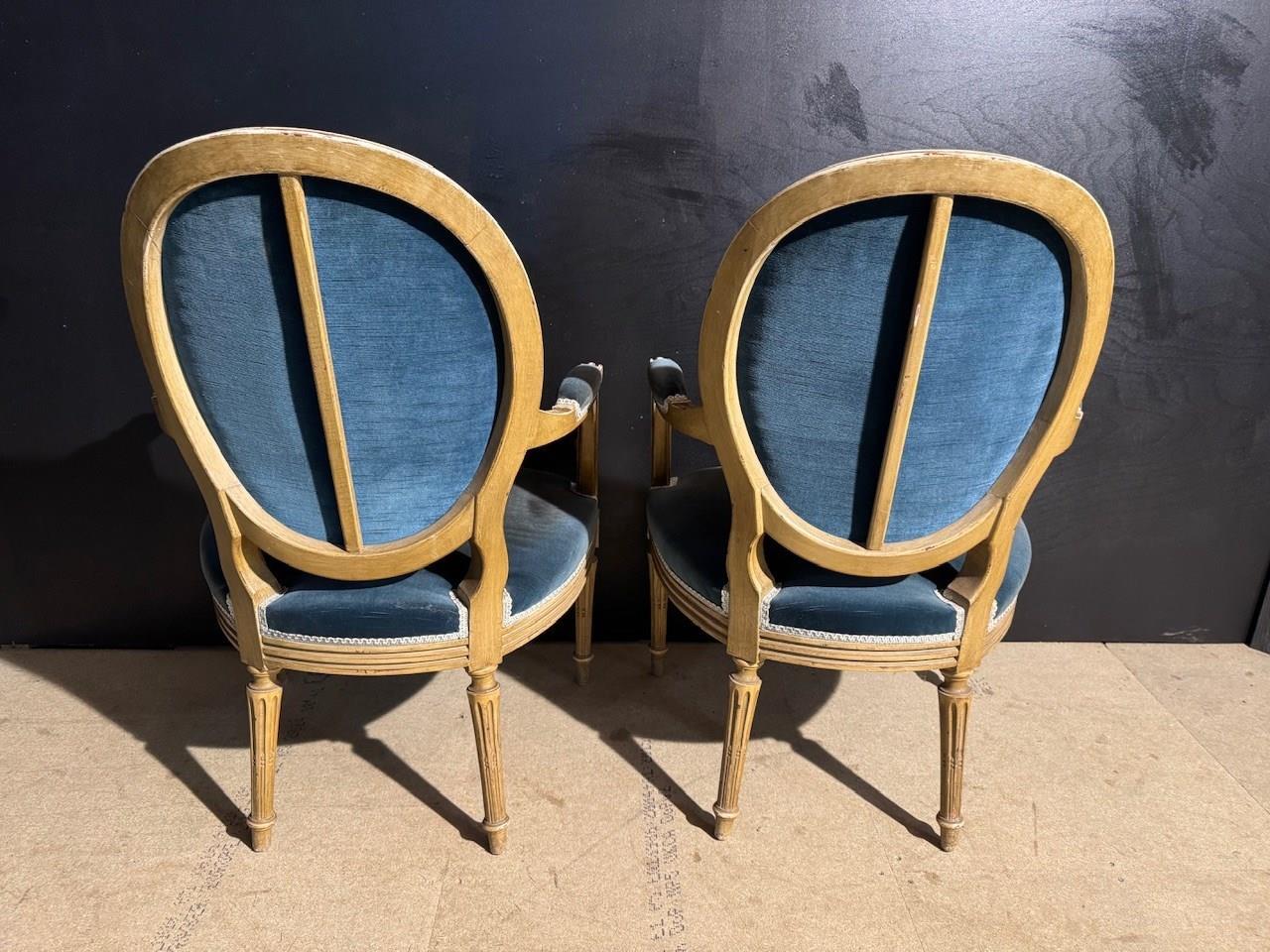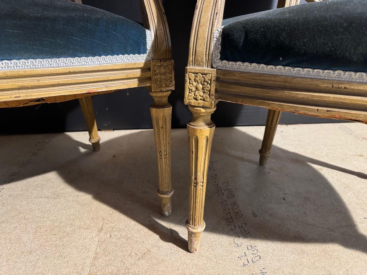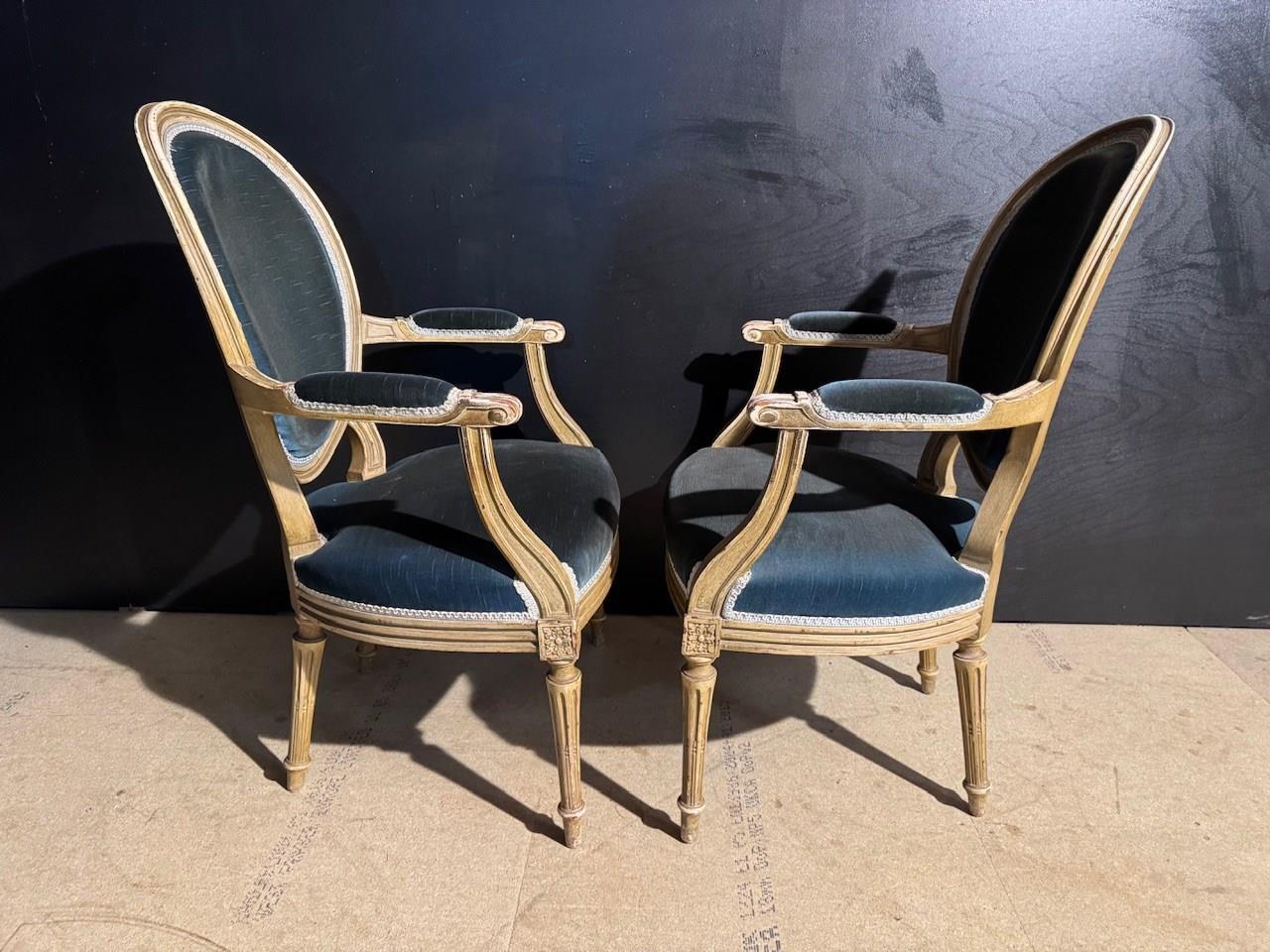 Nice Pair of French Arm Chairs having blue velvet upholstery that is in very good condition. The frames are strong and sturdy and retain their original finish. Height 91.5 cm Width 59 cm Depth 50 cm Seat Height 45 cm