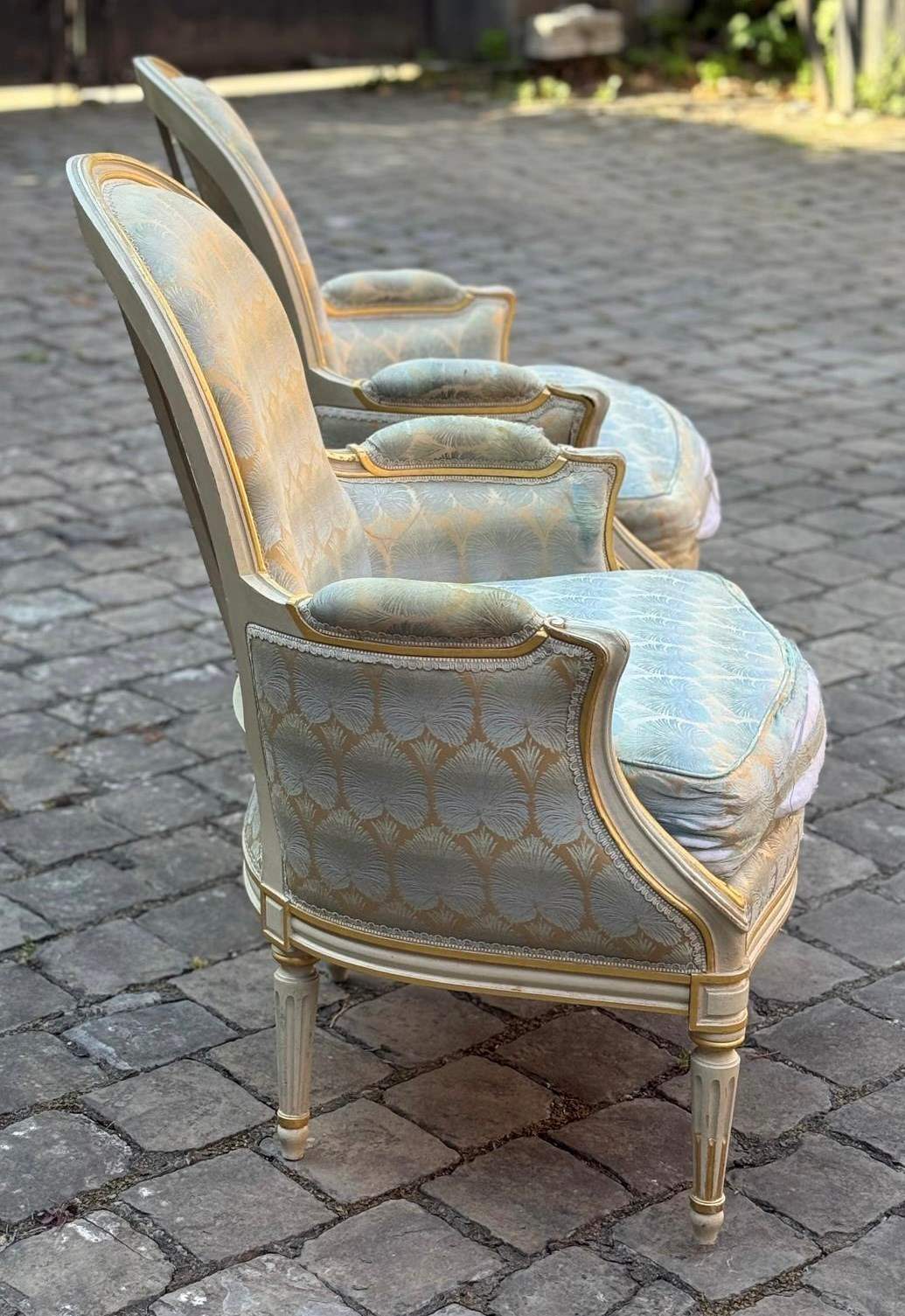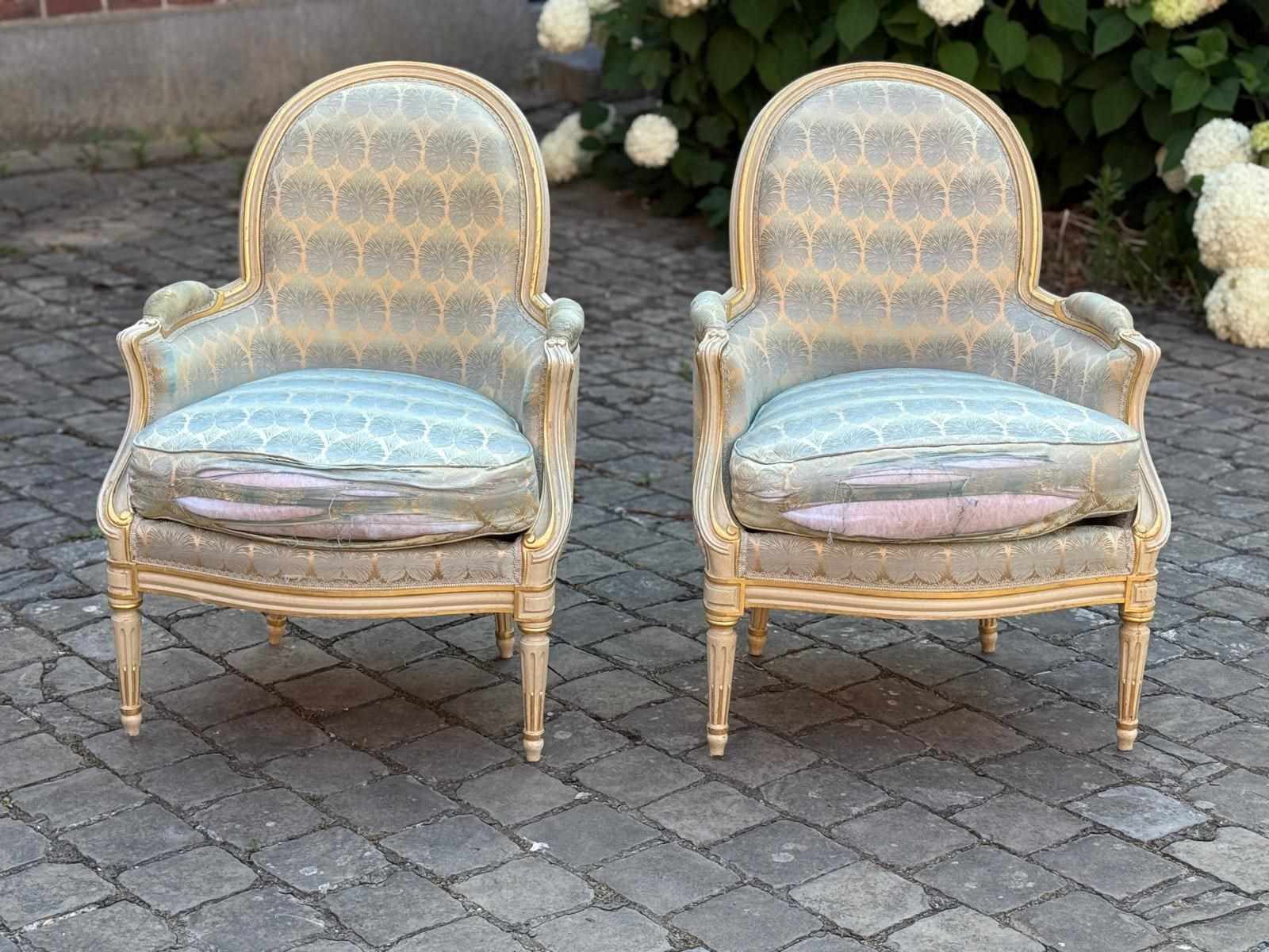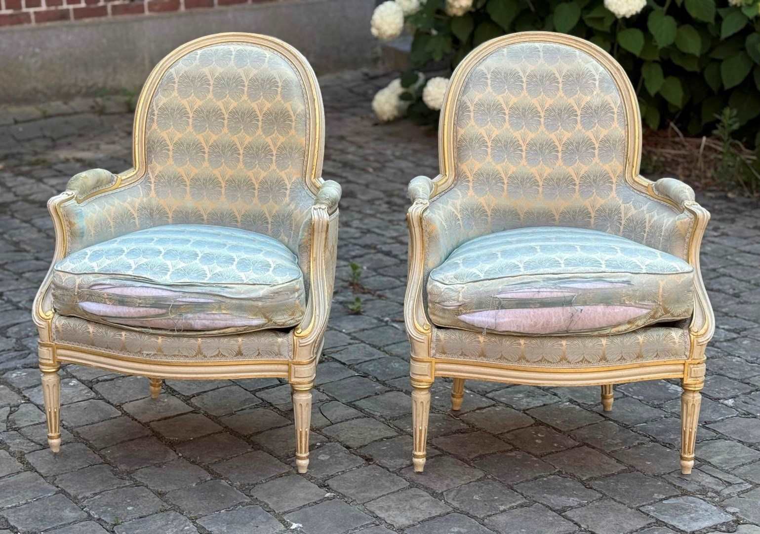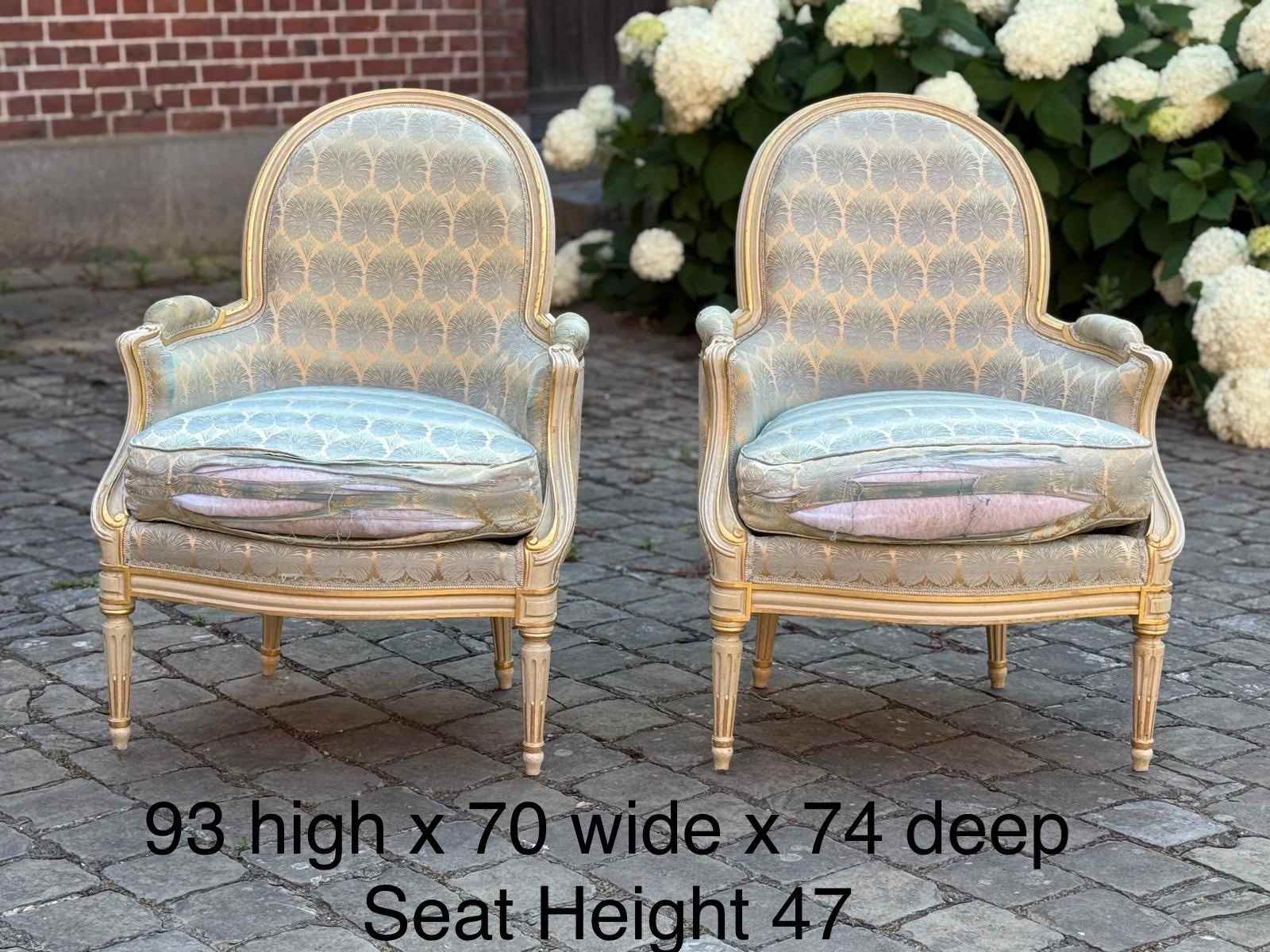 A comfortable pair of French Bergere Arm Chairs ready to be re covered in your fabric. The frames are strong and sturdy and in excellent original condition.