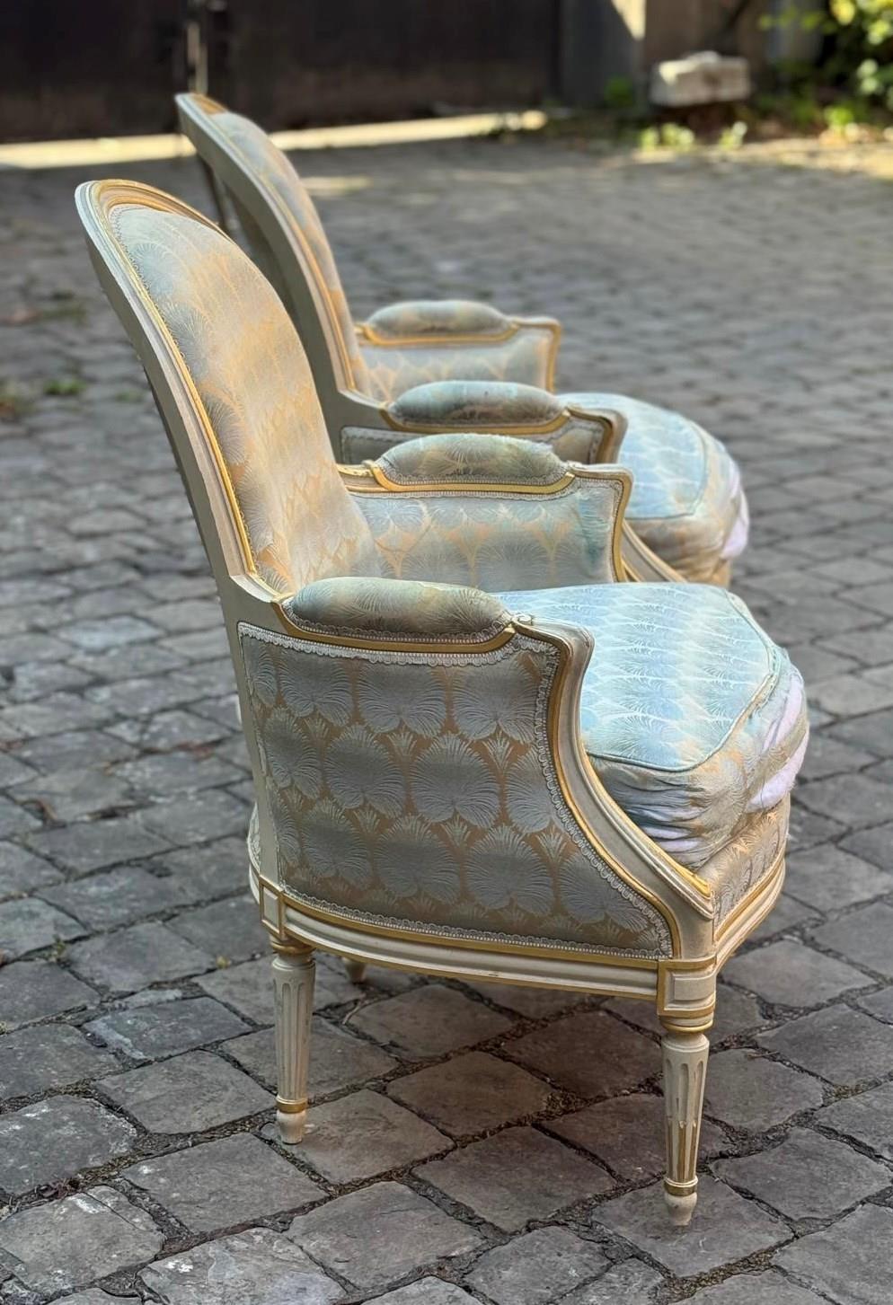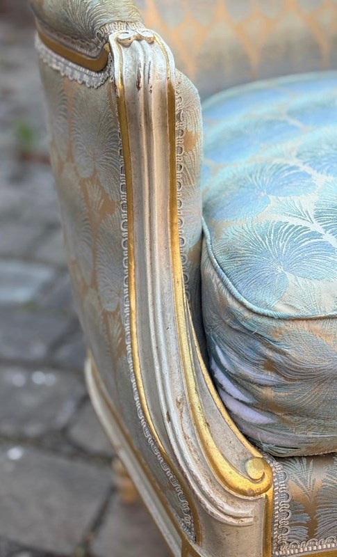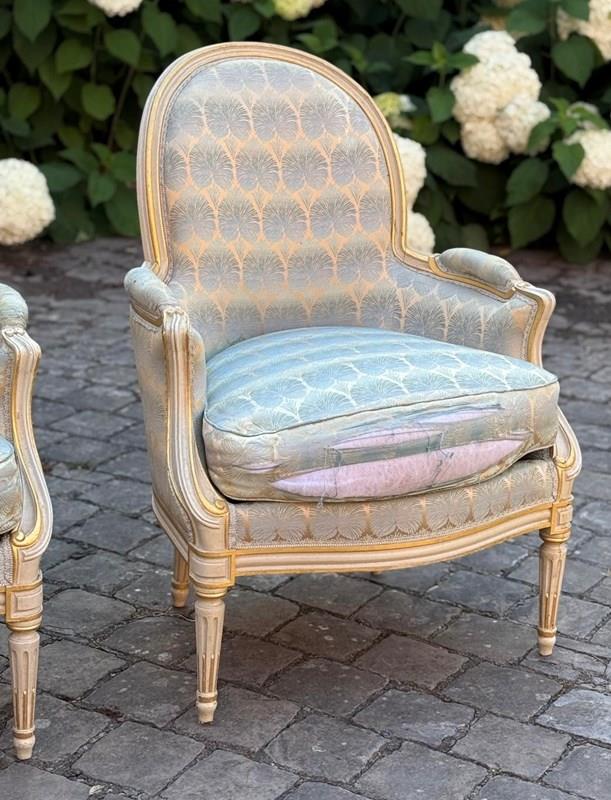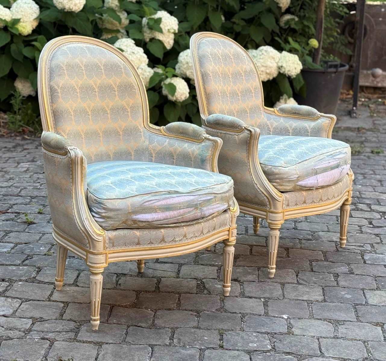 A comfortable pair of French Bergere Arm Chairs ready to be re covered in your fabric. The frames are strong and sturdy and in excellent original condition.
