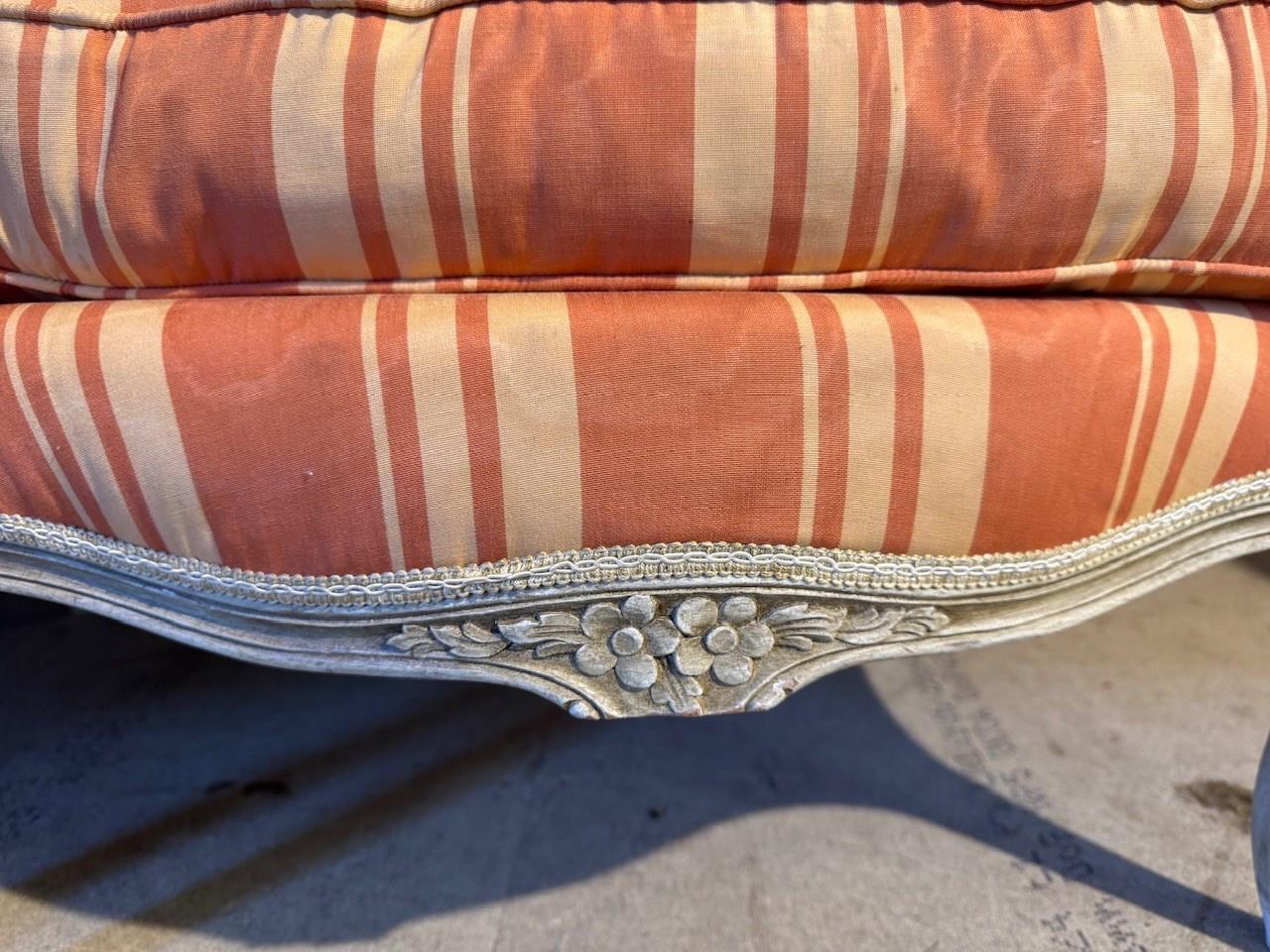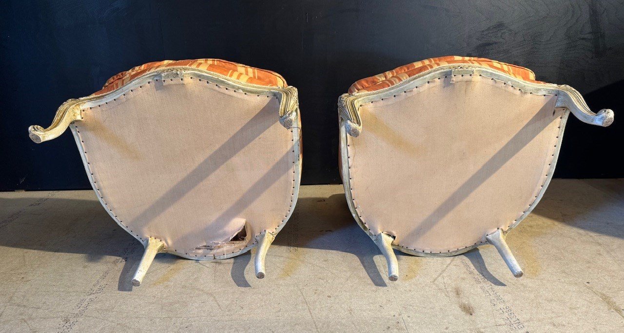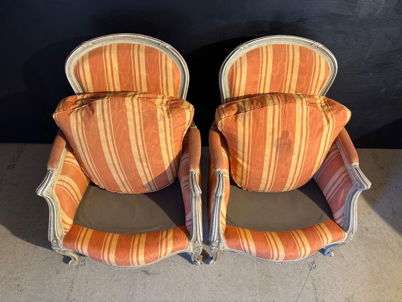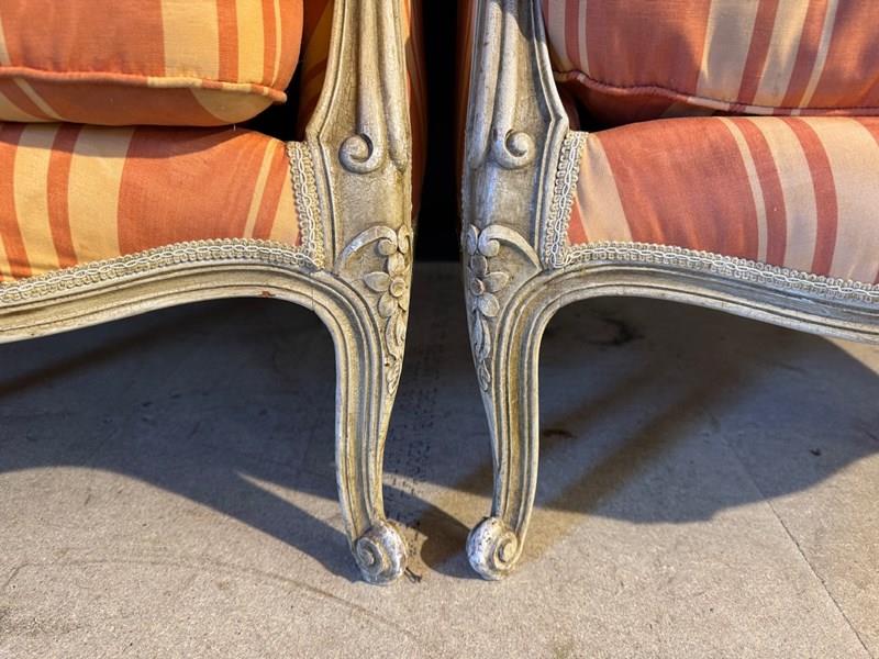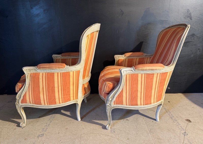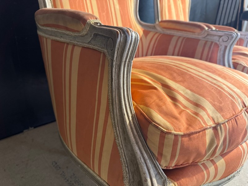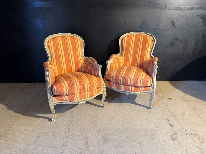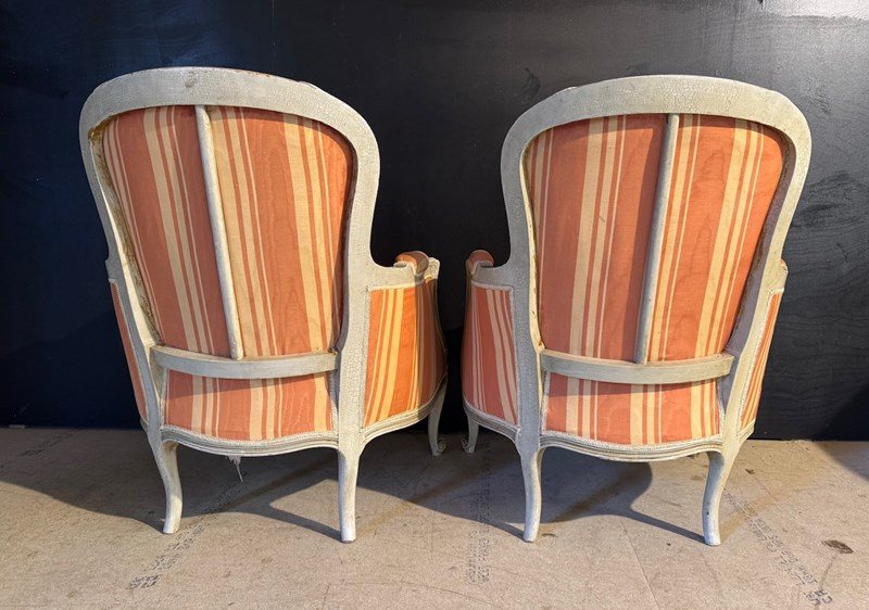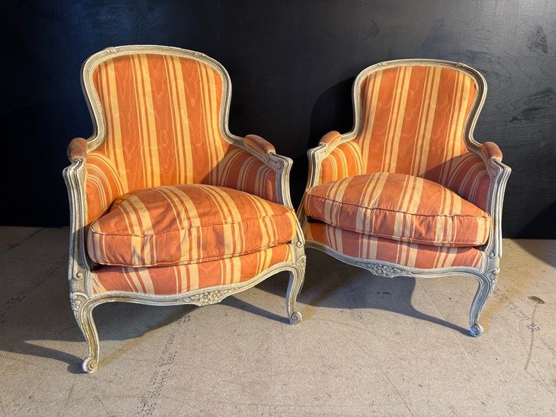 A nice pair of Comfortable Bergere Arm Chairs. The frames are strong and sturdy and retain their original finish. The upholstery is in good condition but of course you may wish to upholster in your choice of fabric.