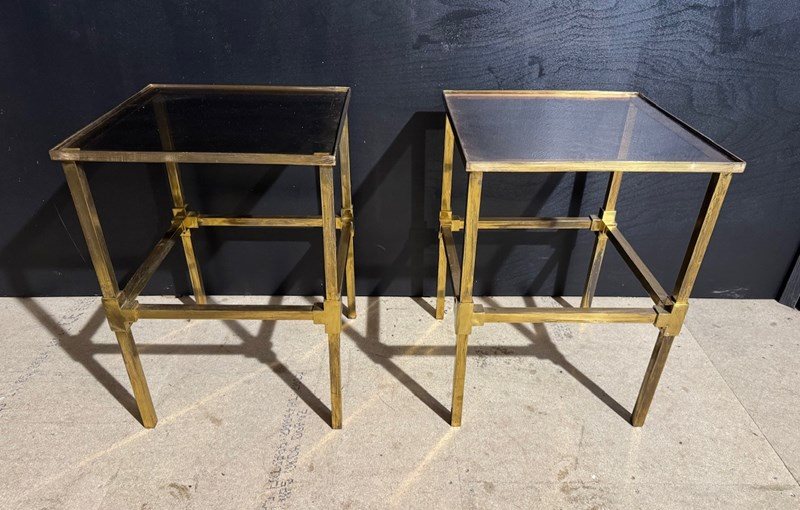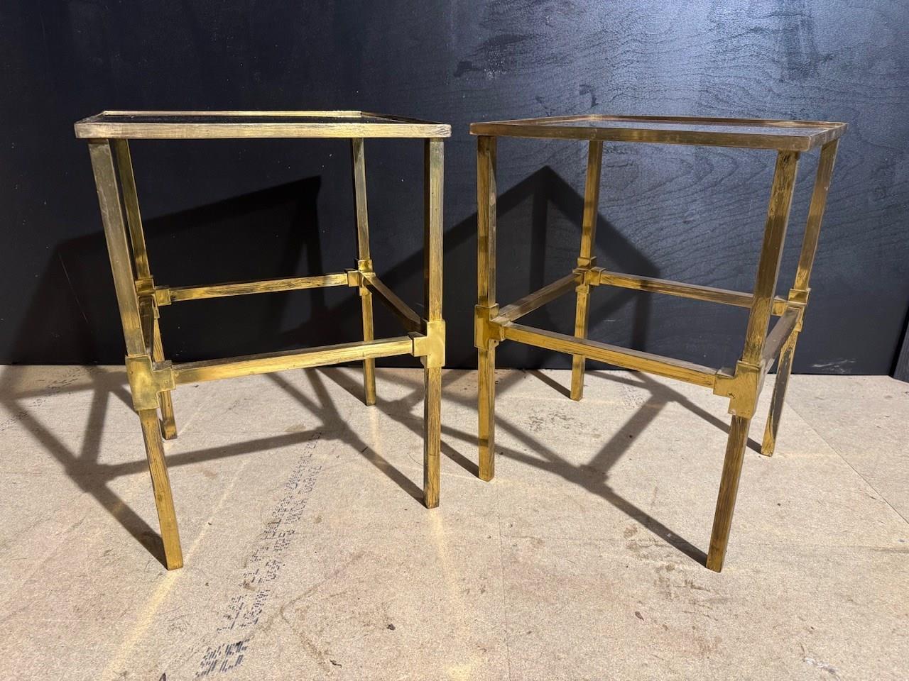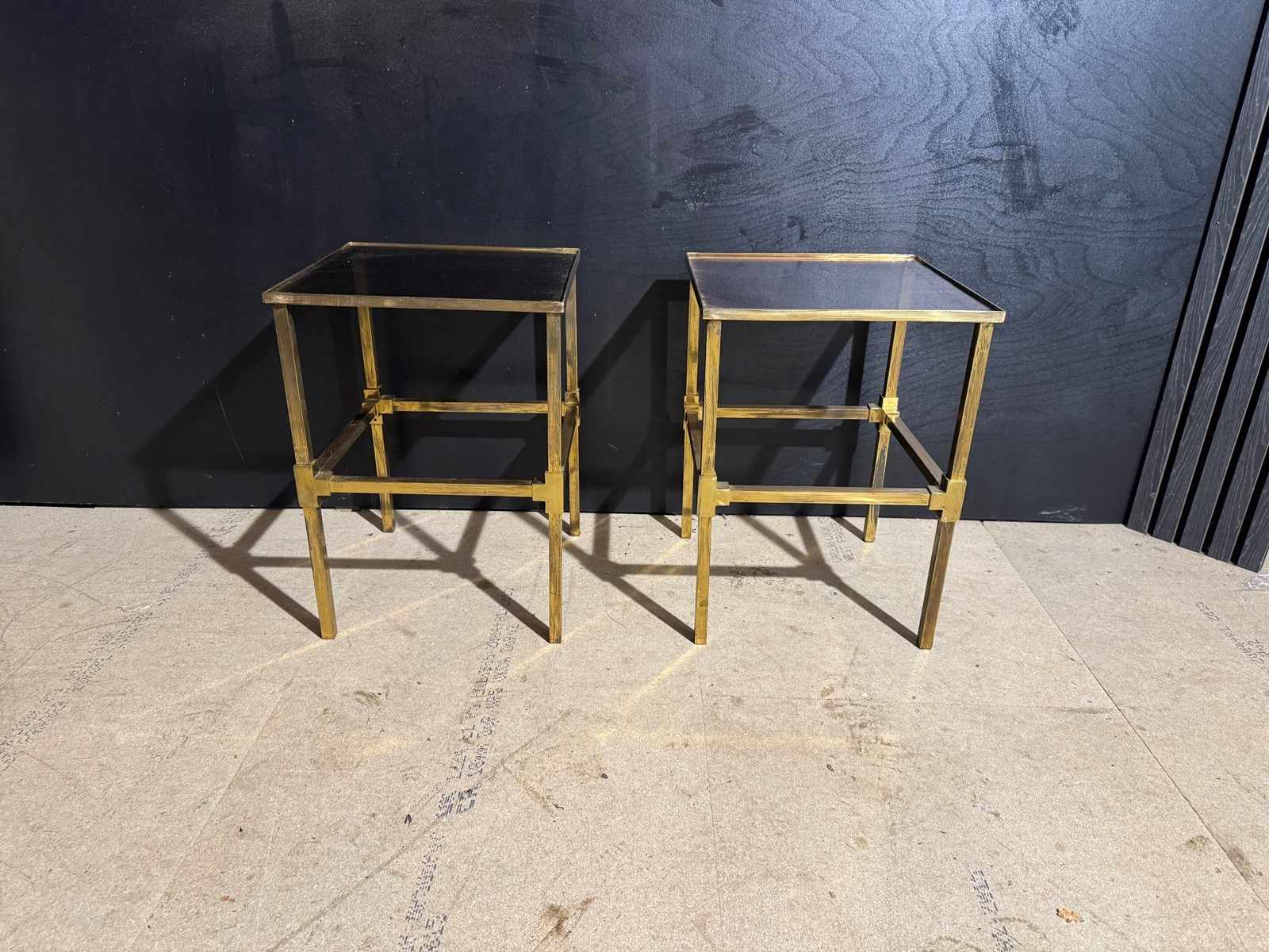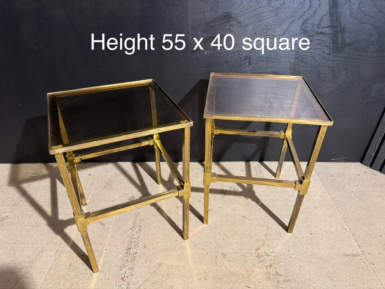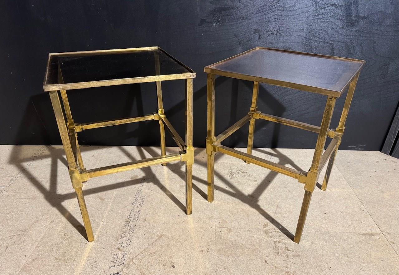 Very good quality pair of brass Lamp Tables with glass tops. They came from Paris and are in very good condition with just some age rubbing.