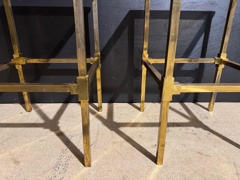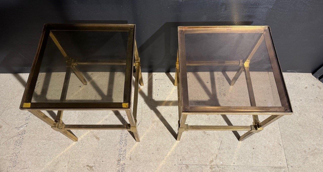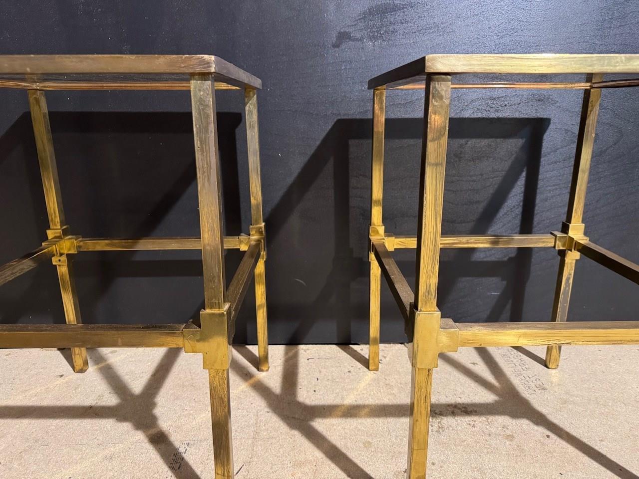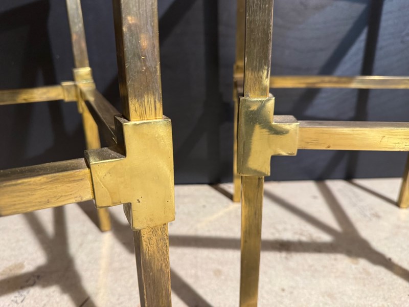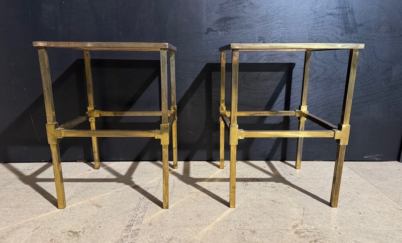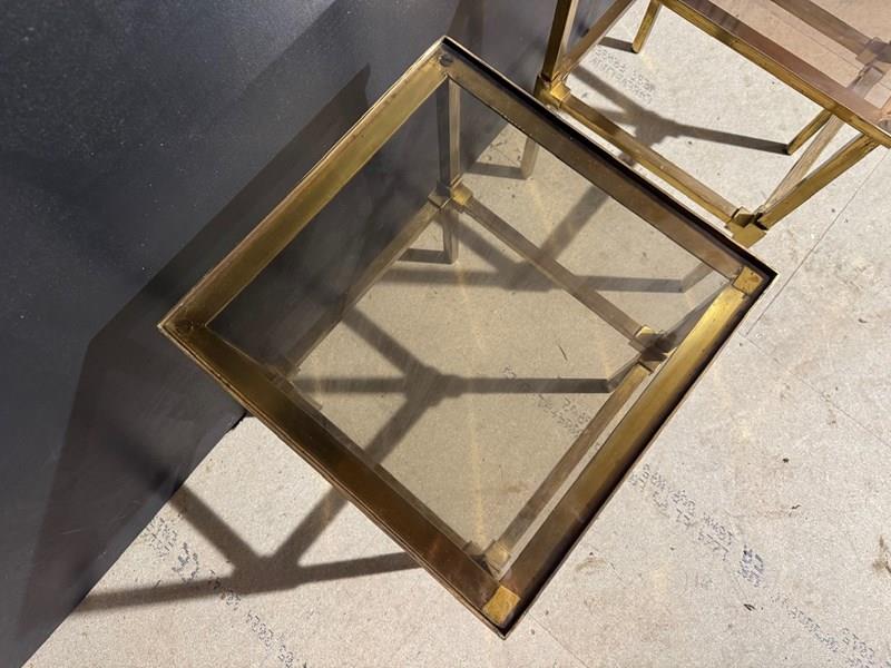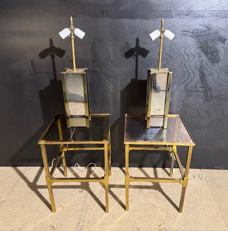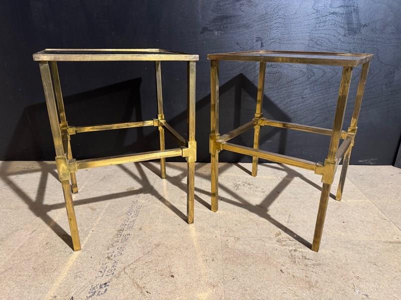 Very good quality pair of brass Lamp Tables with glass tops. They came from Paris and are in very good condition with just some age rubbing.