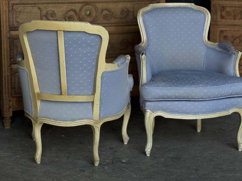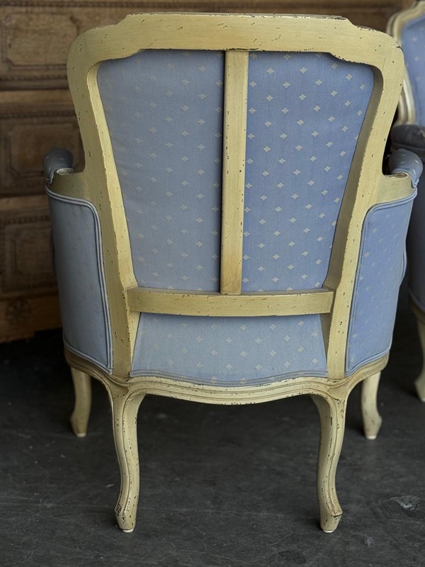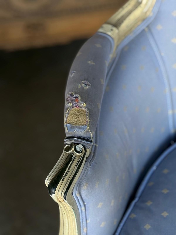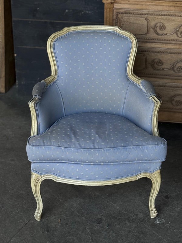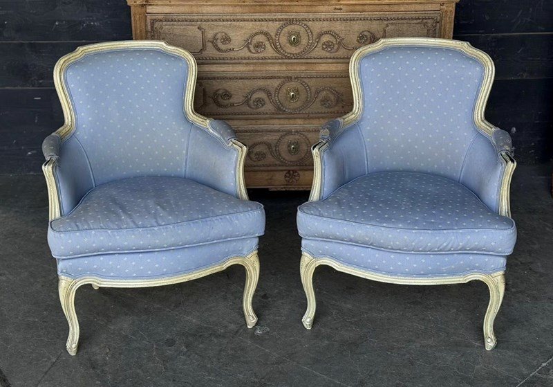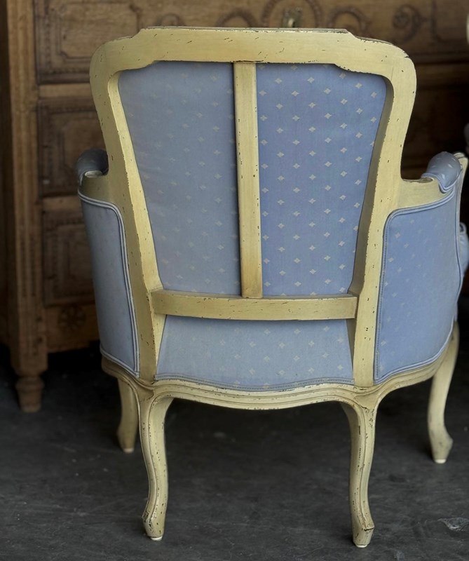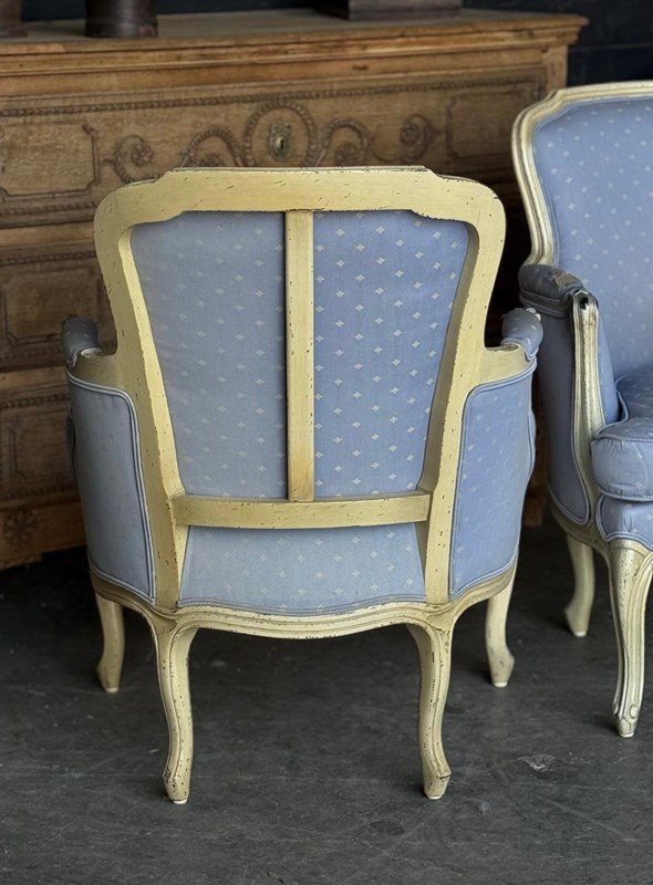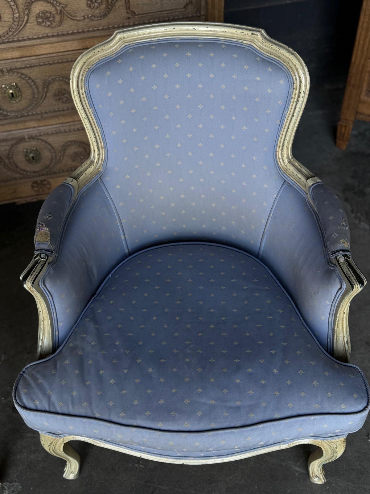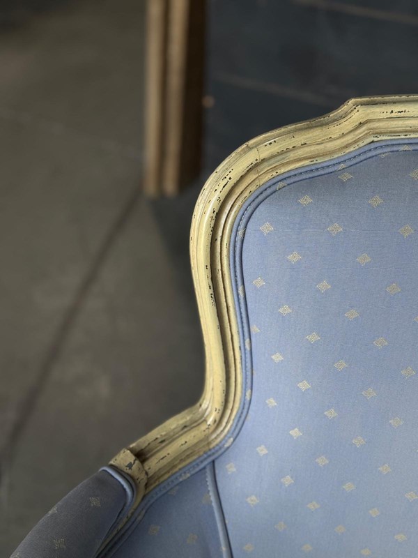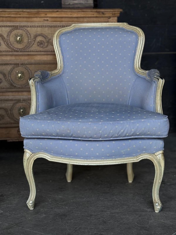 A pretty pair of French Bergere Upholstered Arm Chairs dating to around 1900. The frames are strong and sturdy and retain their original paint finish. The upholstery is perfectly usable (see hole in one arm in photo) but to be honest they are priced for you to be able to recover them in a fabric of your choice. The internal upholstery and springs are in good condition.