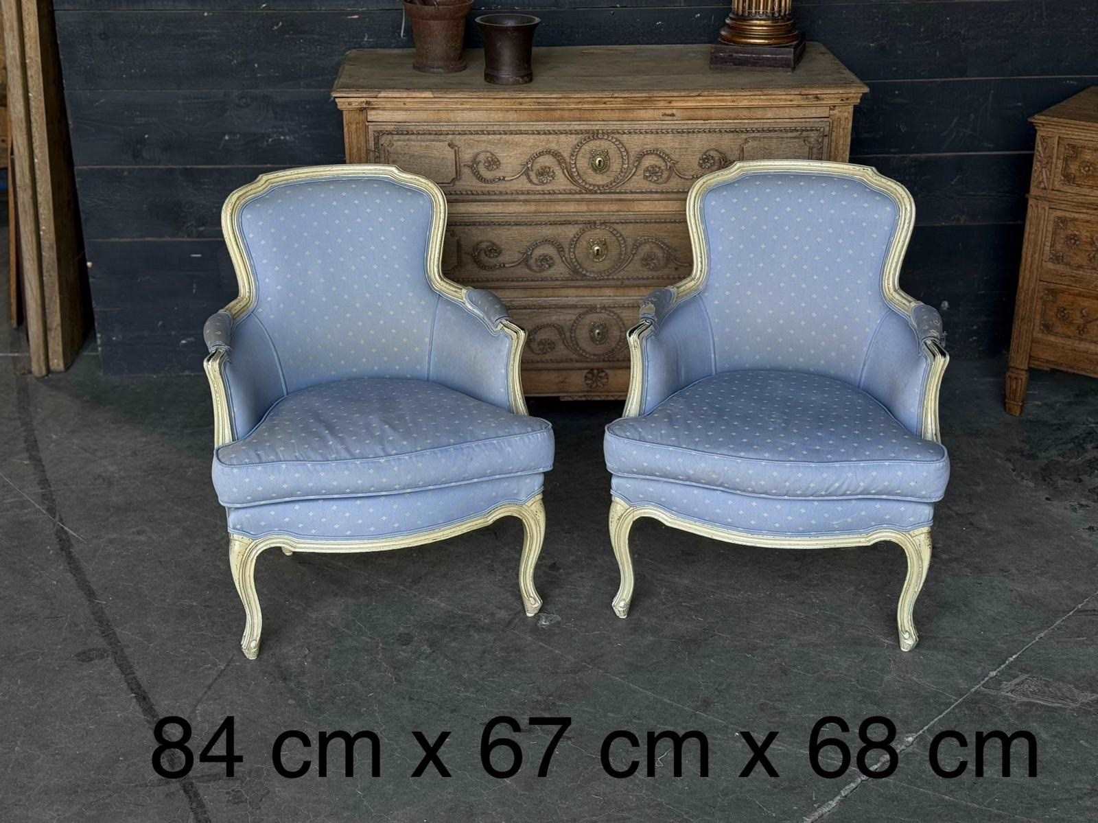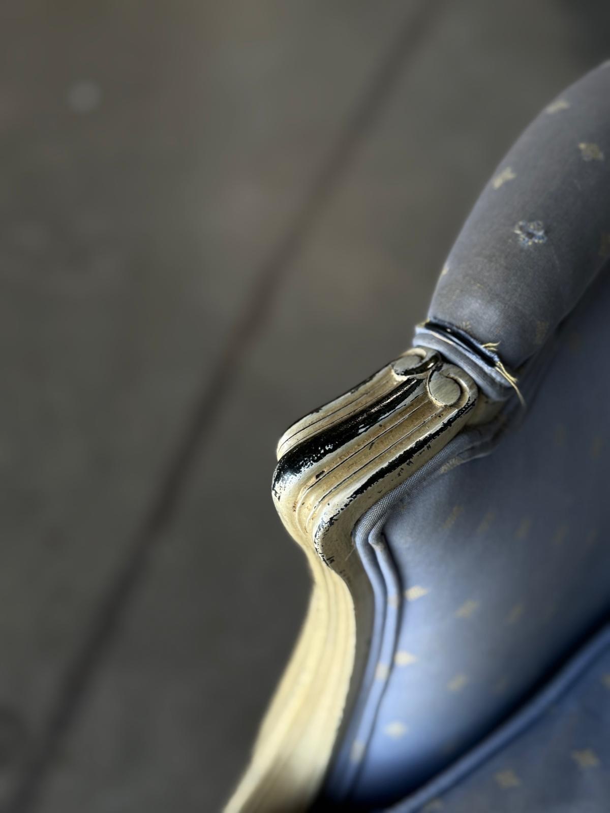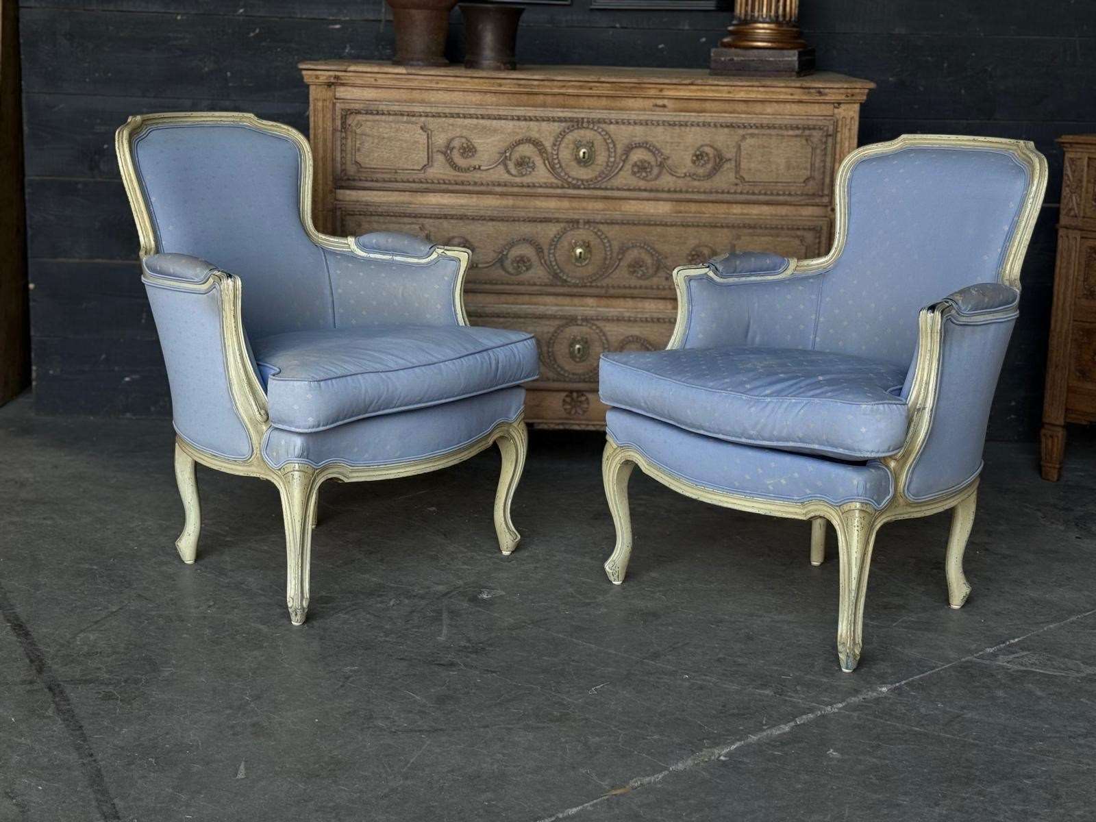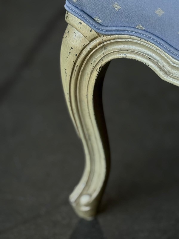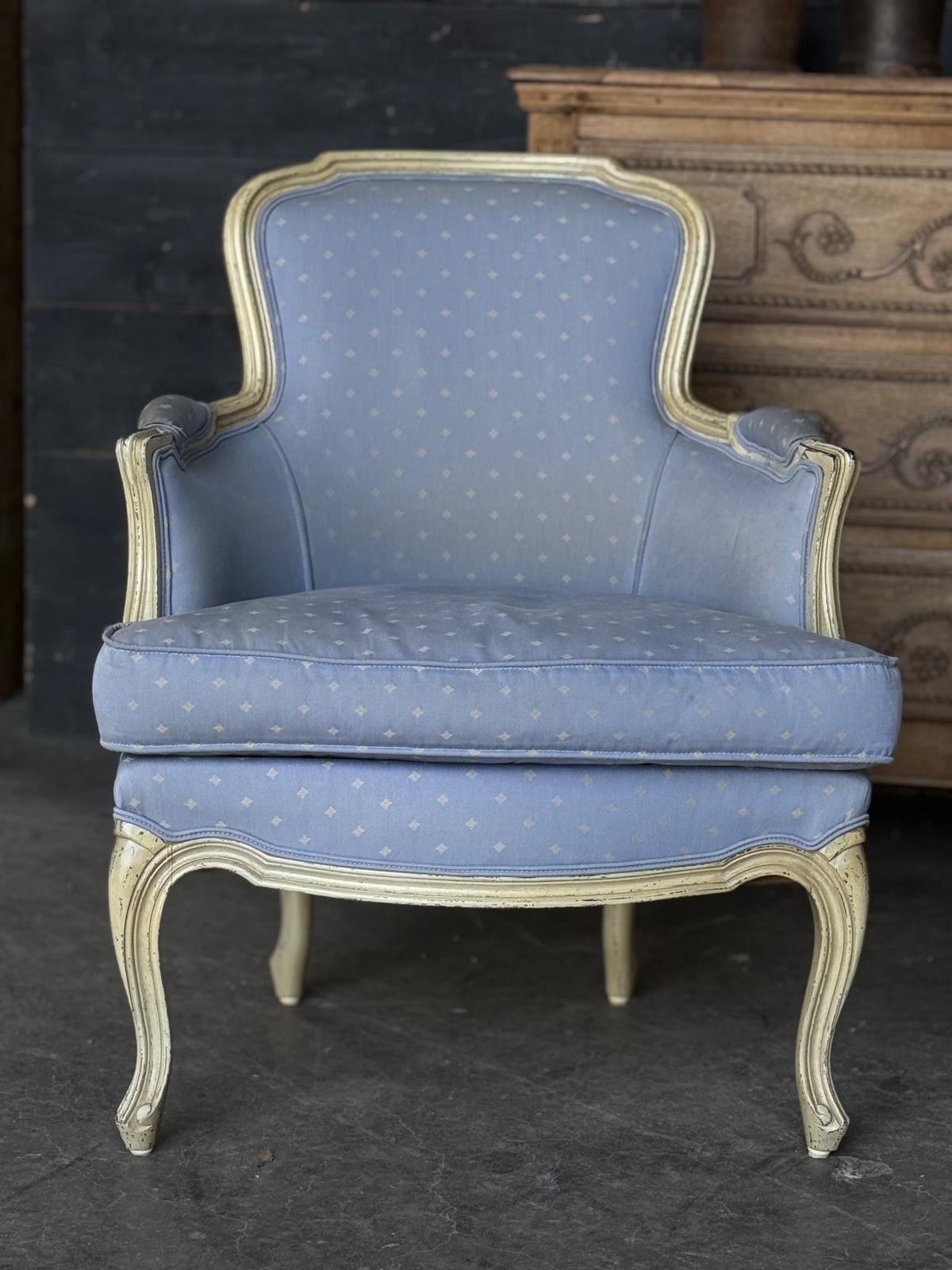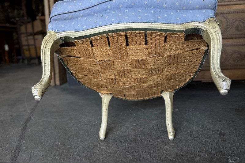 A pretty pair of French Bergere Upholstered Arm Chairs dating to around 1900. The frames are strong and sturdy and retain their original paint finish. The upholstery is perfectly usable (see hole in one arm in photo) but to be honest they are priced for you to be able to recover them in a fabric of your choice. The internal upholstery and springs are in good condition.