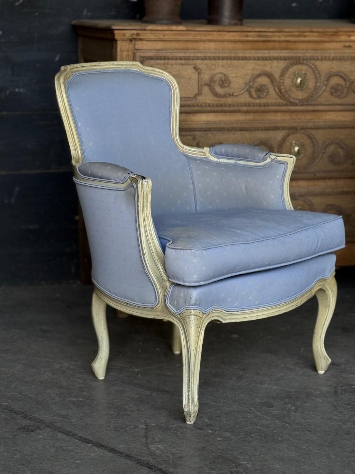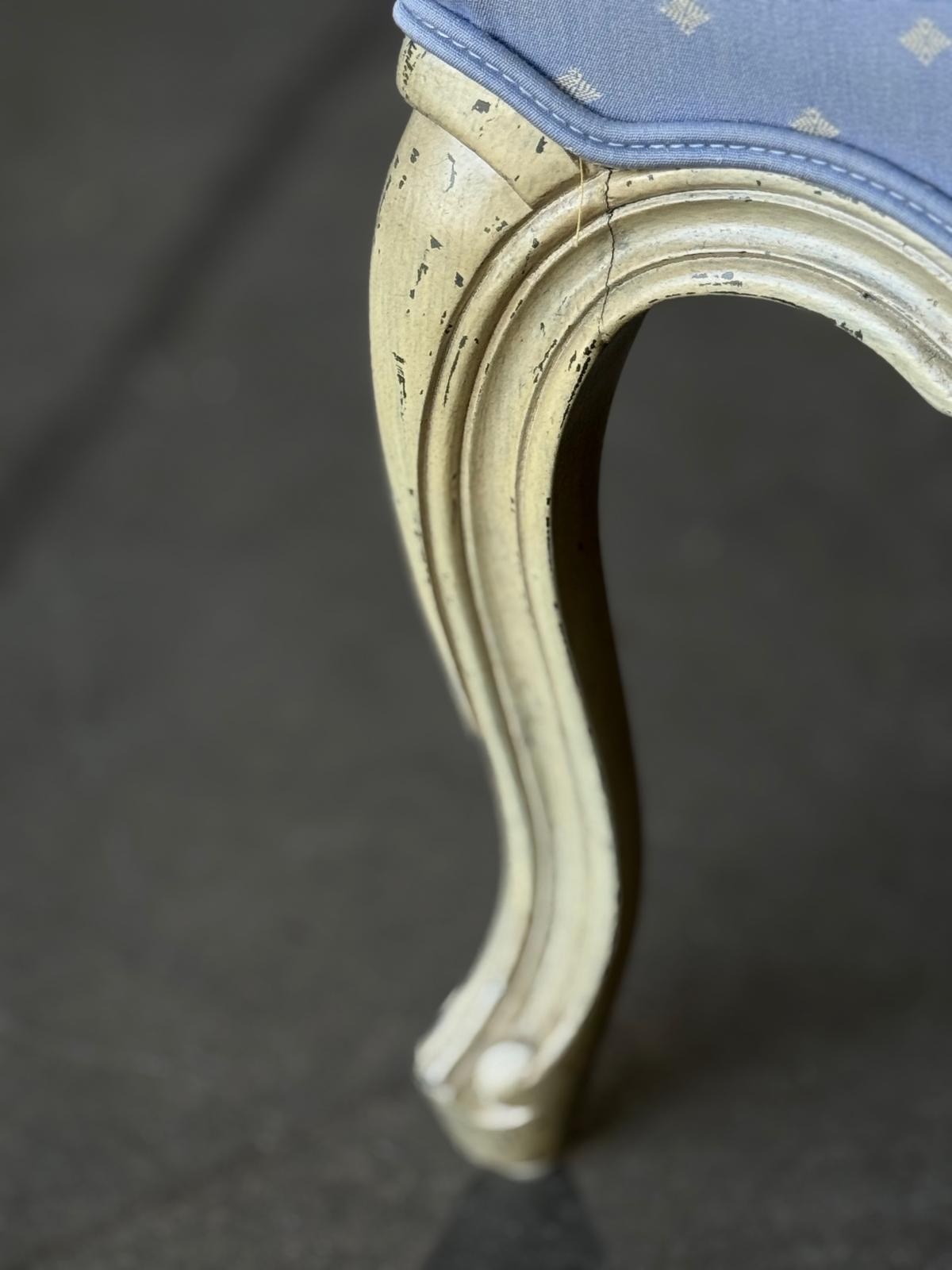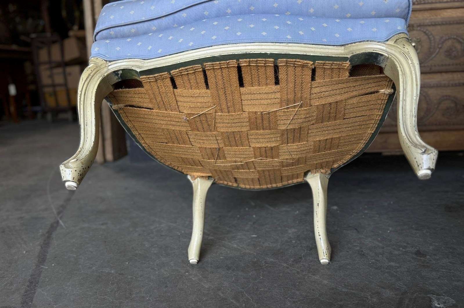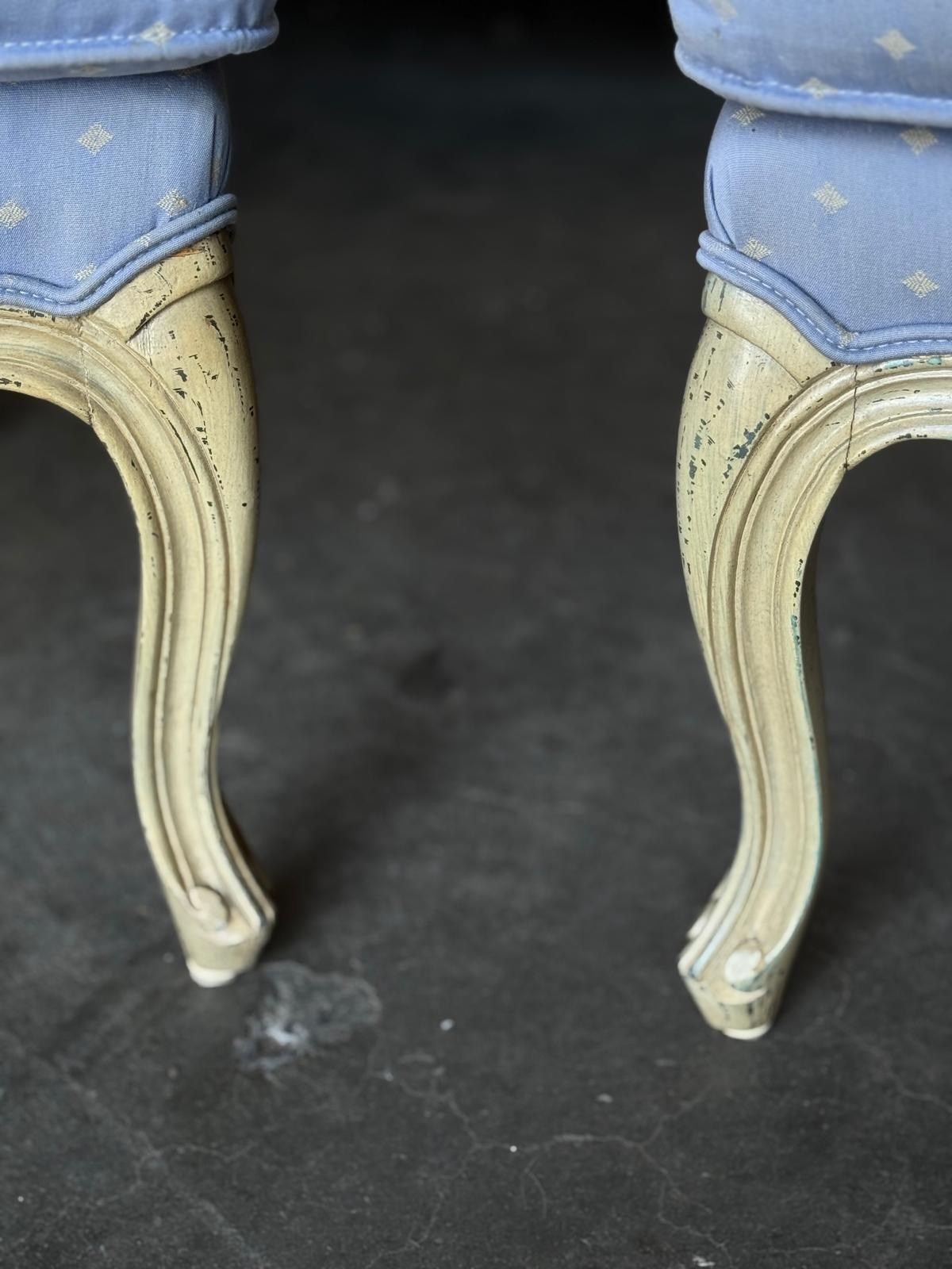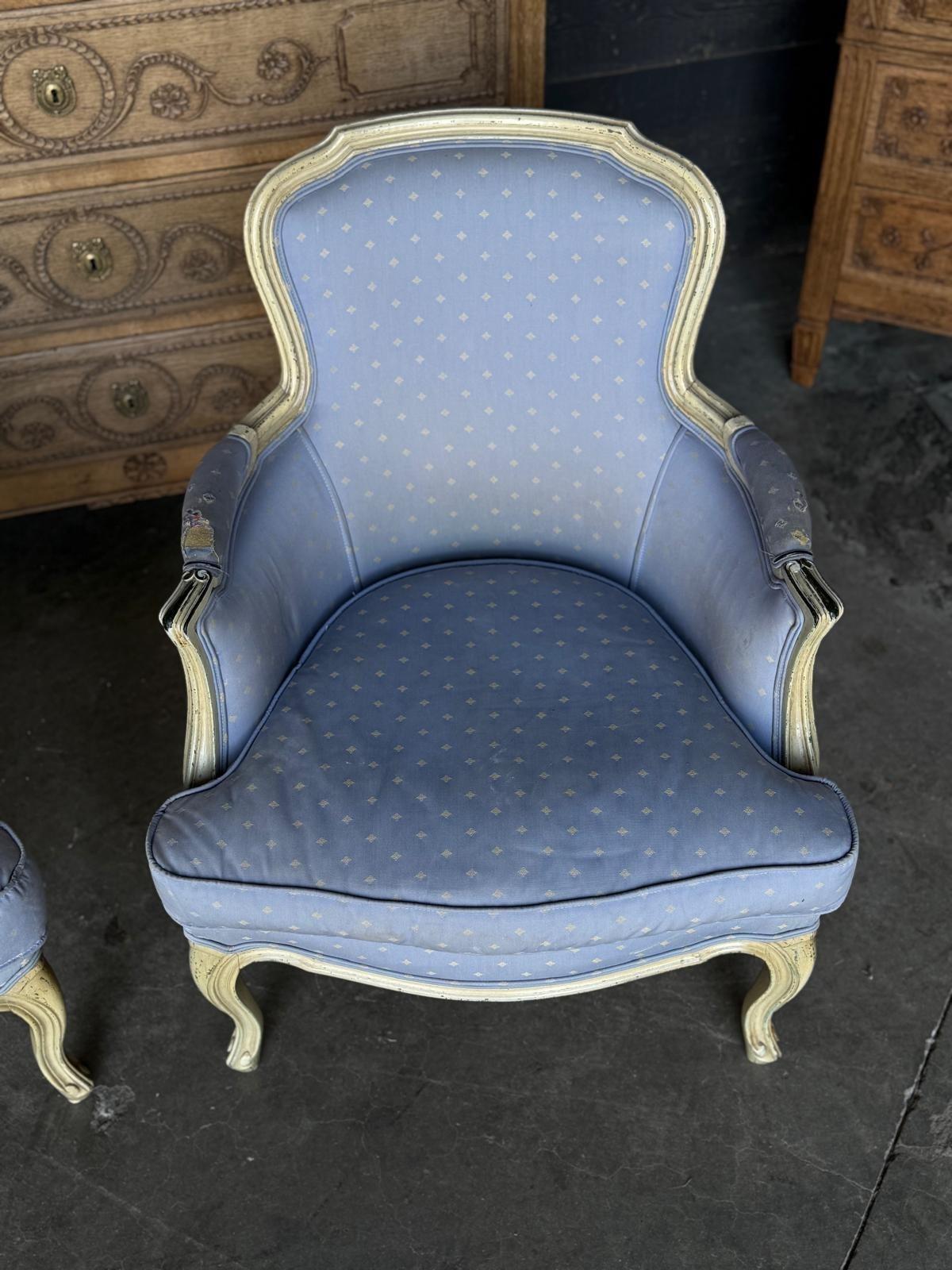 A pretty pair of French Bergere Upholstered Arm Chairs dating to around 1900. The frames are strong and sturdy and retain their original paint finish. The upholstery is perfectly usable (see hole in one arm in photo) but to be honest they are priced for you to be able to recover them in a fabric of your choice. The internal upholstery and springs are in good condition.