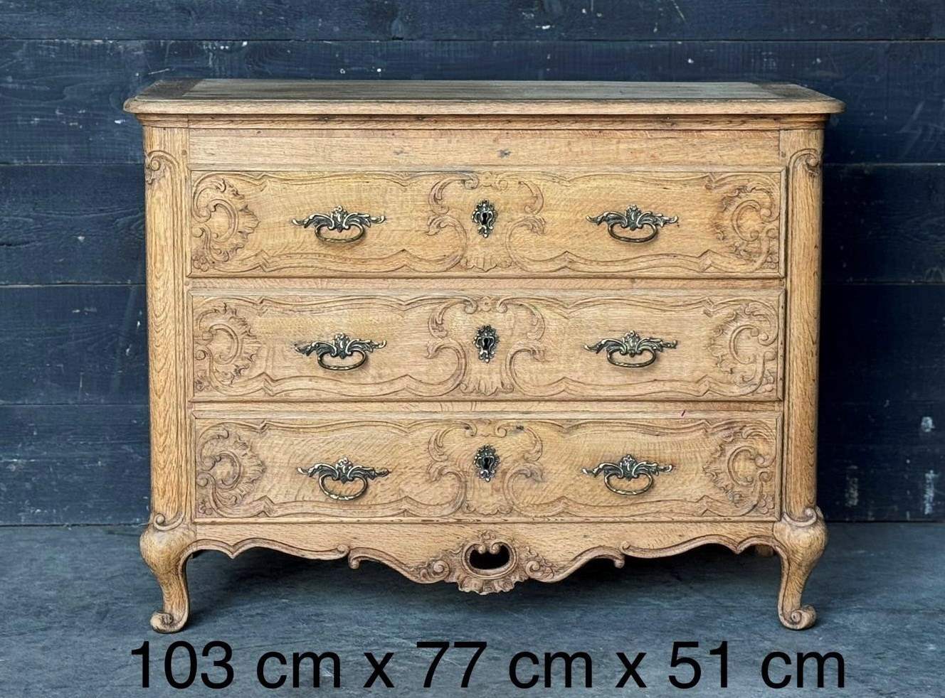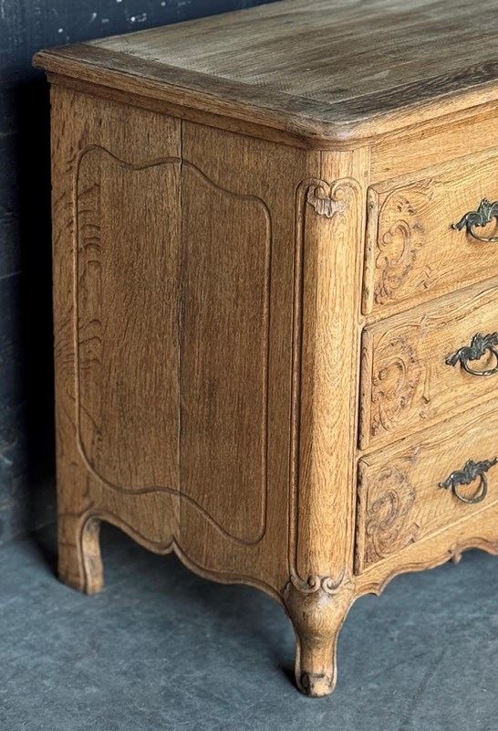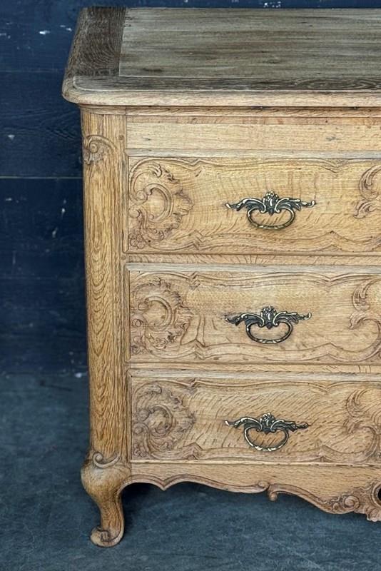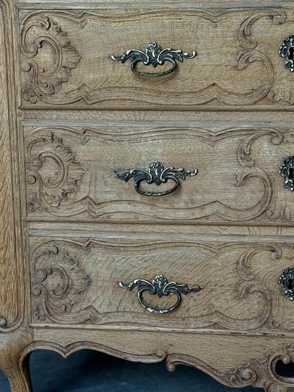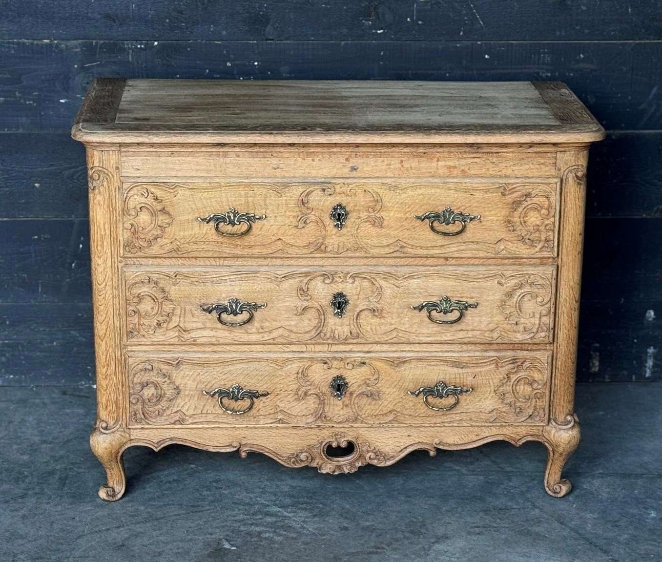 A delightful French Commode Chest of Drawers, made from Oak and dating to around 1900. The 3 drawers run smoothly, very pretty carved detailing and original handles. Of good quality construction we have bleached it for a lighter look. In overall excellent original condition for the home.