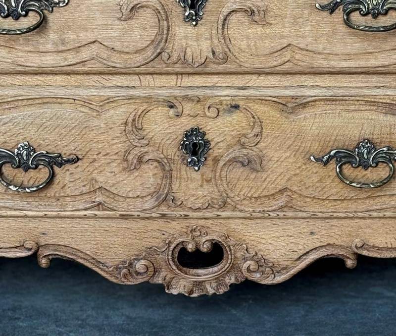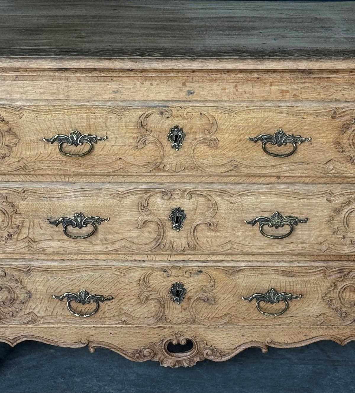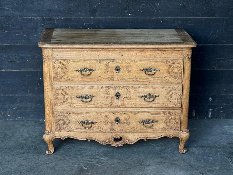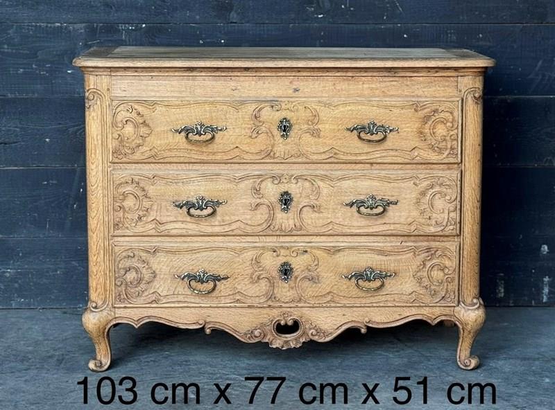 A delightful French Commode Chest of Drawers, made from Oak and dating to around 1900. The 3 drawers run smoothly, very pretty carved detailing and original handles. Of good quality construction we have bleached it for a lighter look. In overall excellent original condition for the home.