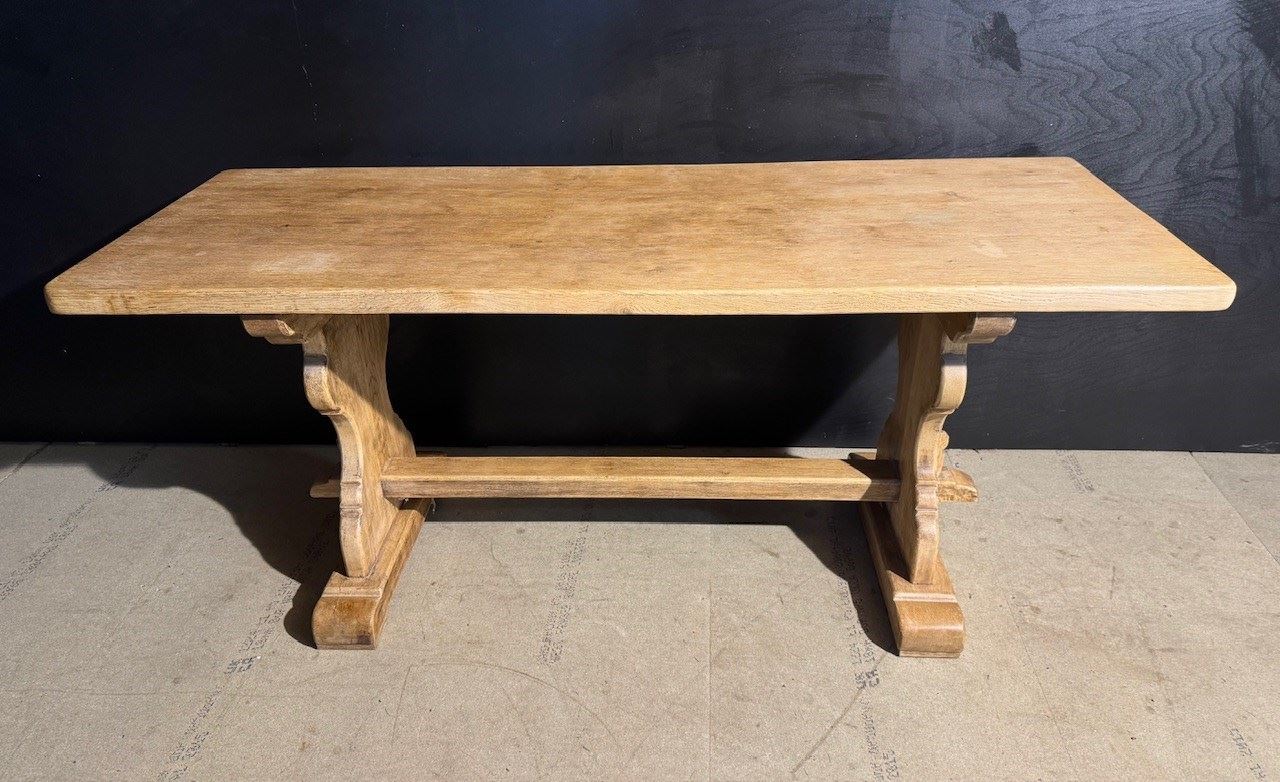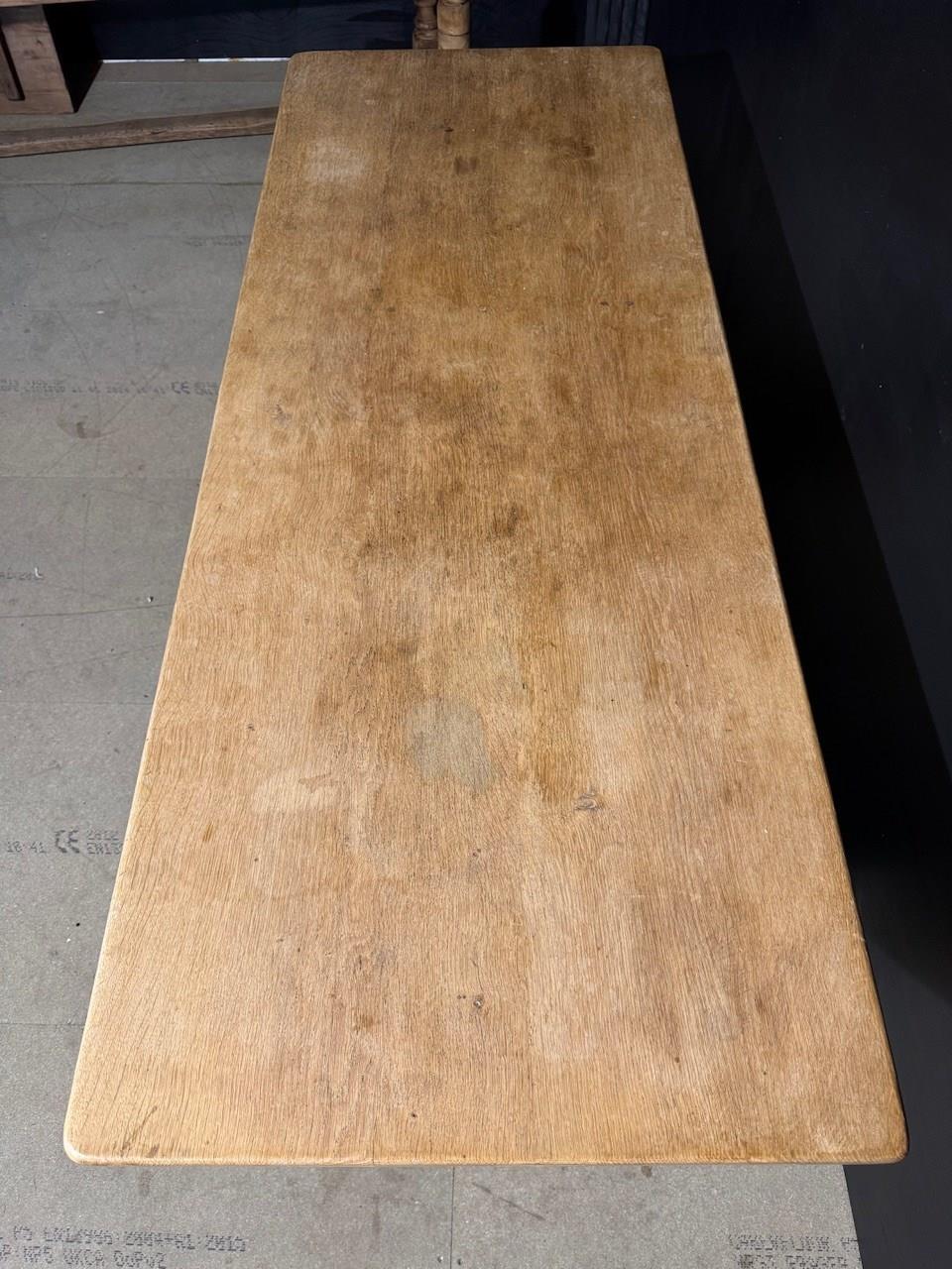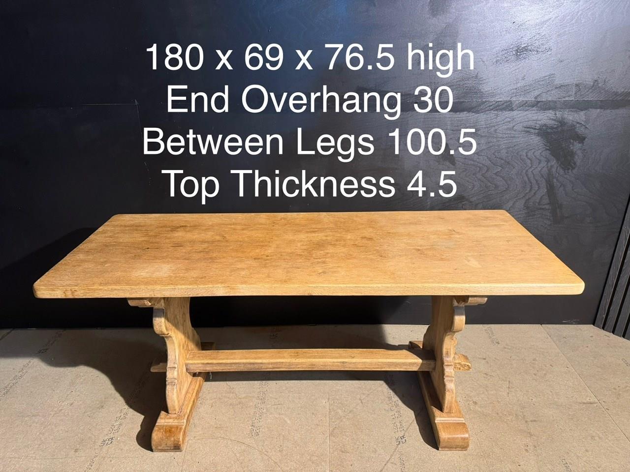 A good quality French Solid Oak Farmhouse Dining Table with slightly smaller proportions than usual. We have bleached it for a lighter look and on overall excellent original condition for the home. Height 76.5 cm Length 180 cm Depth 69 cm Between Legs 100.5 cm Top Thickness 4.5 cm End Overhang 30 cm