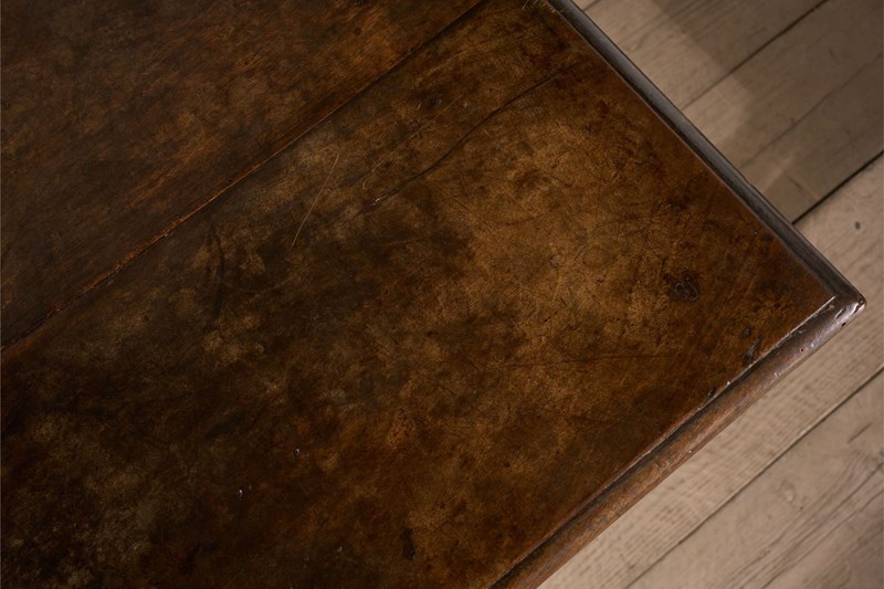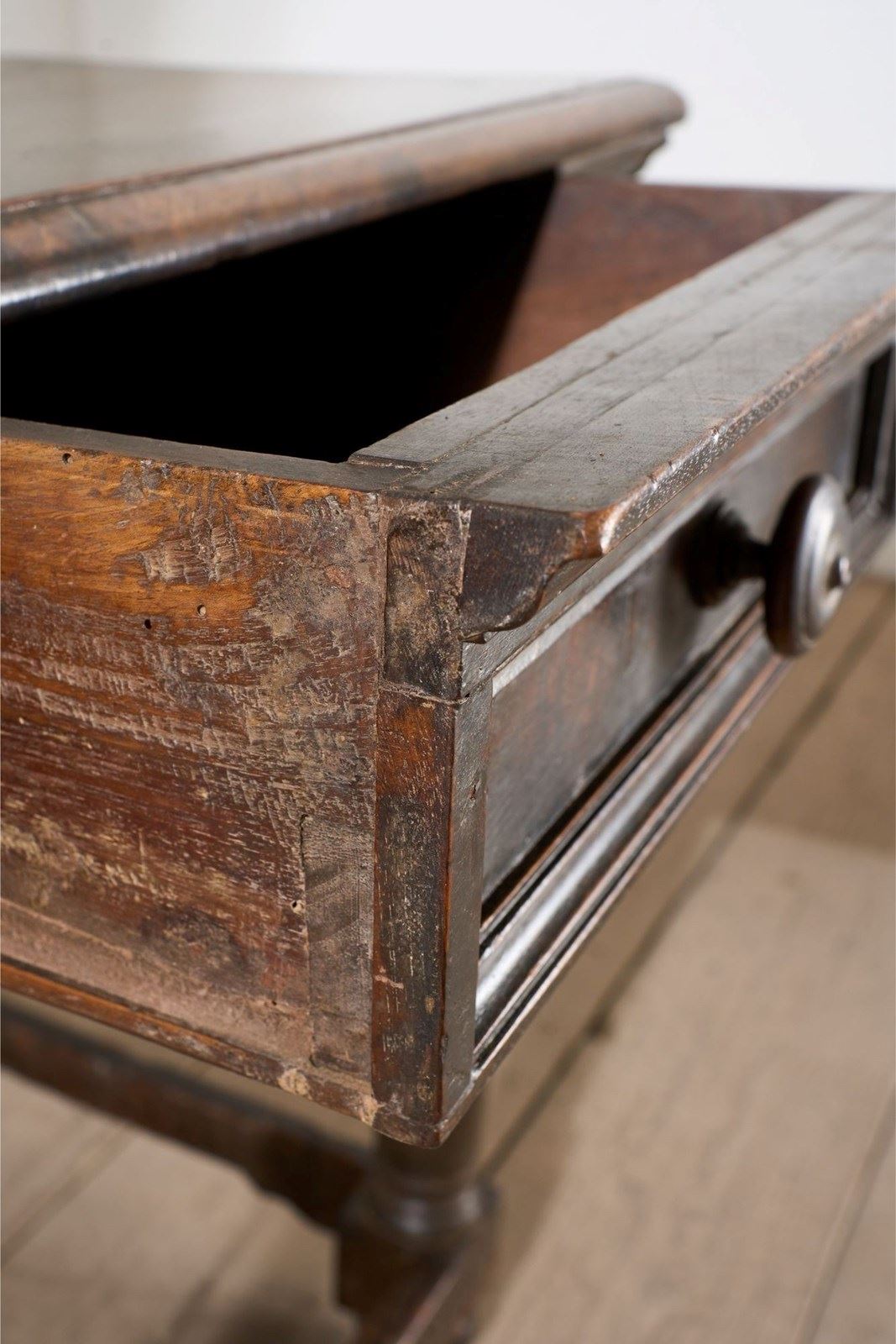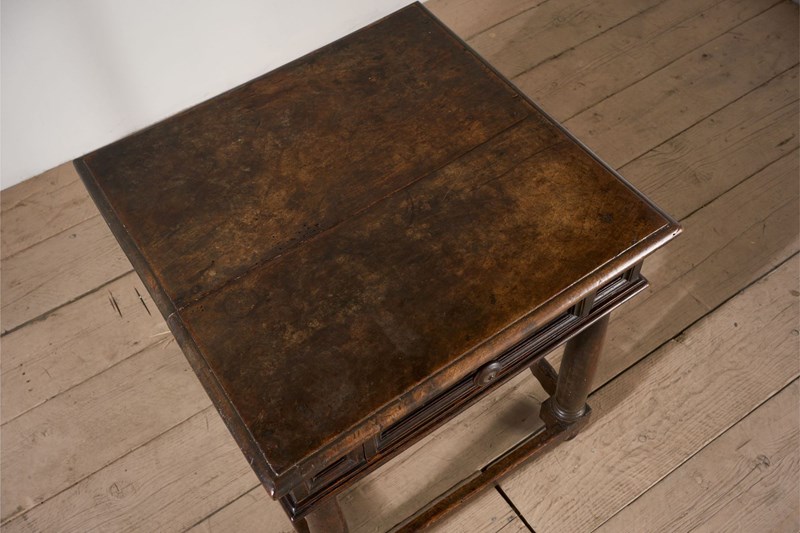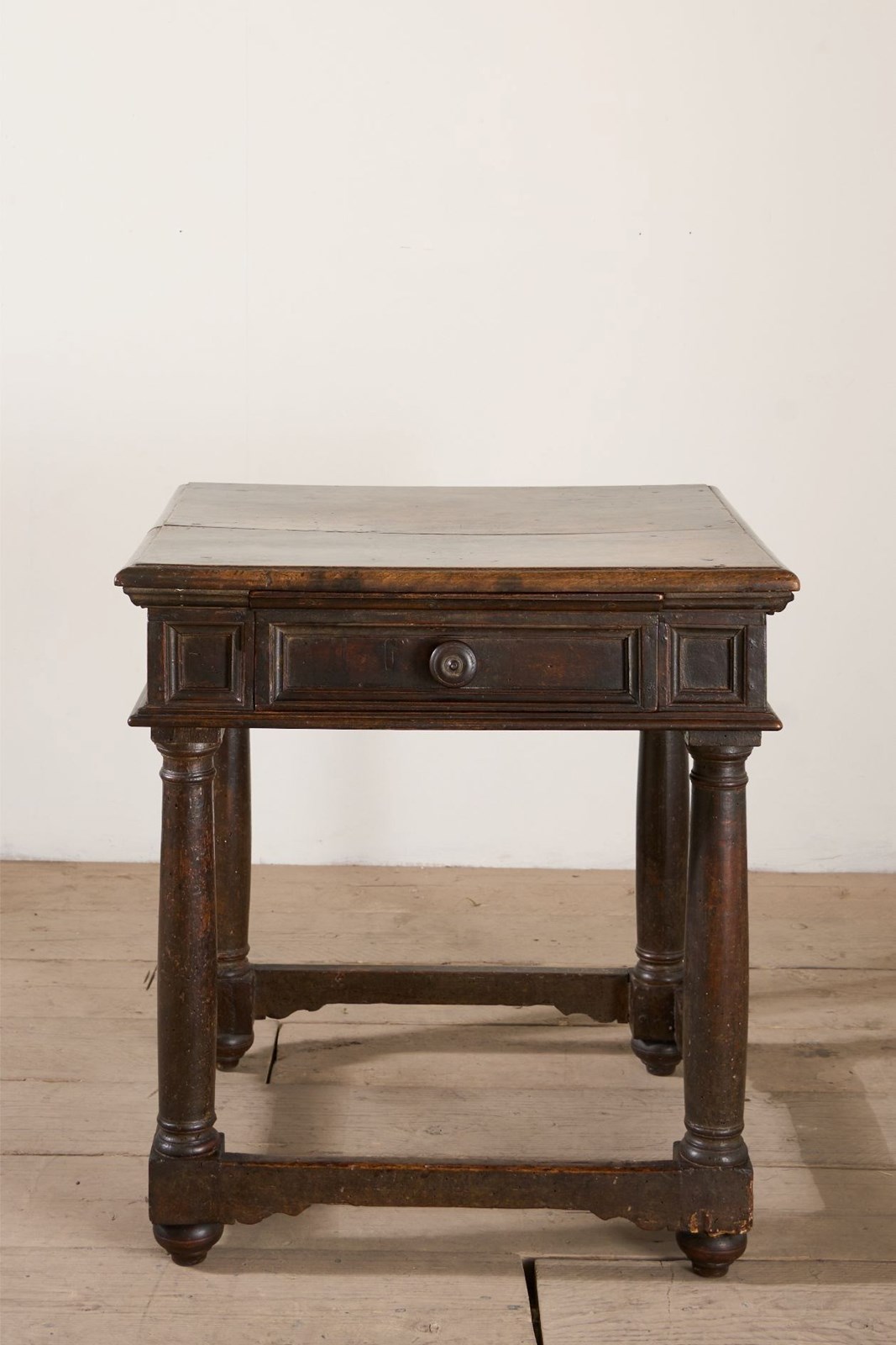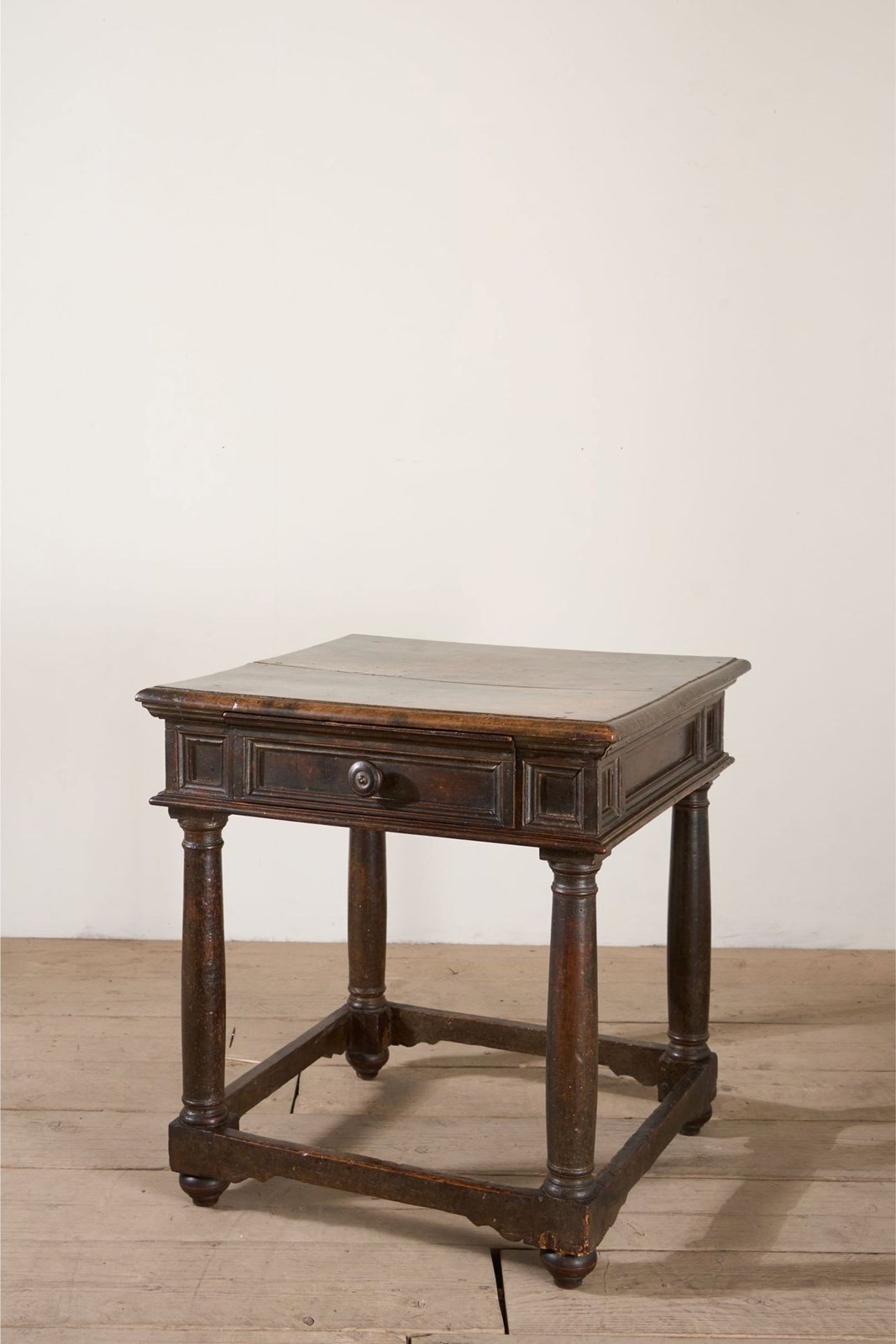 This is a stunning all original 17th century walnut square side table. The patina to the top is gorgeous and continues throughout the piece. It has a single deep drawer to hide away clutter and a tactile well used drawer pull. The stretchers shows signs of historic worm but all treated now. Solid overall condition and the colour is very special. On the back of the drawer is a Parisian antique dealers label from the 1940's which I have left in place as feels a nice touch.