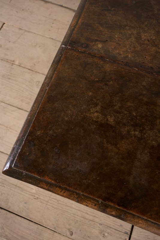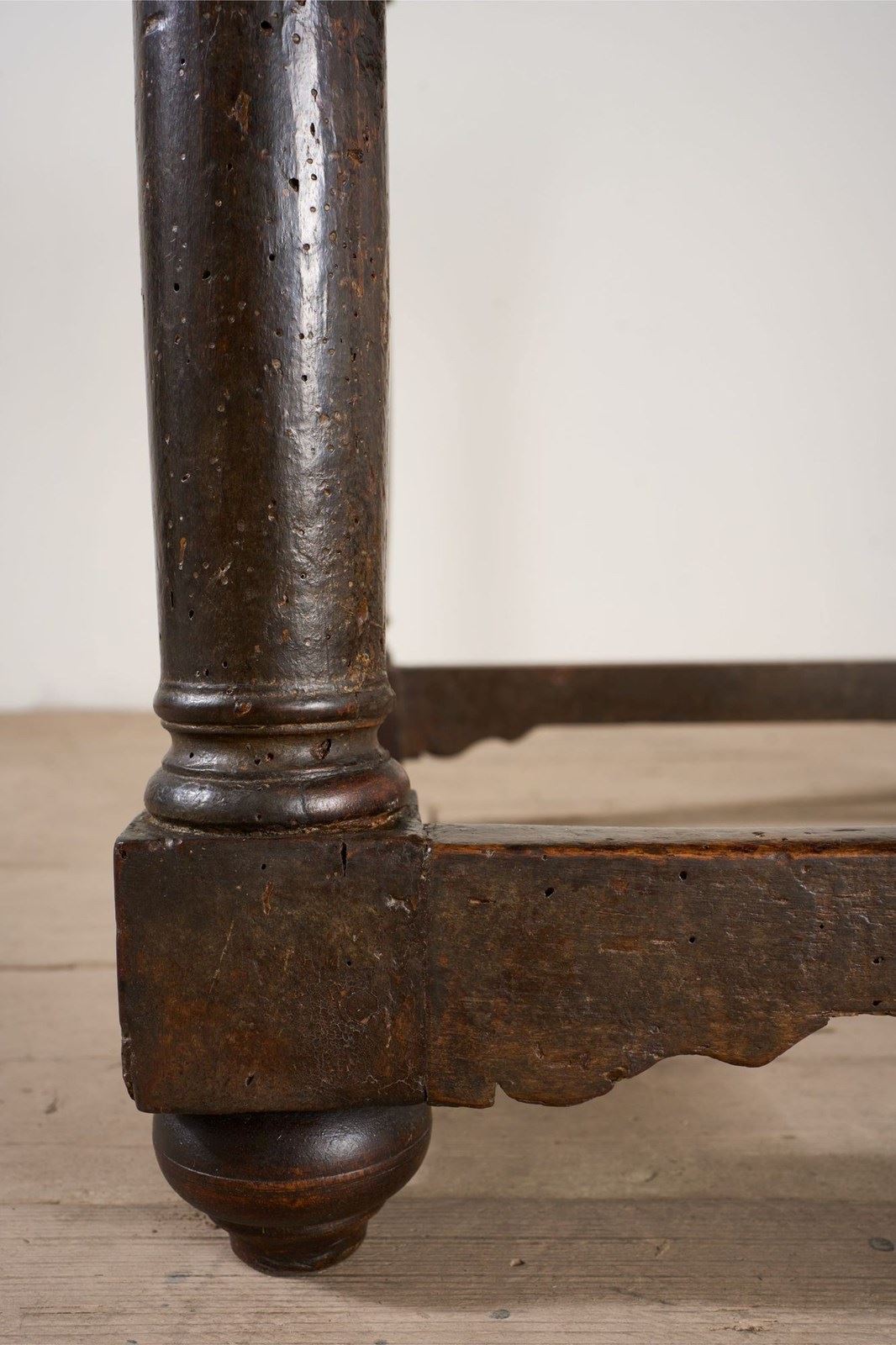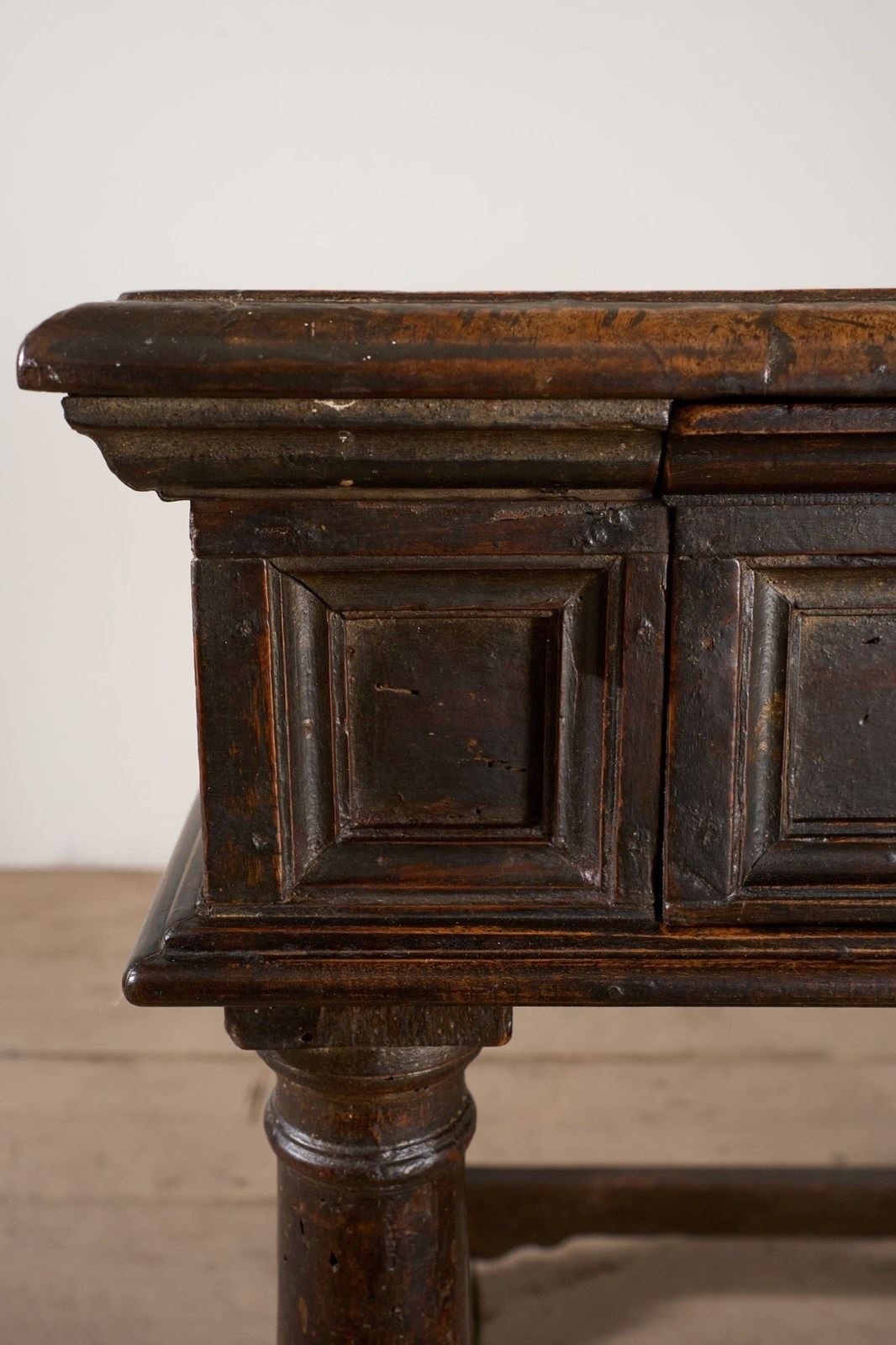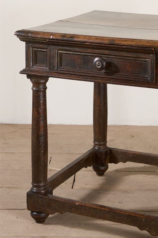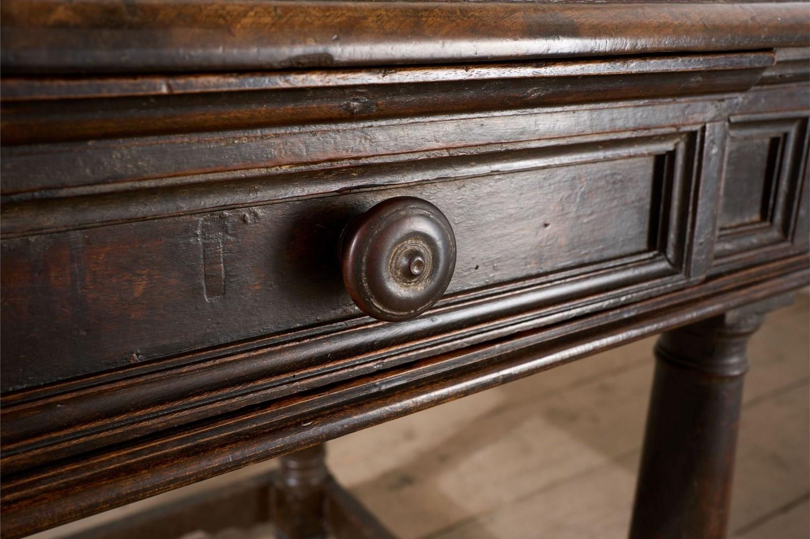 This is a stunning all original 17th century walnut square side table. The patina to the top is gorgeous and continues throughout the piece. It has a single deep drawer to hide away clutter and a tactile well used drawer pull. The stretchers shows signs of historic worm but all treated now. Solid overall condition and the colour is very special. On the back of the drawer is a Parisian antique dealers label from the 1940's which I have left in place as feels a nice touch.