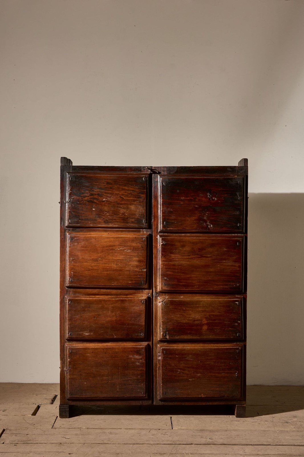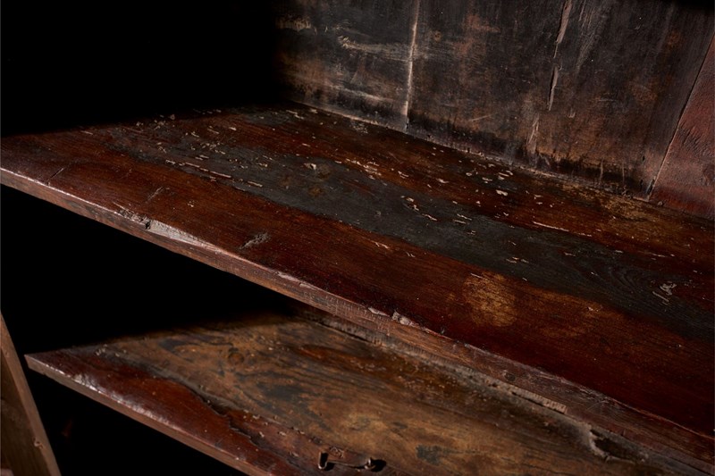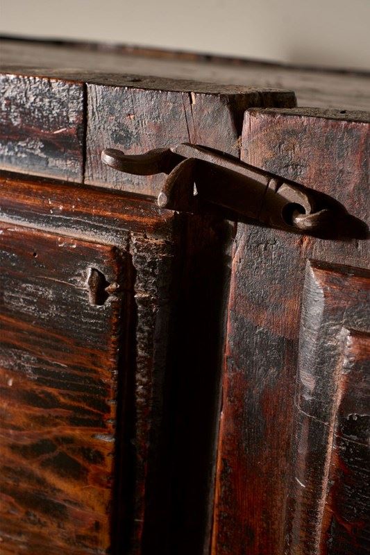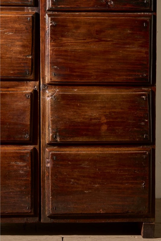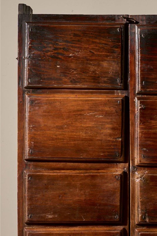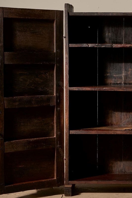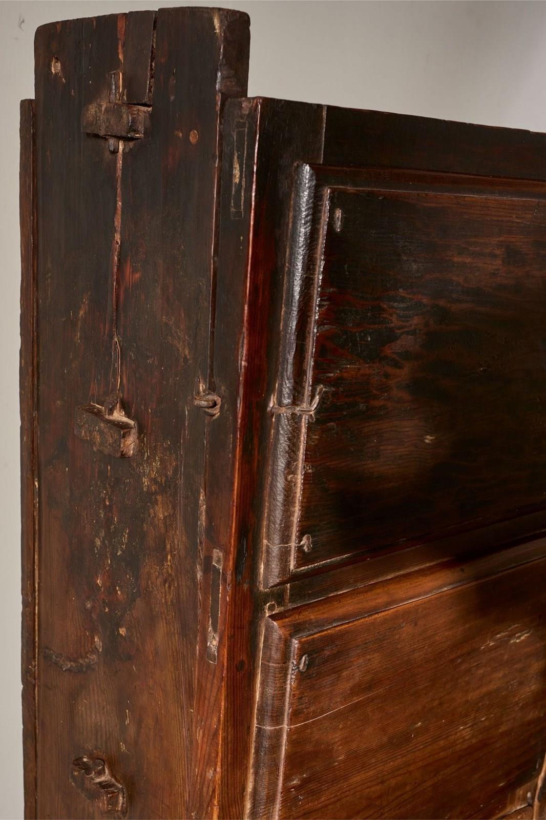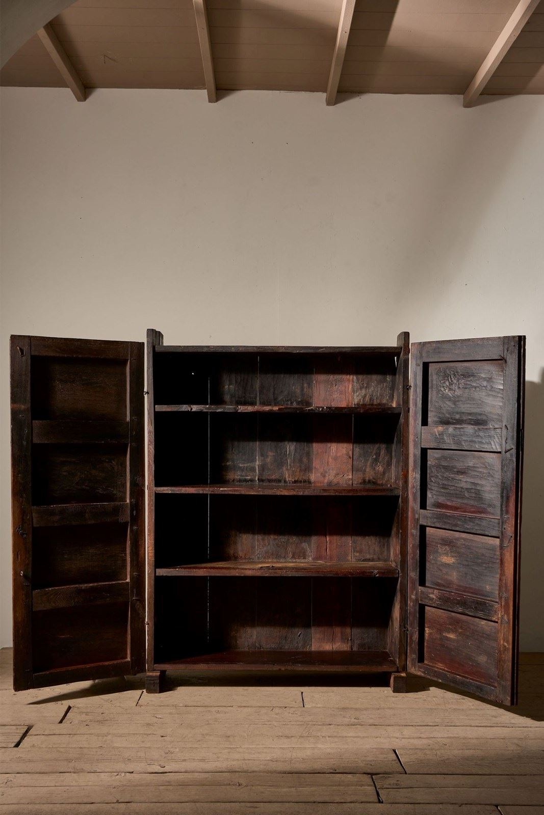 This is a truly rare piece of French vernacular furniture. This cupboard is 18th century and made of chestnut , which suggests this piece probably originates from the Dordogne region in France. This example has two doors opening to a shelved interior, the doors have a bold geometric design which gives the cupboard a contemporary look and is why I love these mountain cupboards. An unusual contrast you rarely see. All over great proportions, stunning patina and just a honest feel about.