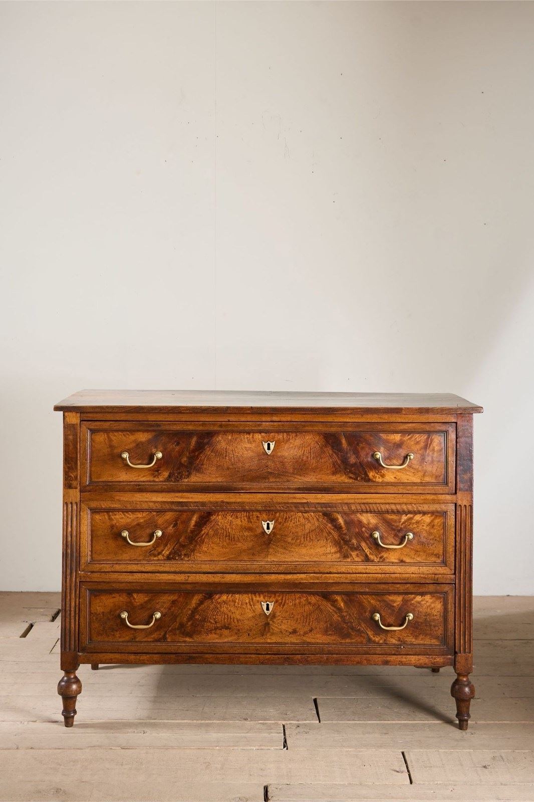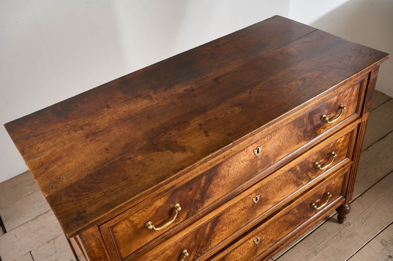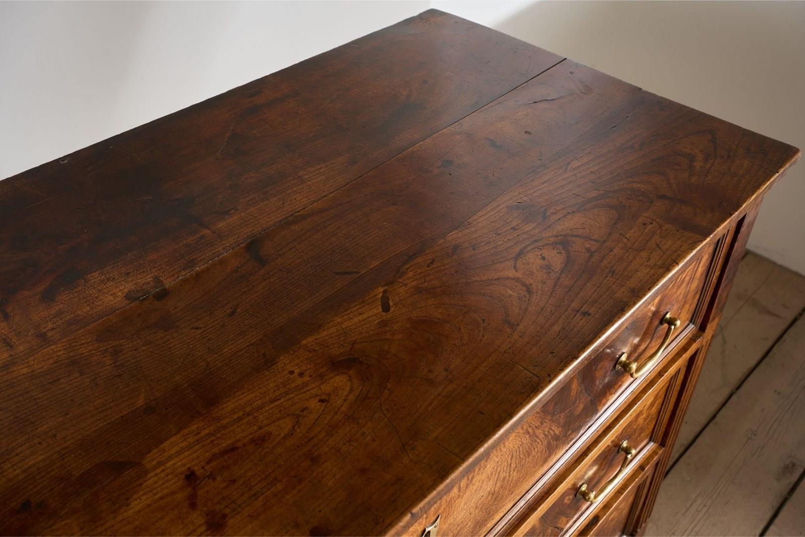 This is a fabulous 18th century Chest of drawers. Made from walnut with and elm top. The colour is delicious and has such a wonderful warmth to it. The patina all over is superb and the quality is very impressive. The base being walnut has great figuring and the design with reeded sides and carved feet make this extremely elegant. There are also panels of elm on the front and the sides which is a lovely touch. Deep elm lined drawers and heavy brass handles reinforce the quality of the piece. The top is elm and the patina really sets the piece apart from others. No serious faults and the drawers run well.