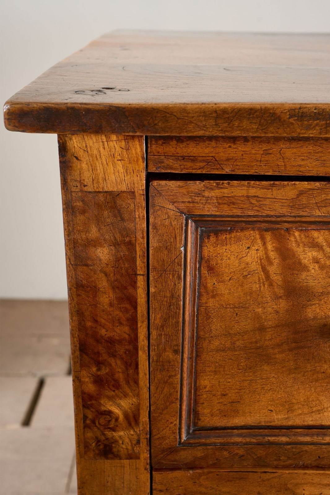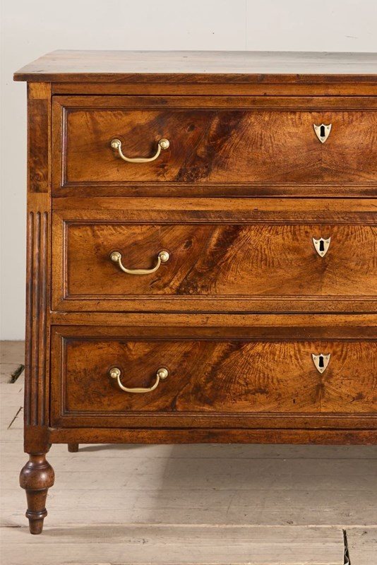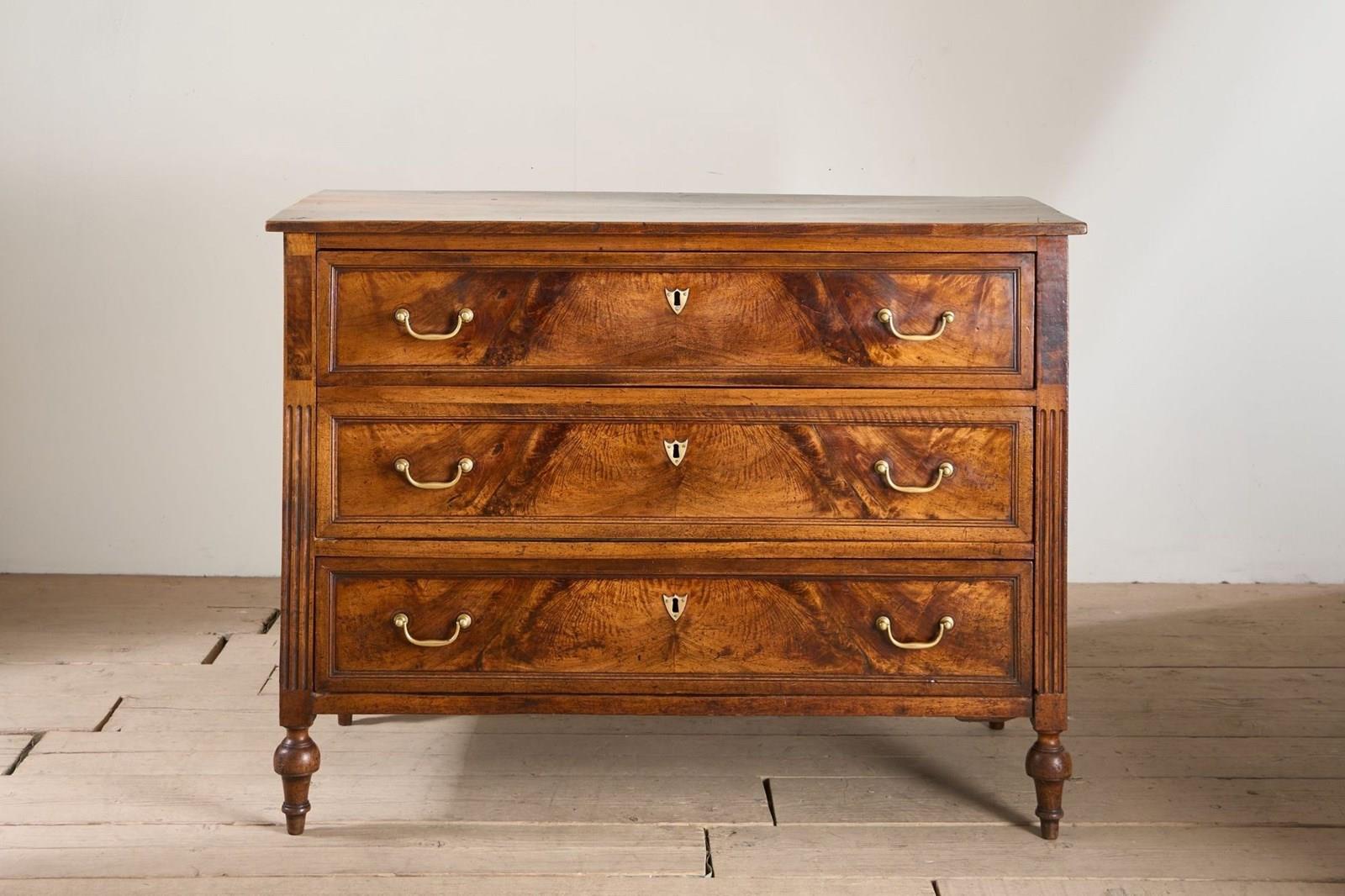 This is a fabulous 18th century Chest of drawers. Made from walnut with and elm top. The colour is delicious and has such a wonderful warmth to it. The patina all over is superb and the quality is very impressive. The base being walnut has great figuring and the design with reeded sides and carved feet make this extremely elegant. There are also panels of elm on the front and the sides which is a lovely touch. Deep elm lined drawers and heavy brass handles reinforce the quality of the piece. The top is elm and the patina really sets the piece apart from others. No serious faults and the drawers run well.