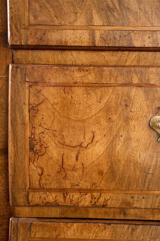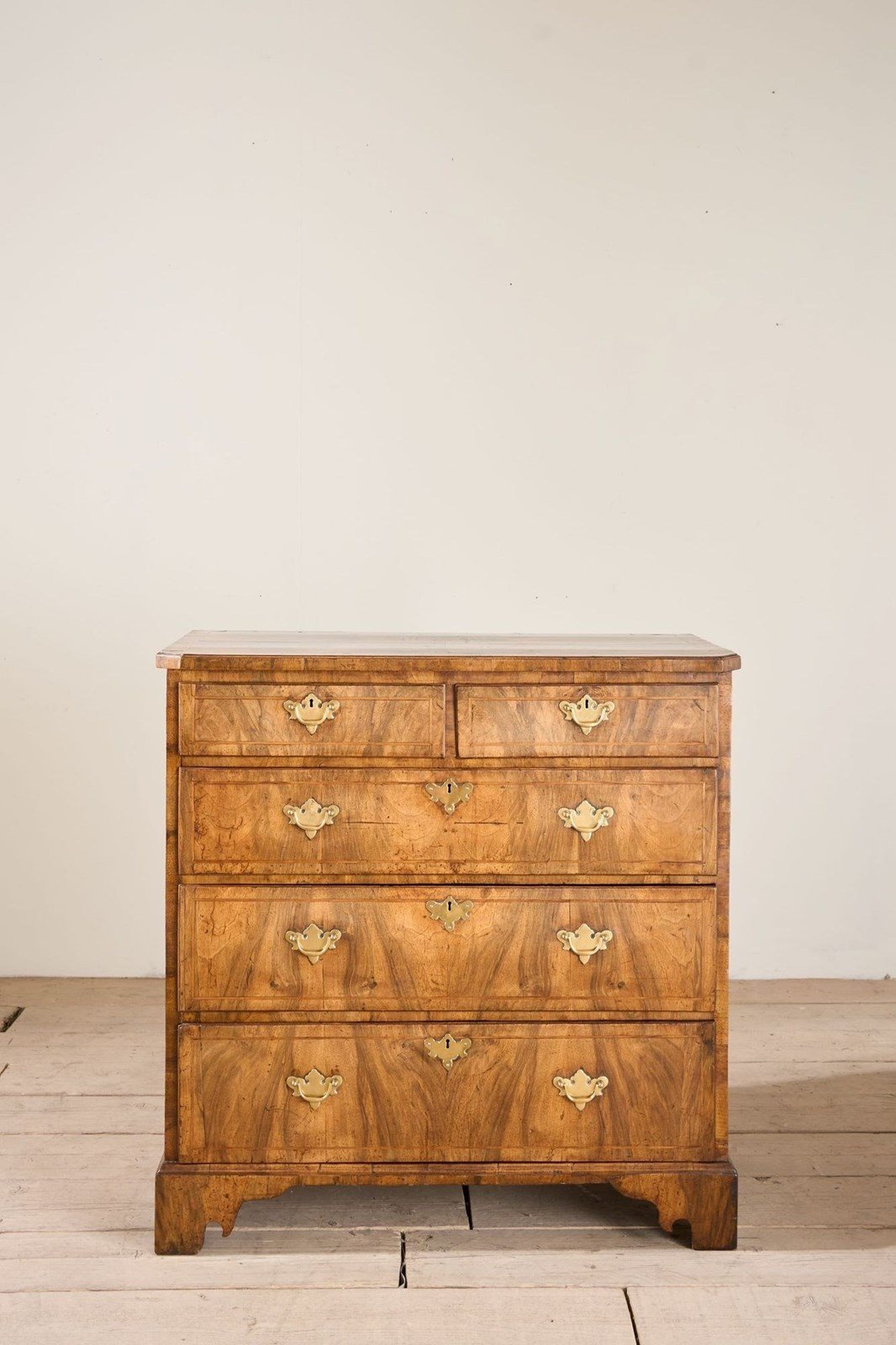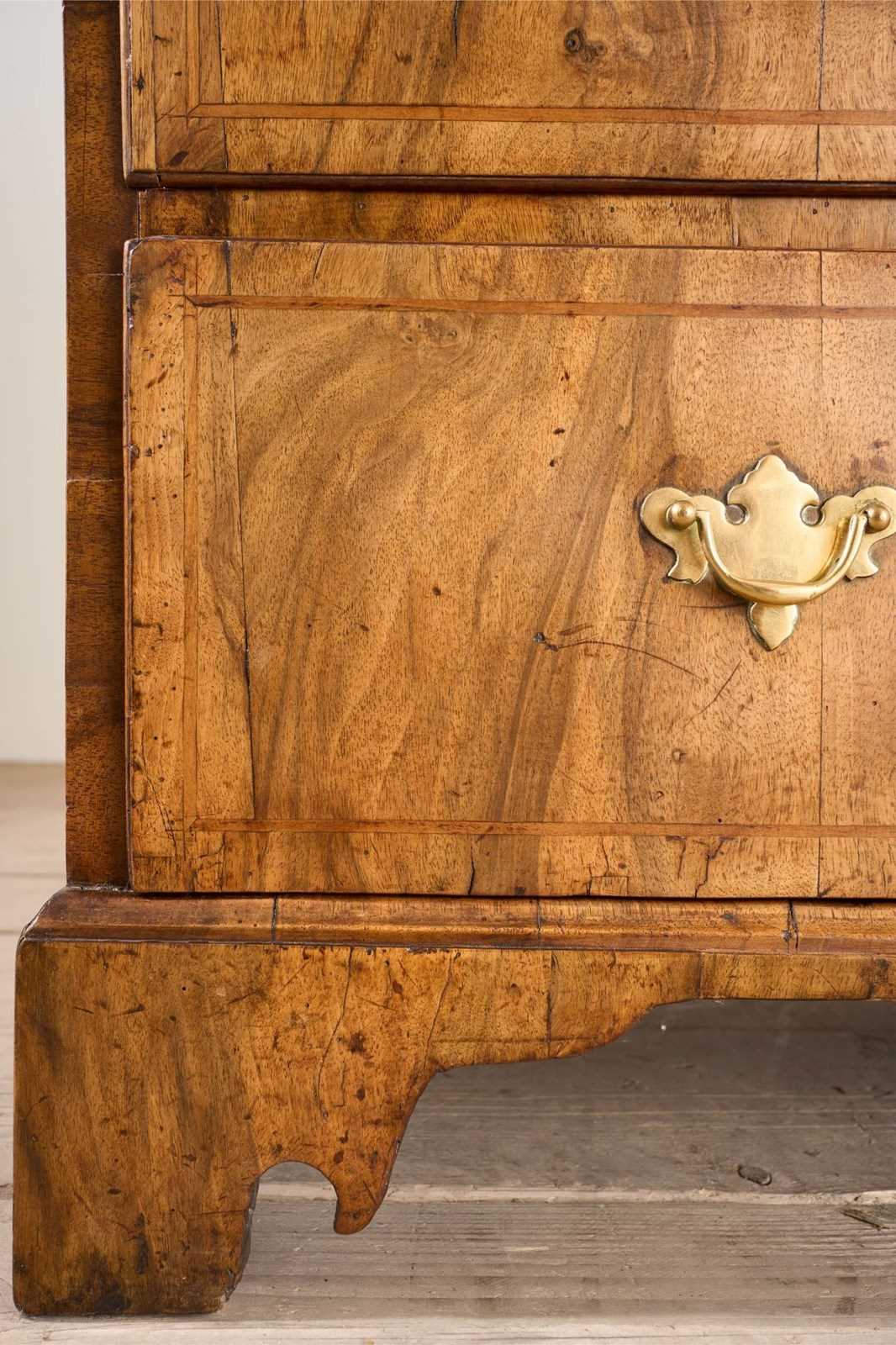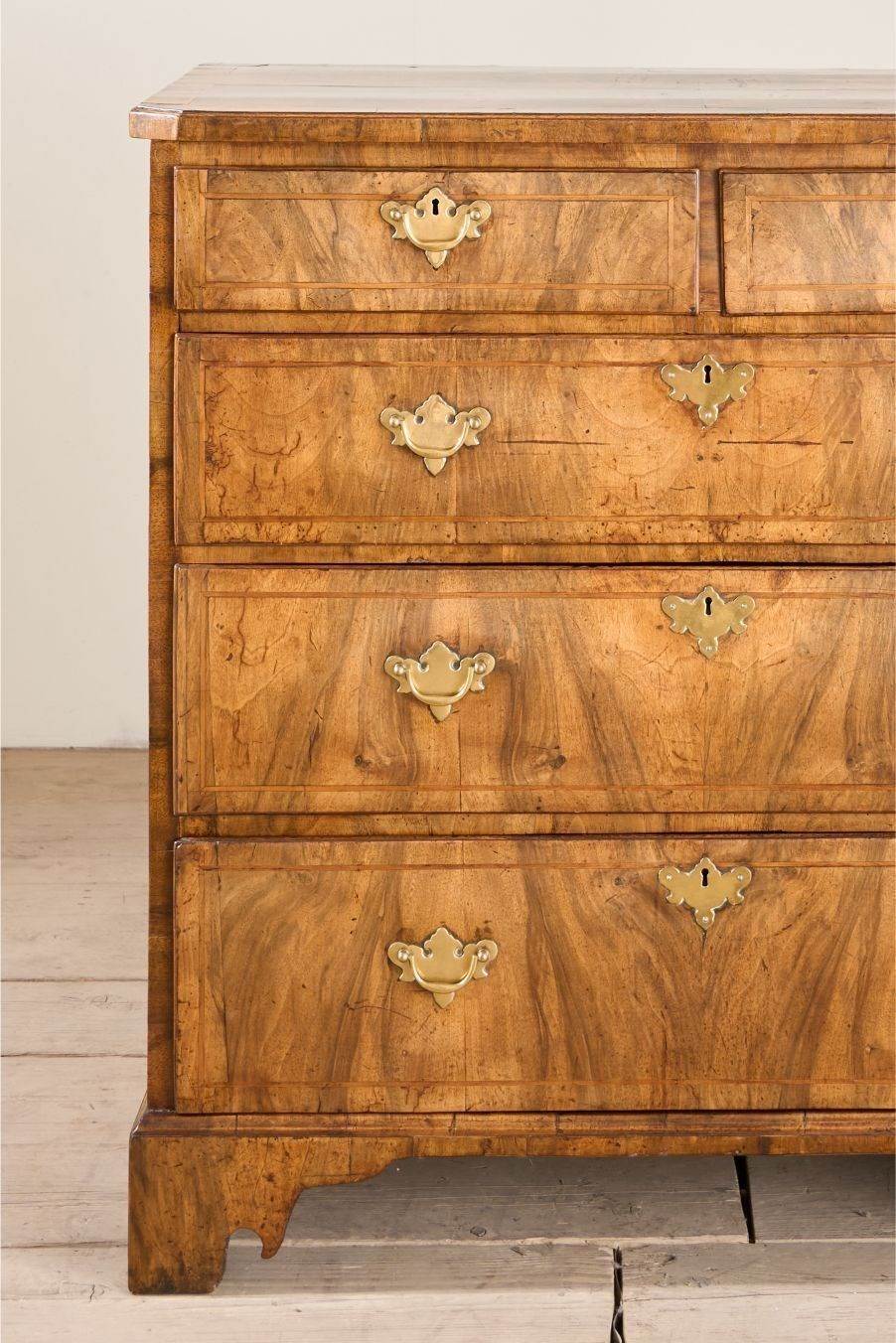 This is a very high quality, all original 18th century chest of drawers made from walnut. The figuring across the whole piece but particularly to the top is hugely attractive. All the patina adds a charm that can only be achieved from years of use. There are some details that set this Chest apart from others. The shaped corners on the top, the boarder around the top, the drawers have neat strung detail around their fronts and there is even strung details on the side panels. All drawers run and close well. The legs have a great shape to them also which gives a real elegance to the piece. A honest 18th century piece that will stand out in any home.