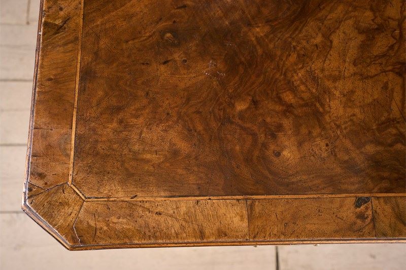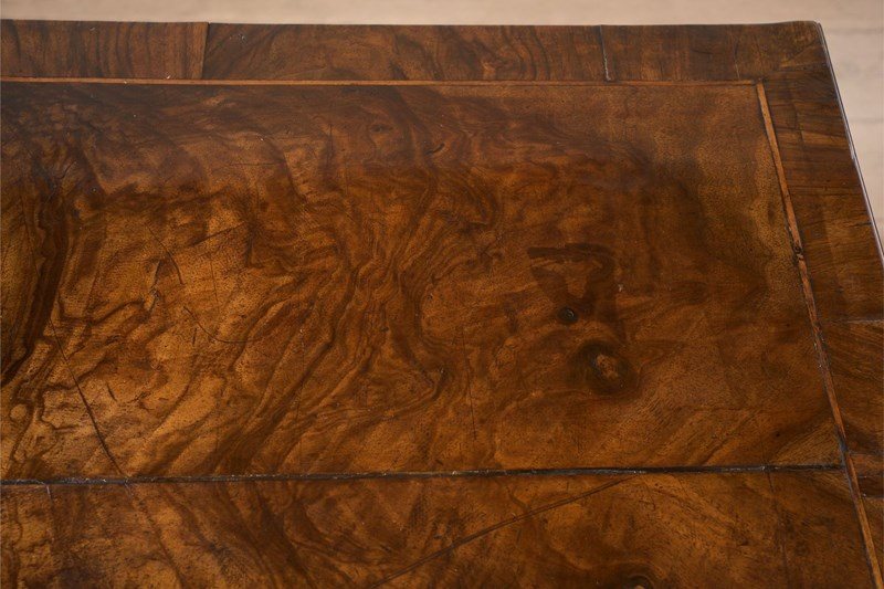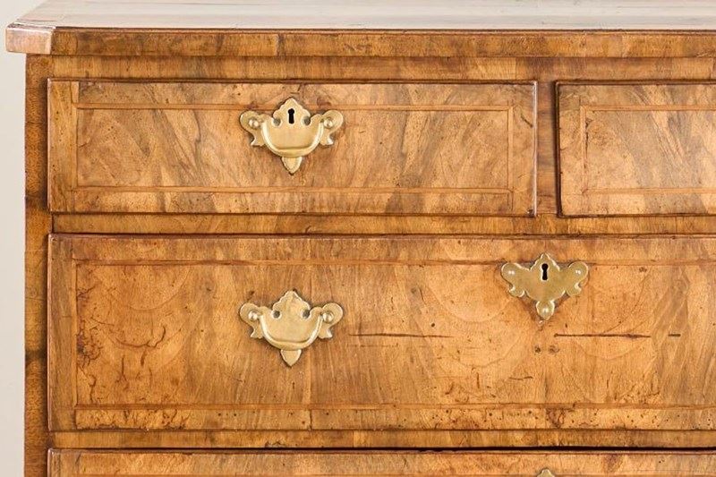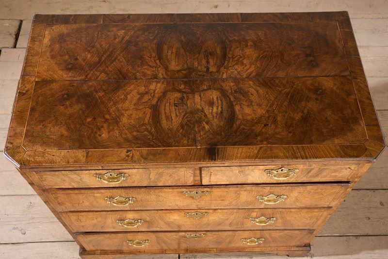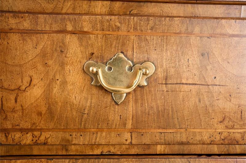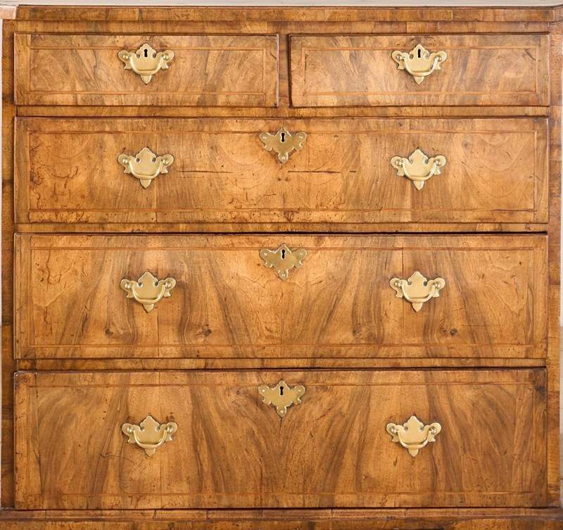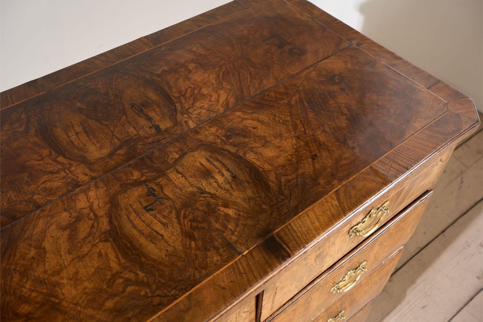 This is a very high quality, all original 18th century chest of drawers made from walnut. The figuring across the whole piece but particularly to the top is hugely attractive. All the patina adds a charm that can only be achieved from years of use. There are some details that set this Chest apart from others. The shaped corners on the top, the boarder around the top, the drawers have neat strung detail around their fronts and there is even strung details on the side panels. All drawers run and close well. The legs have a great shape to them also which gives a real elegance to the piece. A honest 18th century piece that will stand out in any home.