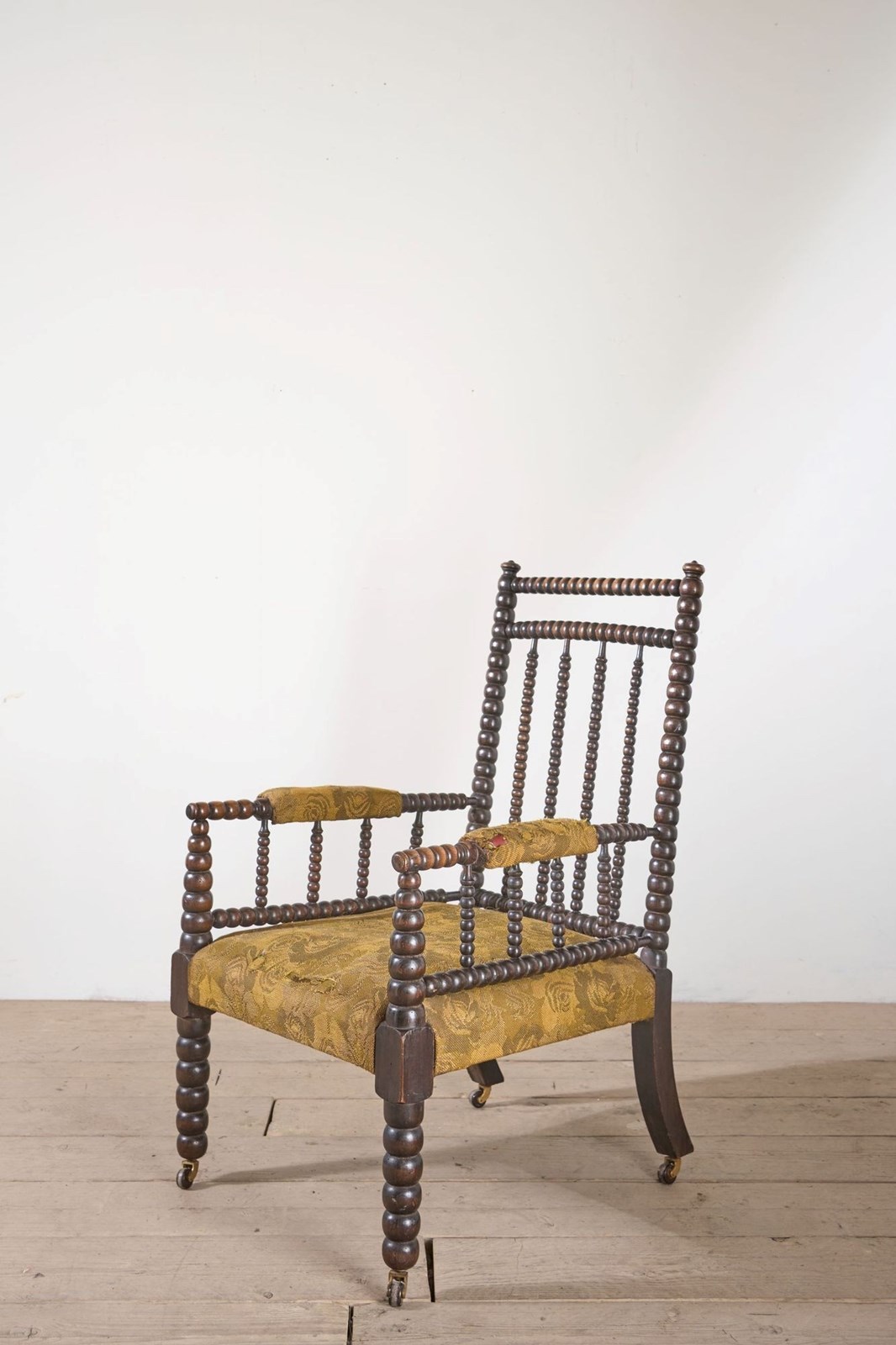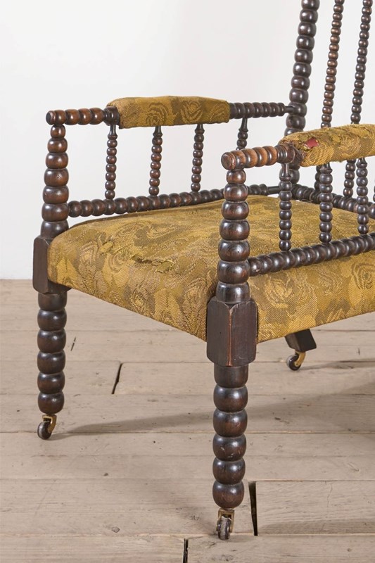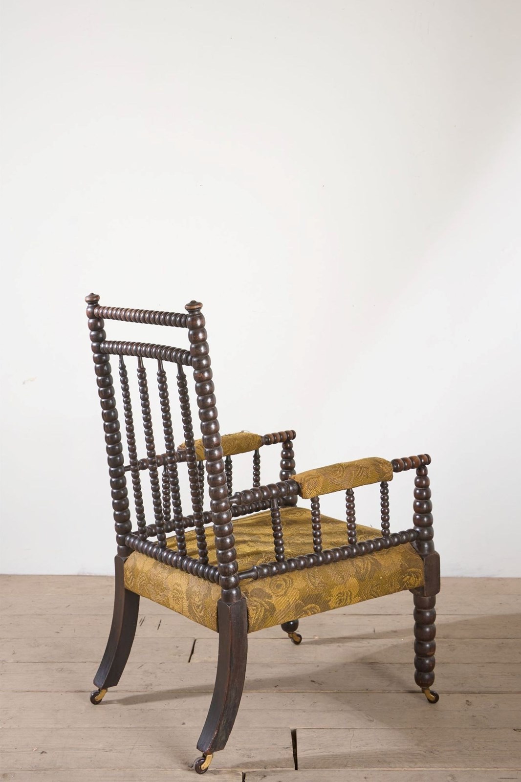 This is a high quality, neatly turned bobbin armchair. Great design and the frame has very attractive patina. Complete with original casters also.