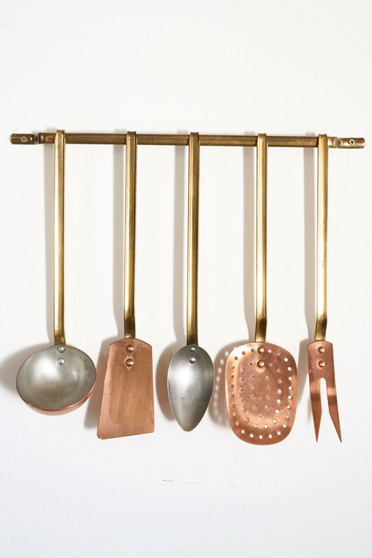 These are a beautiful set of 19th century Kitchen utensils made from copper and brass. They are in immaculate condition and even come with the original brass hanging rail. They would look fabulous on any kitchen wall and really are a testament to the quality of the crafts people from the time. Sourced in the South of France country side.