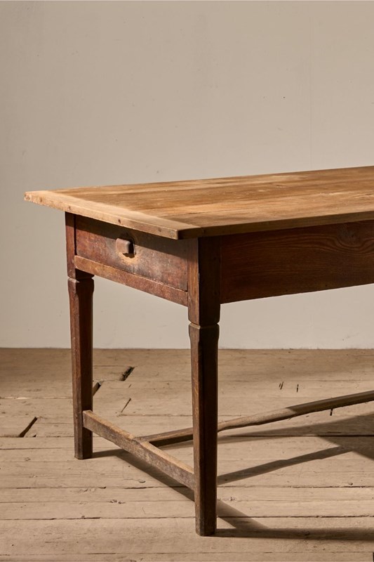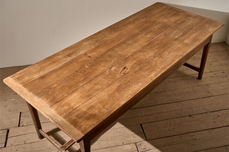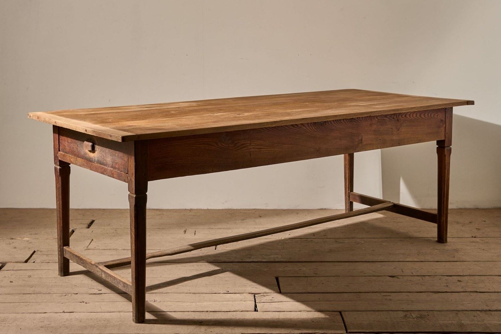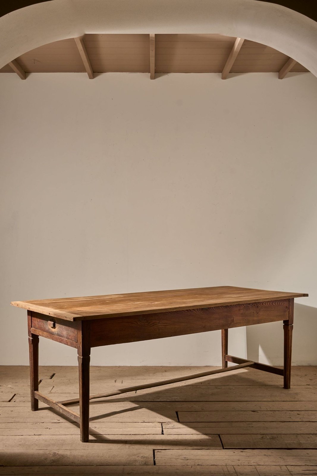 This is a classic French farmhouse table with plenty of character. 19th century in age with a lovely dry stained base and a patinated elm top. The top has honest marks, scratches consistent with age and use but doesn't detract. The table is complete with two drawers (replaced drawer bottoms) which run smooth and close flush. Solid condition and an ideal everyday dining table.