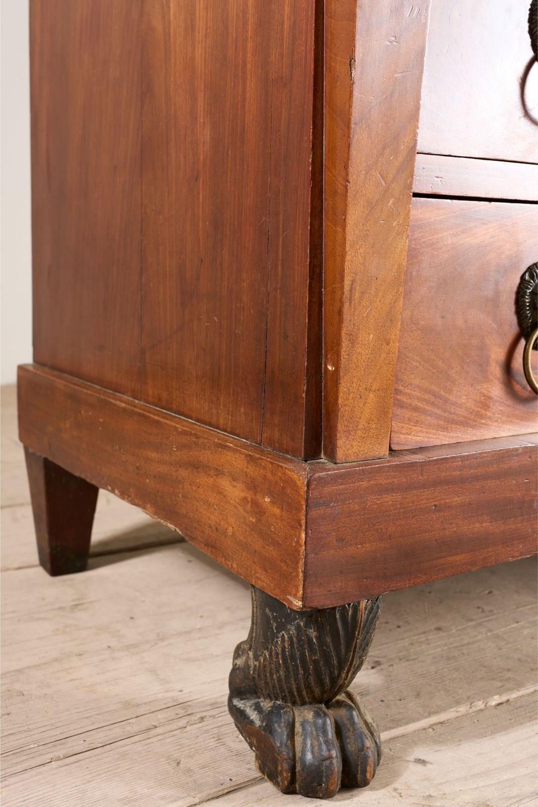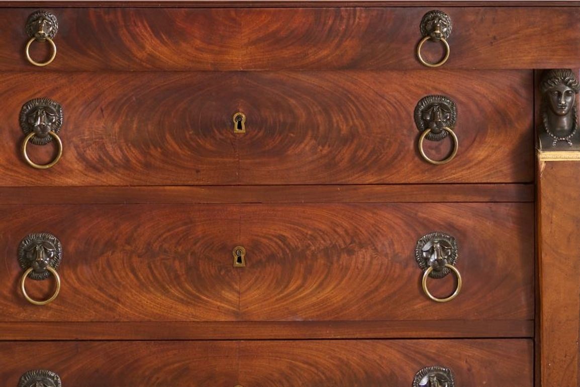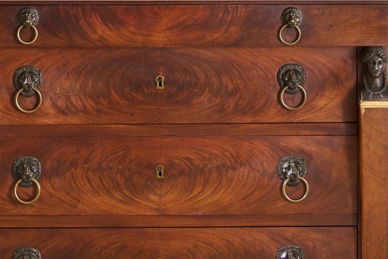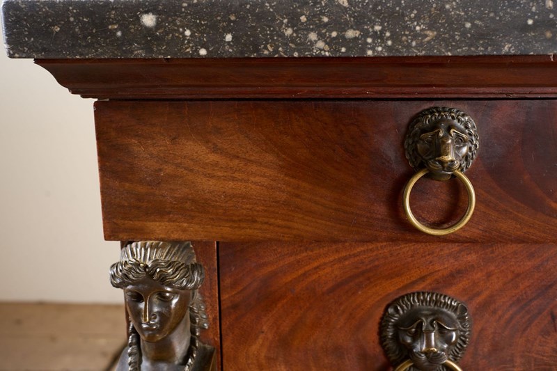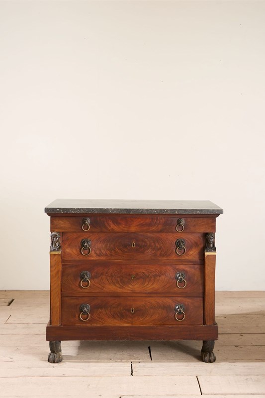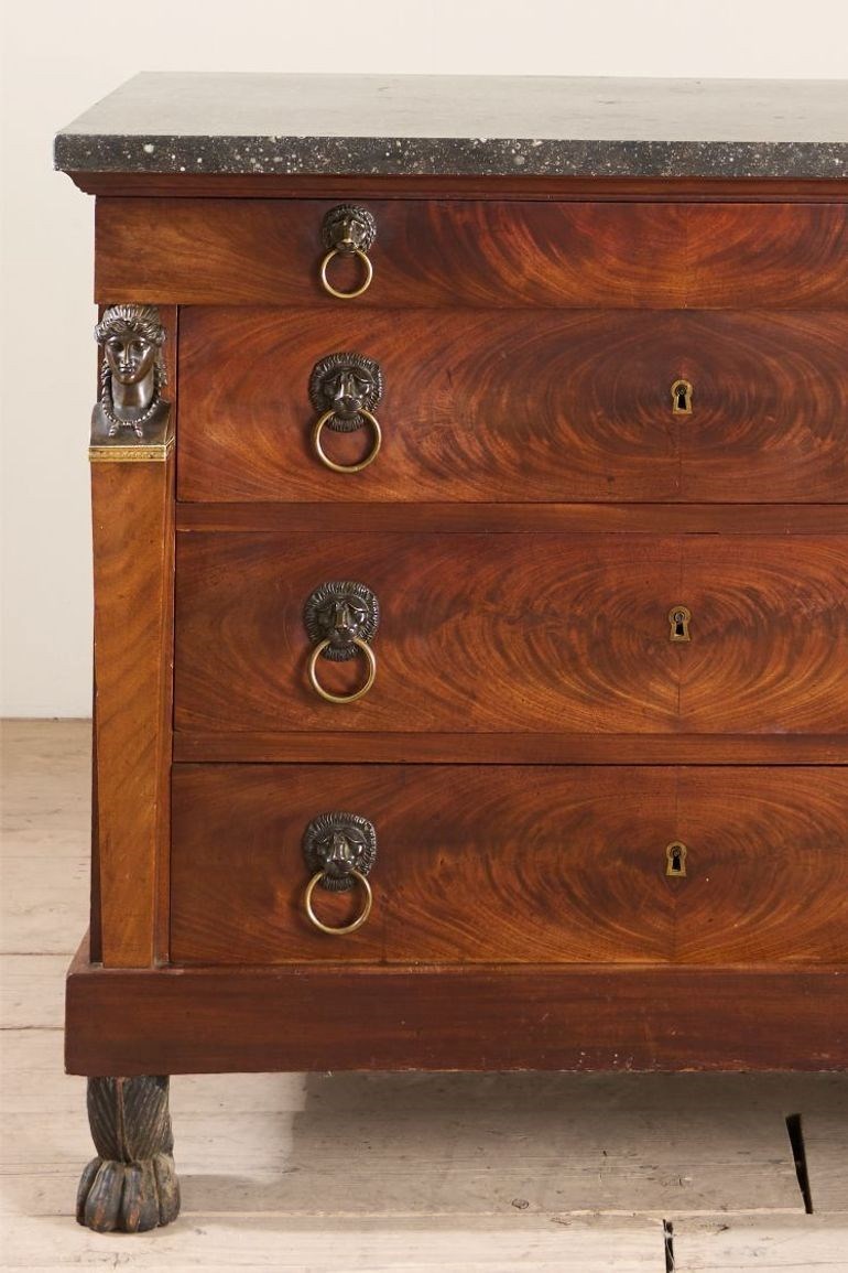 This is a very high quality 19th century French empire chest of drawers. Made from mahogany and has stunning bronze goddess faces, black fossil marble top and carved original painted feet. All of which show the quality of the piece and also make it hugely decorative. It is very handsome and is in great overall condition with minor blemishes consistent with age and use. The handles are neat with lion masks and all drawers open and close well. The marble is also original and has no major faults. The bronze decoration is very finely done and add a lot to the design of the chest. For me though the feet are one of my favourite details. They are carved timber with totally original worn black paint that gives the whole piece a stylish contrast. Possibly one of my favourite finds of late.