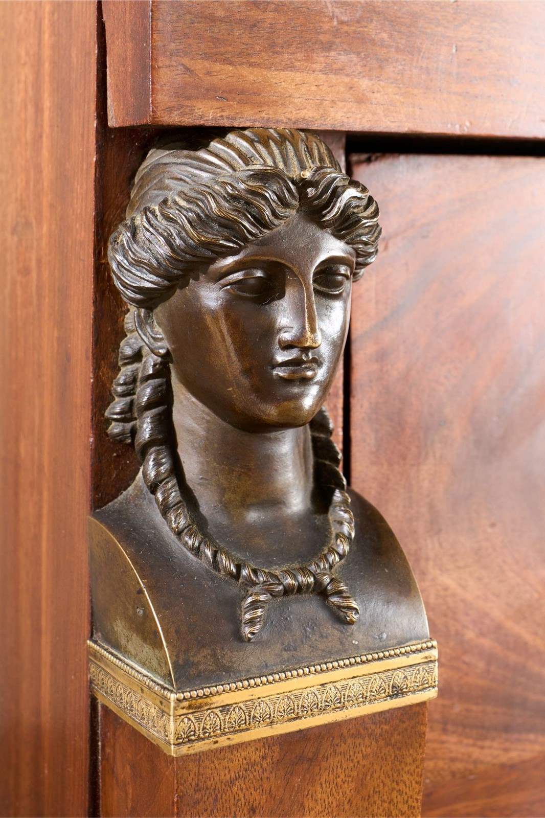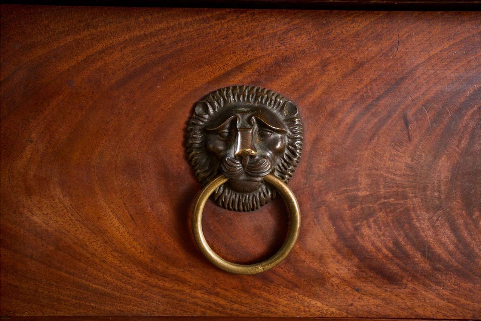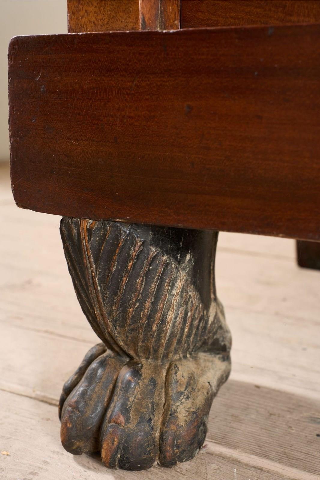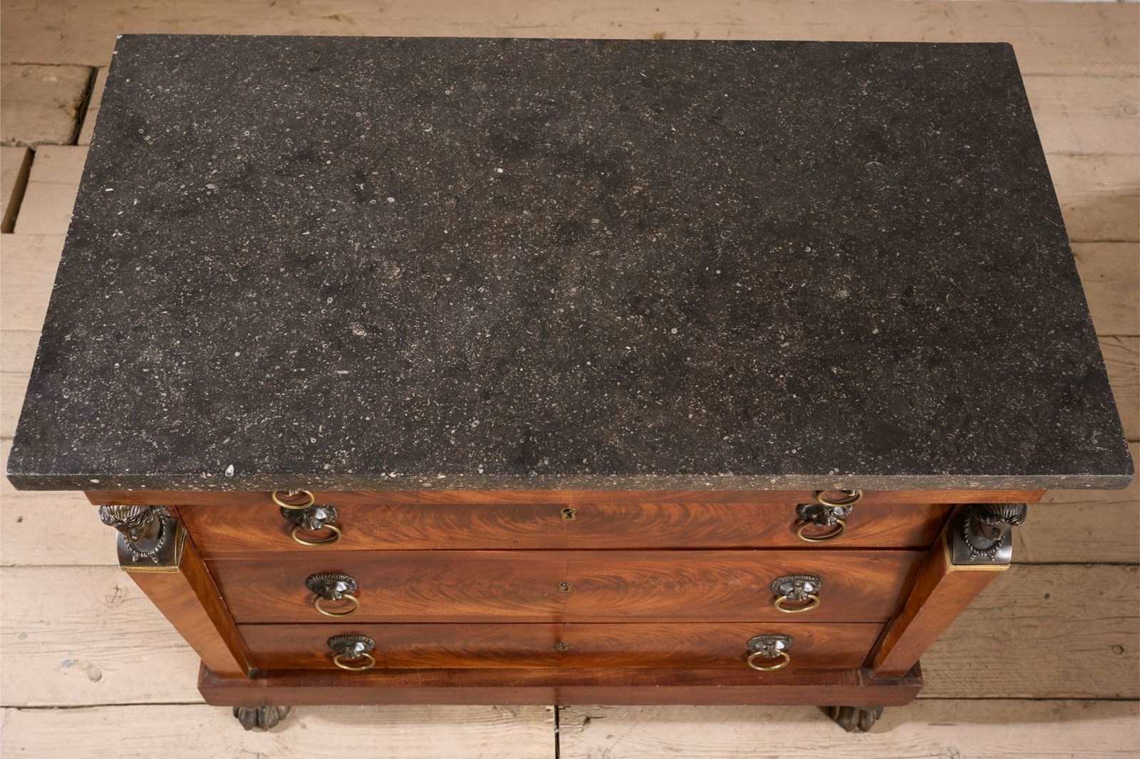 This is a very high quality 19th century French empire chest of drawers. Made from mahogany and has stunning bronze goddess faces, black fossil marble top and carved original painted feet. All of which show the quality of the piece and also make it hugely decorative. It is very handsome and is in great overall condition with minor blemishes consistent with age and use. The handles are neat with lion masks and all drawers open and close well. The marble is also original and has no major faults. The bronze decoration is very finely done and add a lot to the design of the chest. For me though the feet are one of my favourite details. They are carved timber with totally original worn black paint that gives the whole piece a stylish contrast. Possibly one of my favourite finds of late.