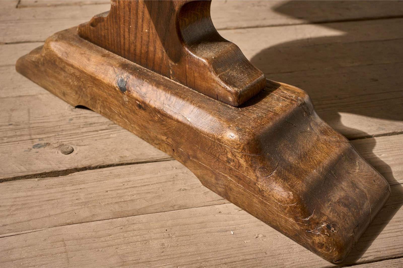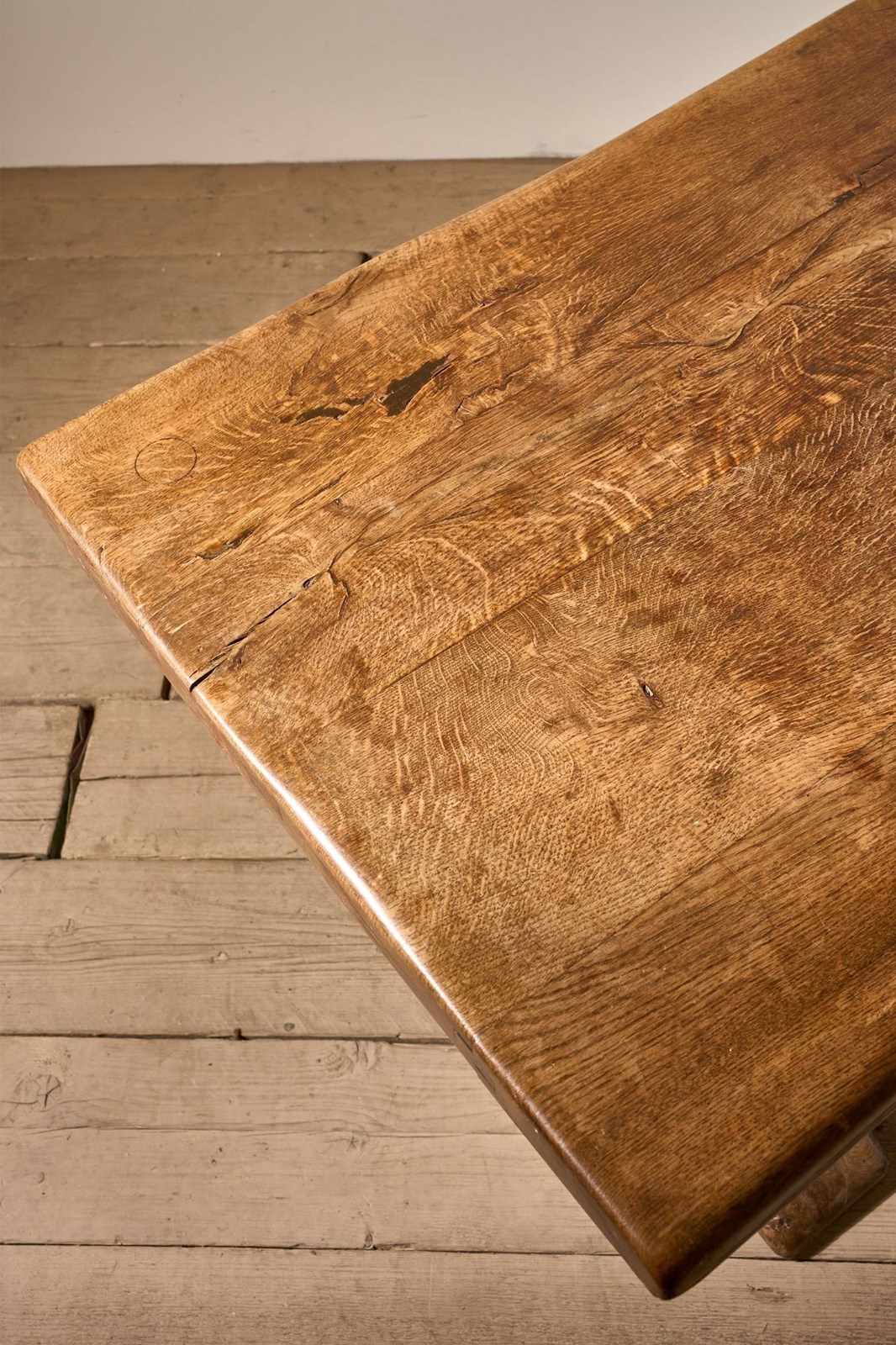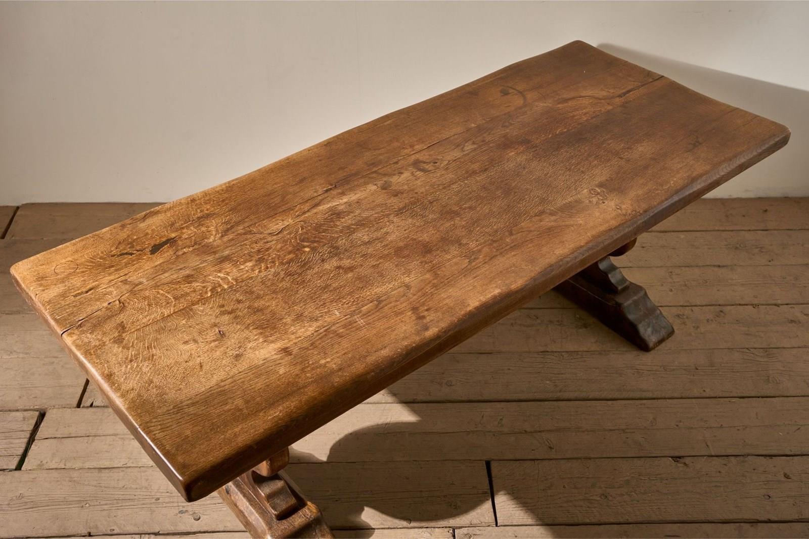 This is a lovely quality and condition 19th century French oak dining table. The top is thick oak planks with beautiful figuring and colour. Solid condition and breaks down for ease of moving into position. The table has waney edges giving it plenty of character. Nice practical size as well. Seats 6-8 comfortably.