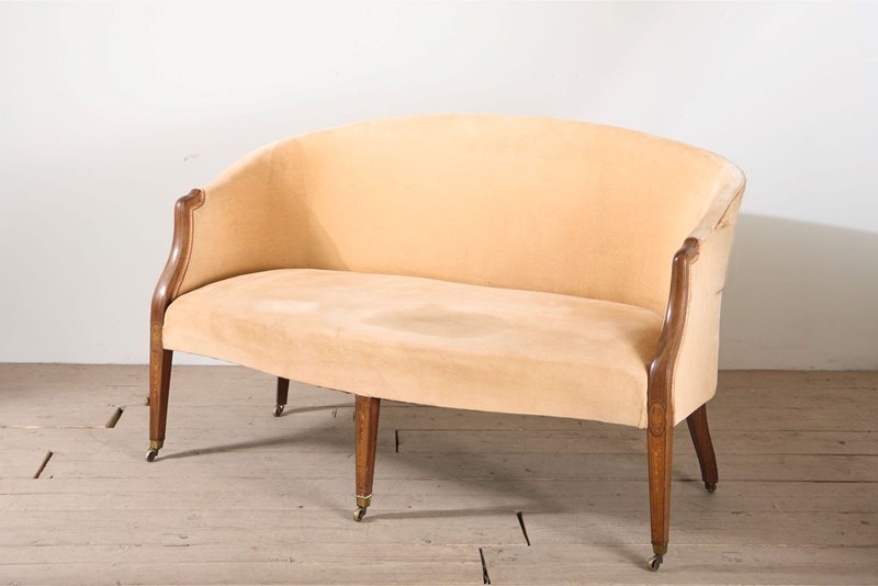 This is a very elegant 19th century high quality Hepplewhite / Sheraton style curved back sofa. The proportions are neat yet still practical with a comfy deep seat. The frame is mahogany and inlaid with fine marquetry details. All legs complete with original casters. Wonderful quality as well.