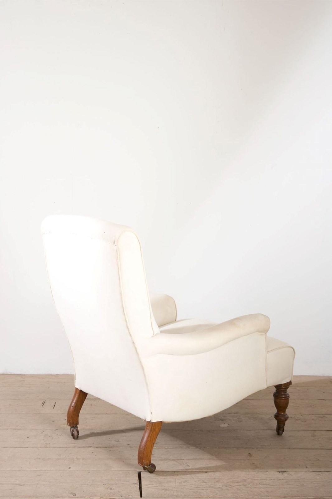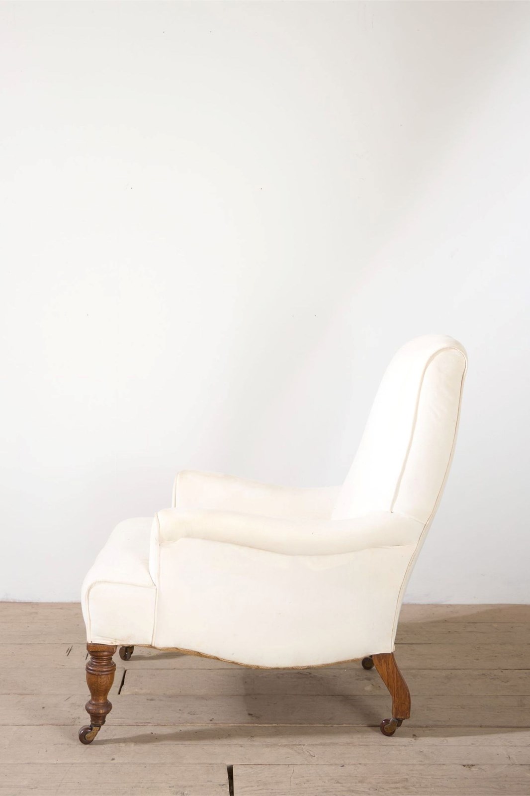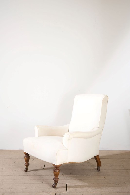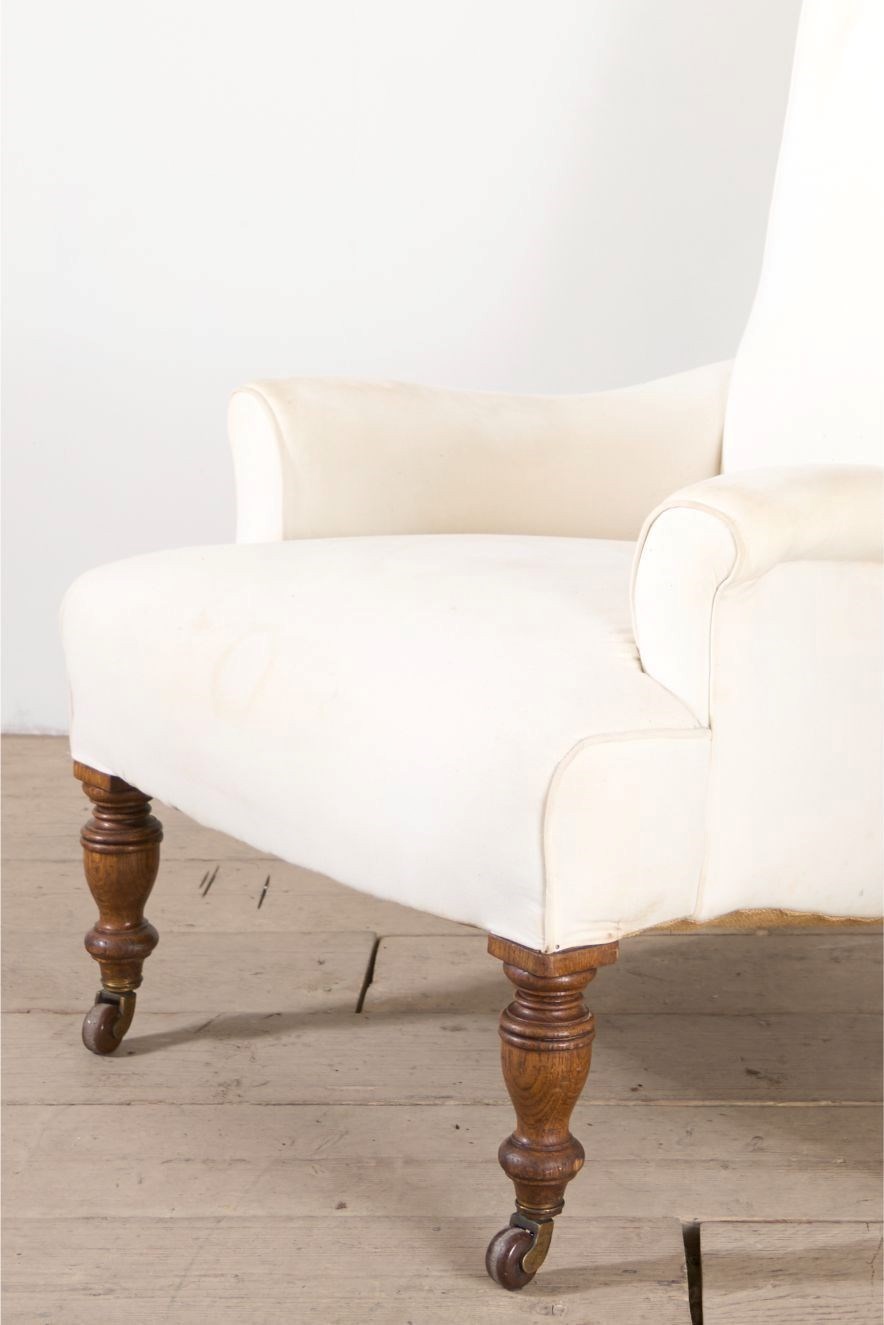 This is a very elegant 19th century English country house armchair. Standing on tall oak legs and beautiful quality throughout. Deep seat and high back making it particularly comfy. The side rail also has a fabulous shape.