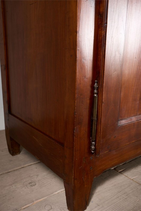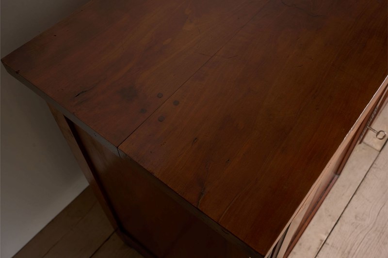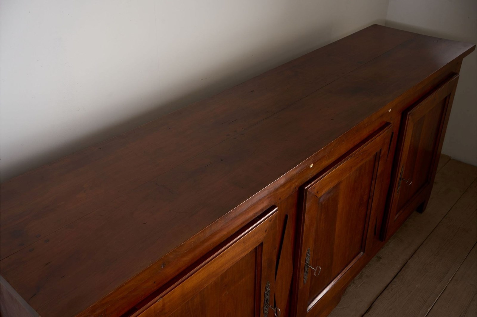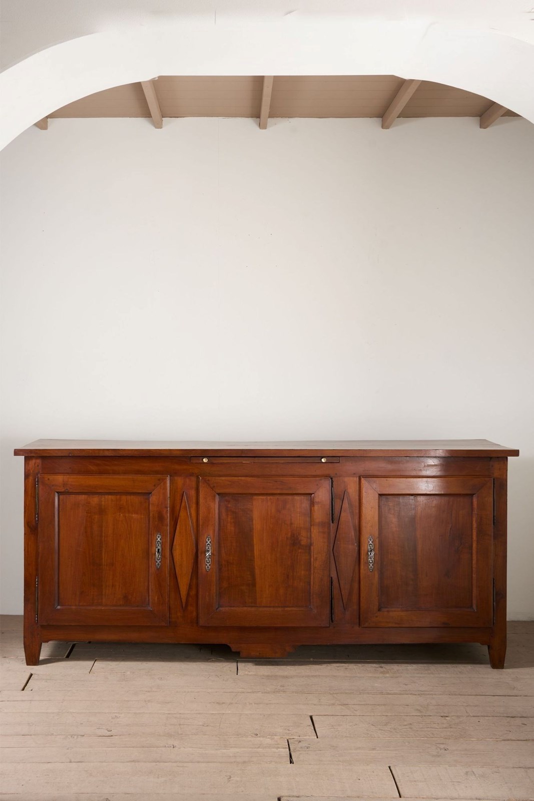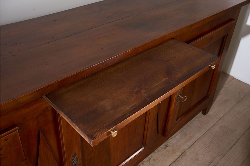 This is a fabulous quality 19th century solid cherrywood sideboard. The condition is very clean with a nice aged patina. The design of the panelled doors and diamond details give this a more contemporary edge making it hugely decorative. The size offers plenty of storage and the interior opens up to a shelved interior. The piece comes with 3 keys that work on their specific doors. There is also a pull out shelf that was used for cutting bread on.