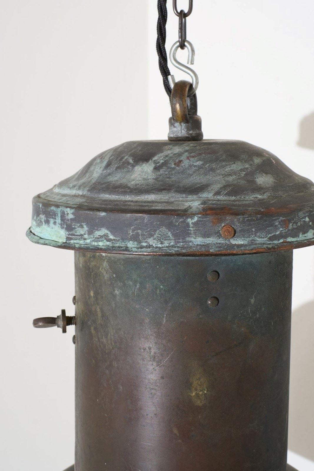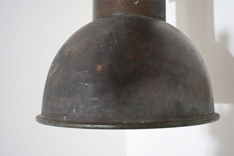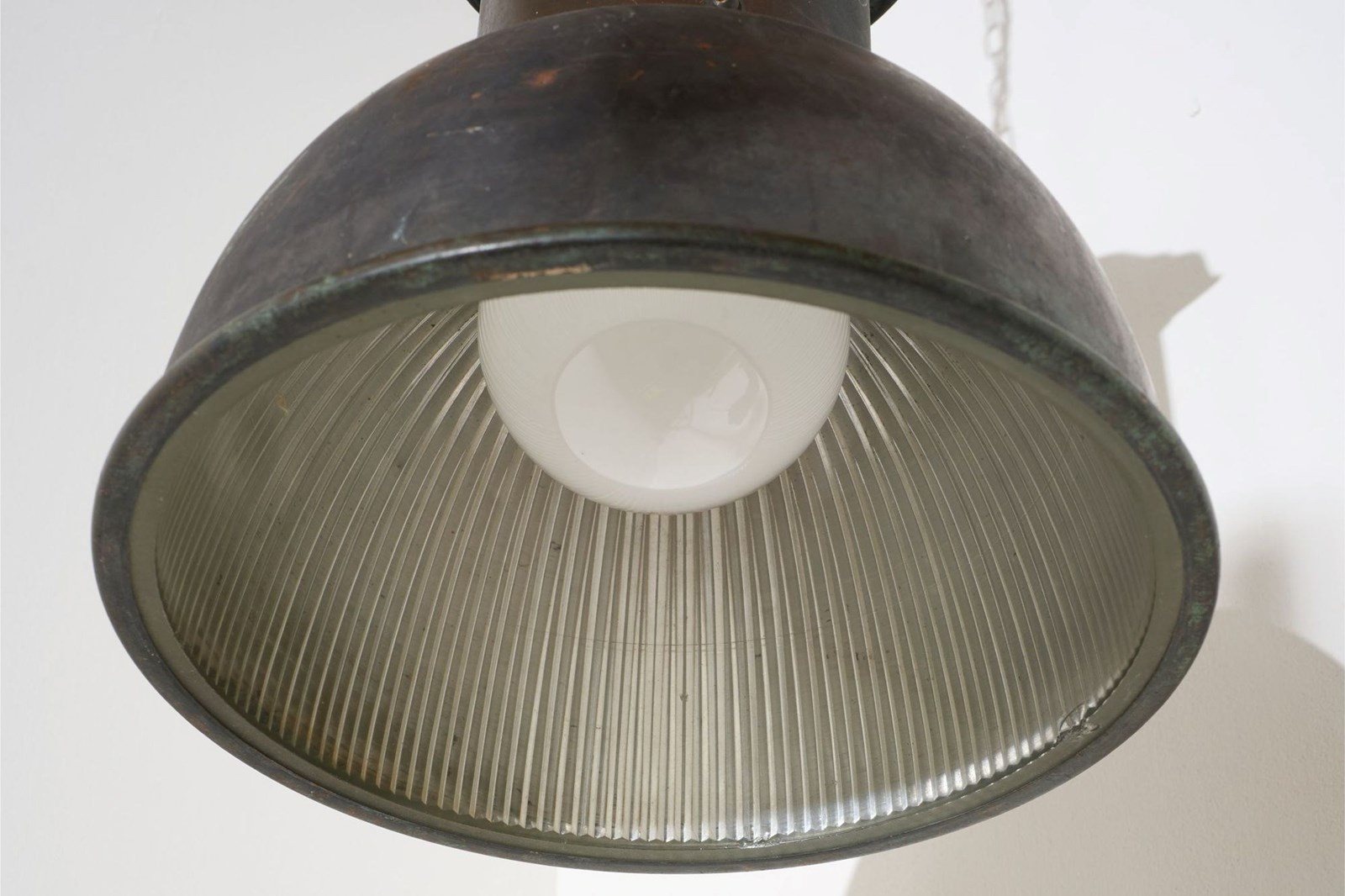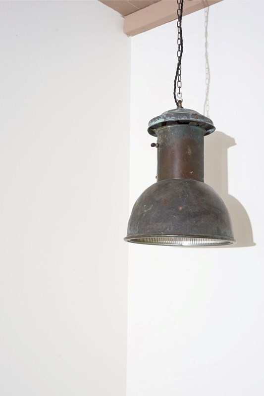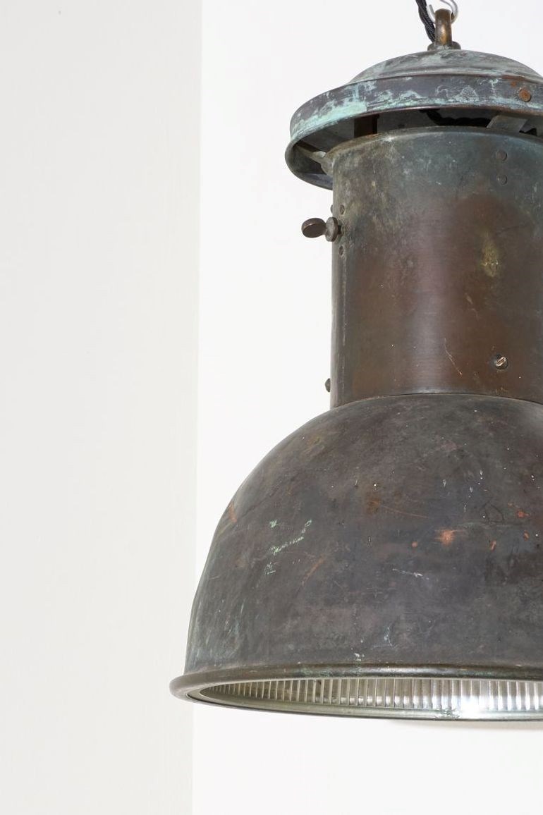 This is a very smart all original 20th century copper holophane prismatic pendent light. The patina with hint of verdigris coming through makes this hugely decorative and would look perfect in the corner of a room or over a circular dining table. There is a small chip to the holophane diffuser but hardly noticeable.
