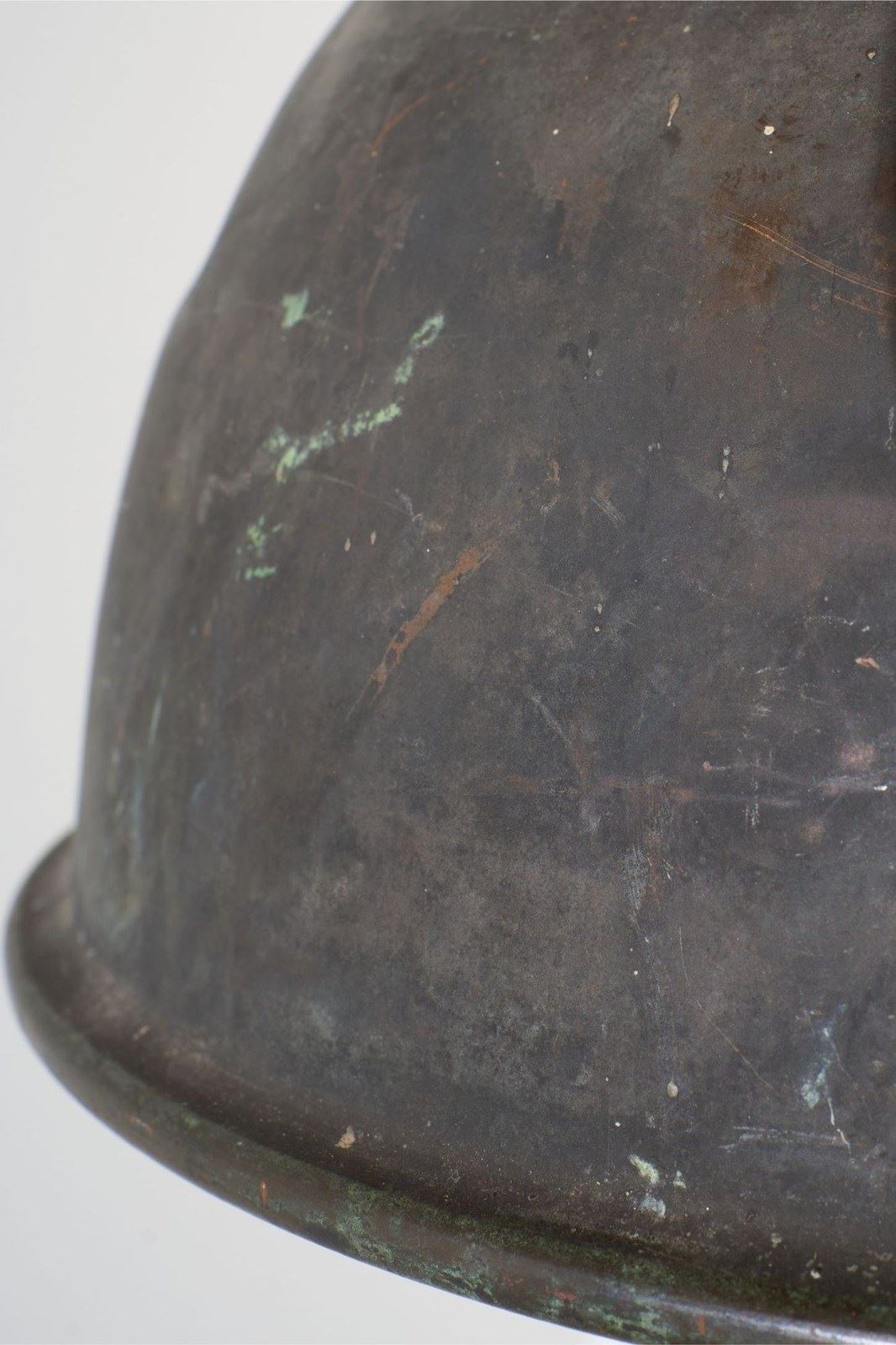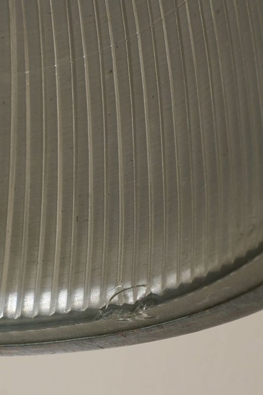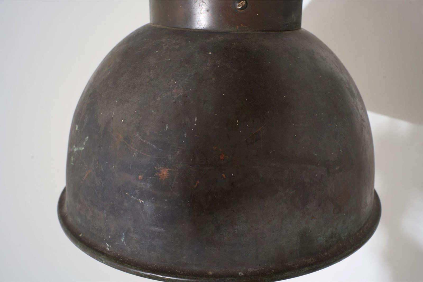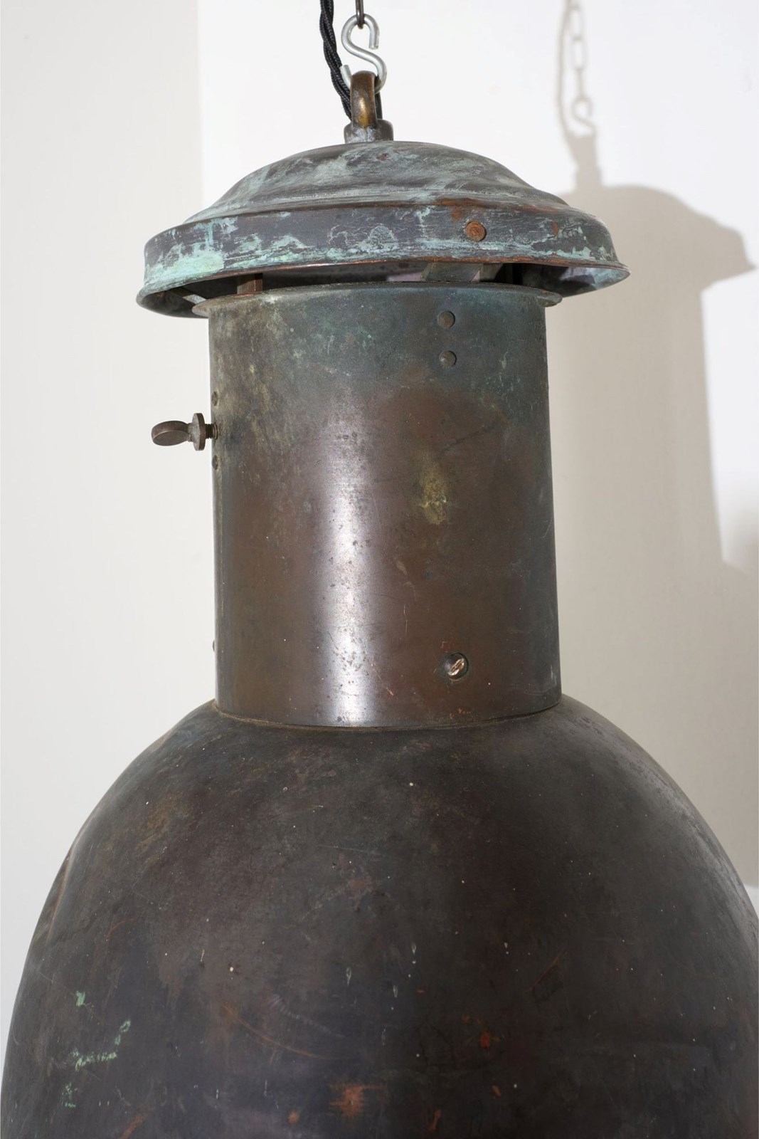 This is a very smart all original 20th century copper holophane prismatic pendent light. The patina with hint of verdigris coming through makes this hugely decorative and would look perfect in the corner of a room or over a circular dining table. There is a small chip to the holophane diffuser but hardly noticeable.