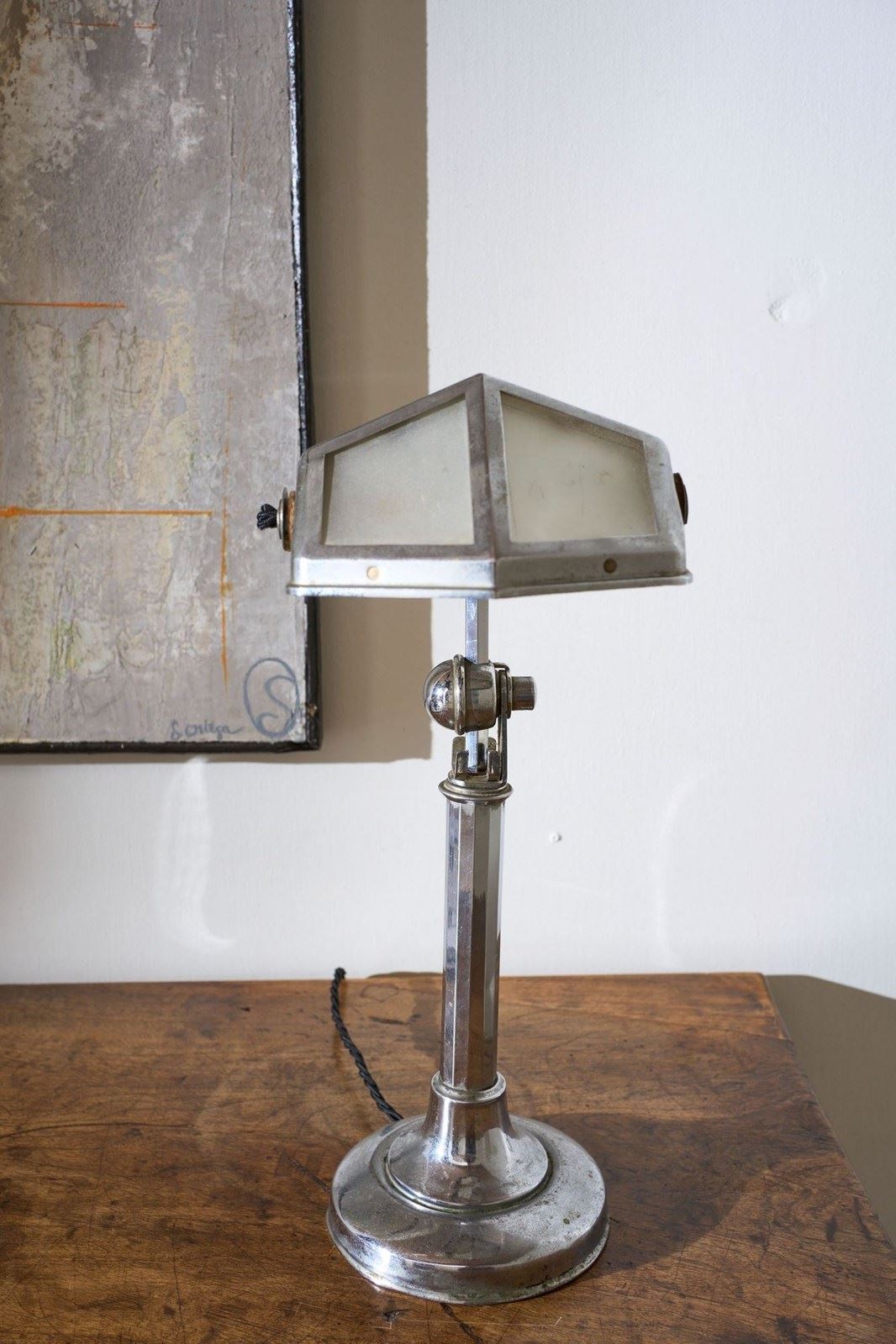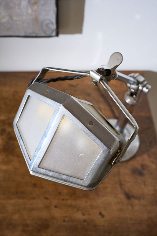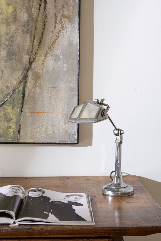 This is a very smart totally original, adjustable Art Deco desk lamp. The chrome has a lovely aged patina to it and this still retains the original frosted glass shade. The lamp is adjustable. It starts compact and then you can pull up the extending arm which once it hits a point you can then adjust the light up and down. This original mechanism still works well. The overall condition is good with a few small dents to the base but nothing that takes away from this piece which is a rare survivor.