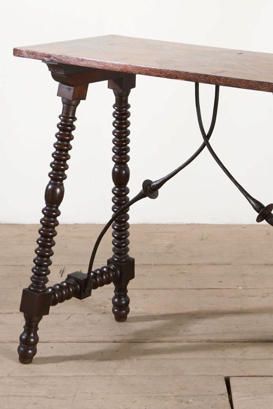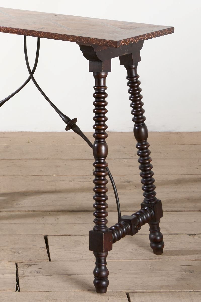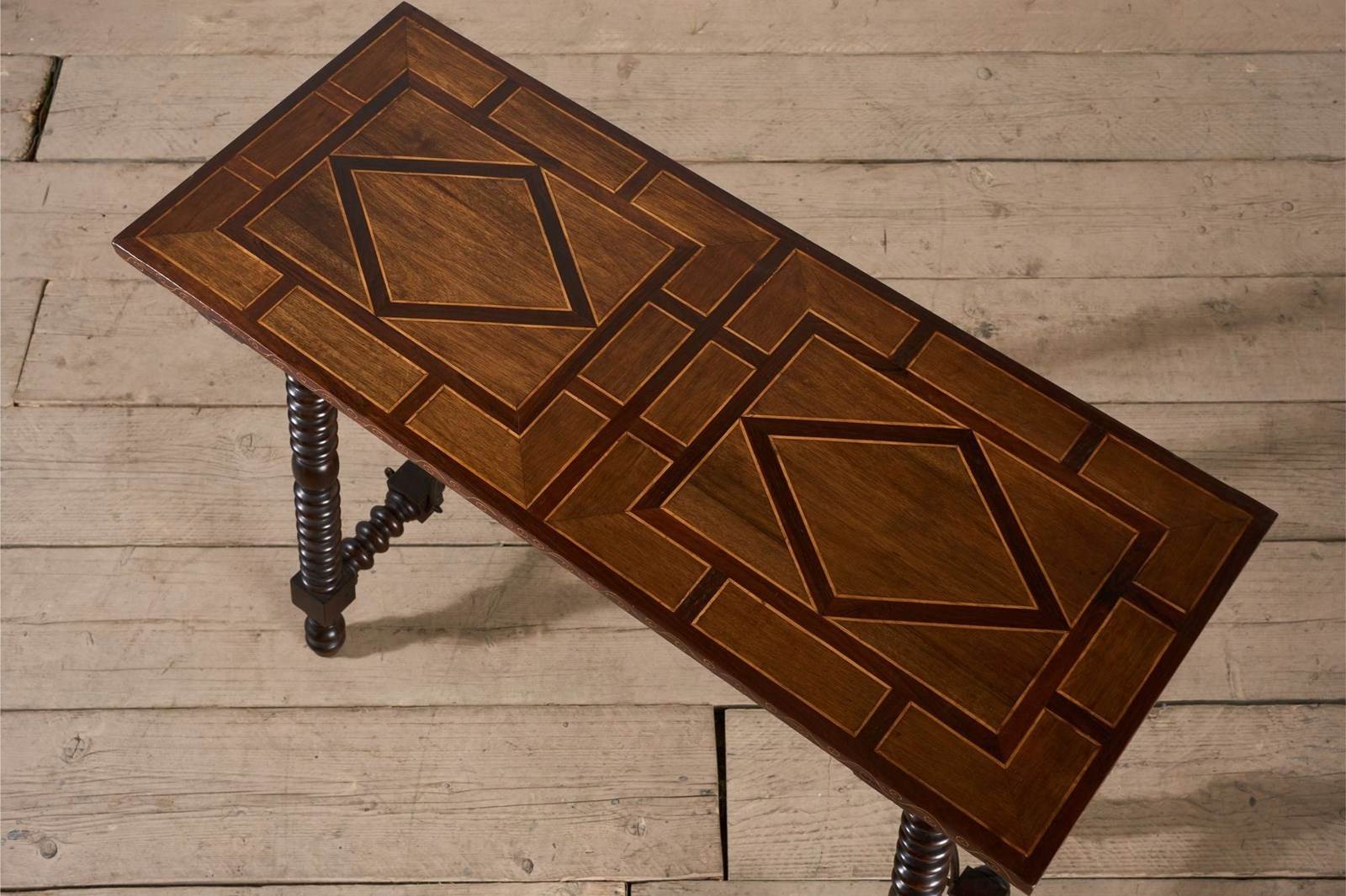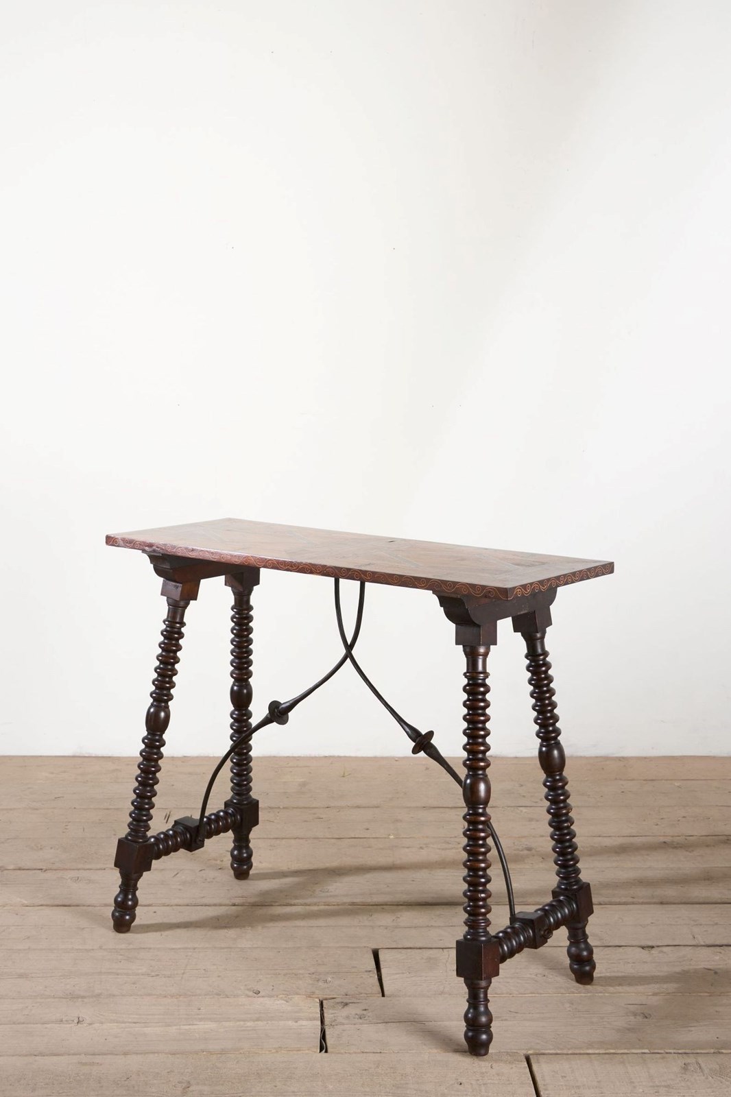This is a very high quality Early 19th century rosewood and walnut Spanish console table with turned legs. Totally original including the metal supports. The overall condition is exceptional with no major issues. For me the bobbin turned legs and the bold Geometric pattern top make this table stand out and be hugely decorative. Neat sizes as well. There are also strung details around the edge of the top in what looks to be maple or similar which really highlight the quality.