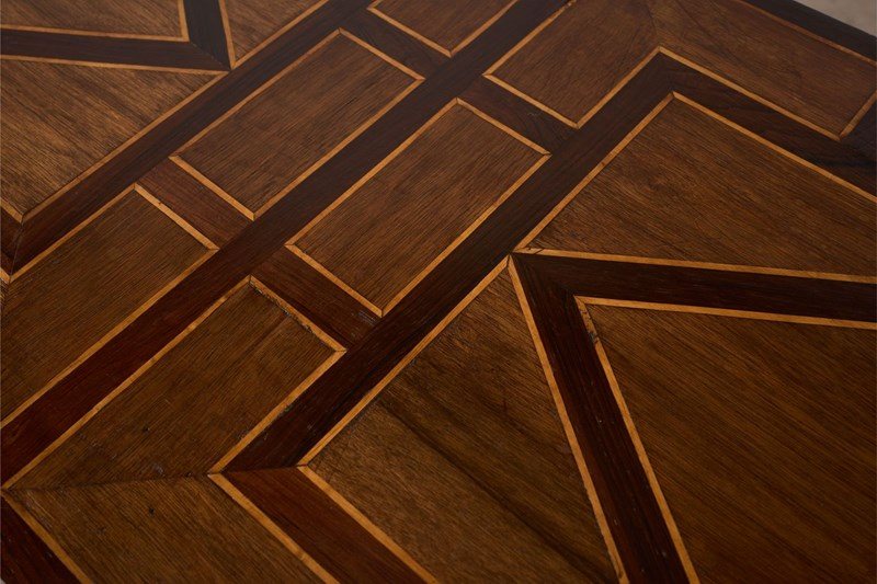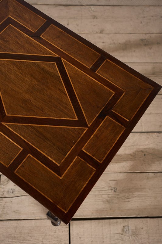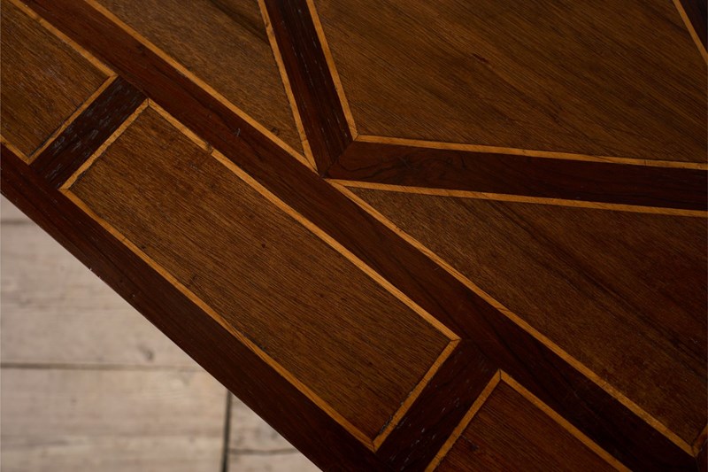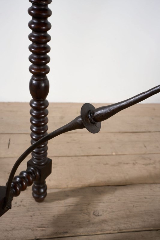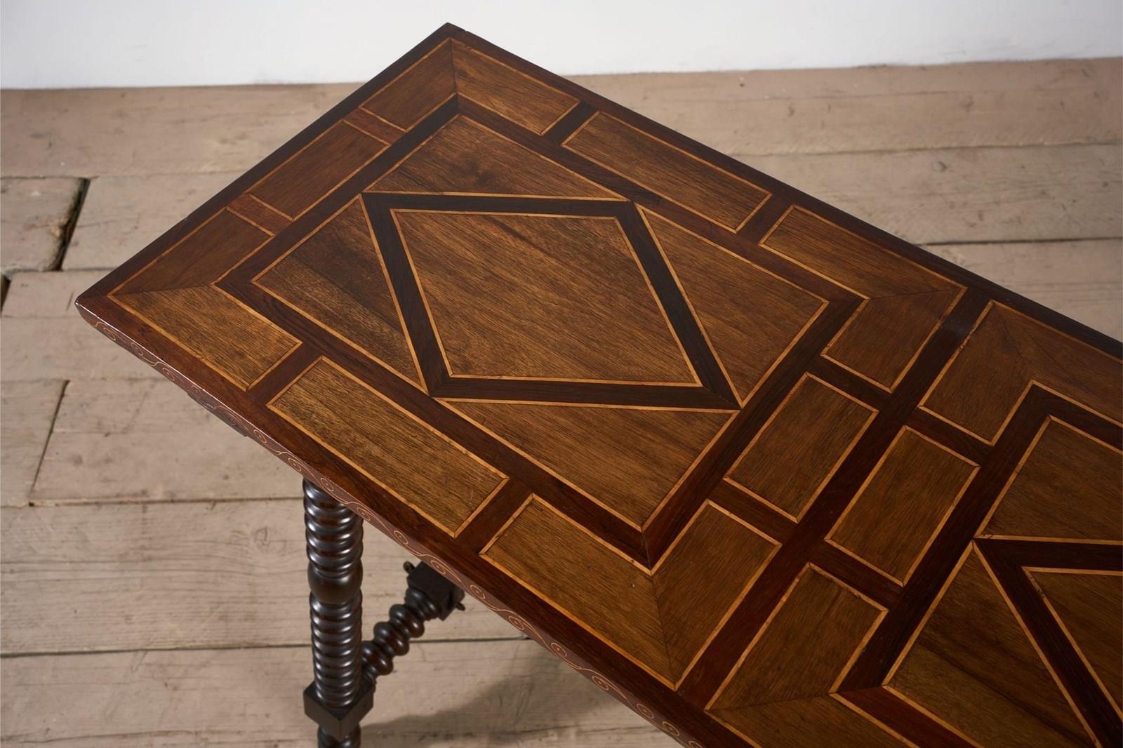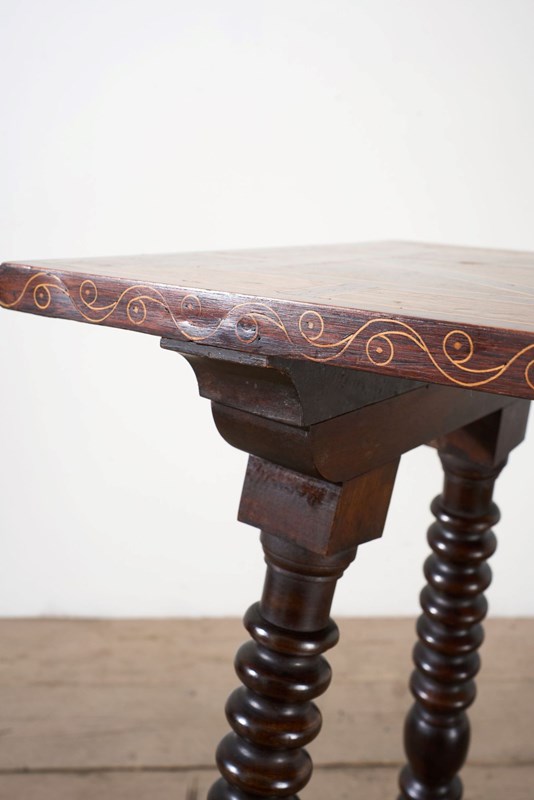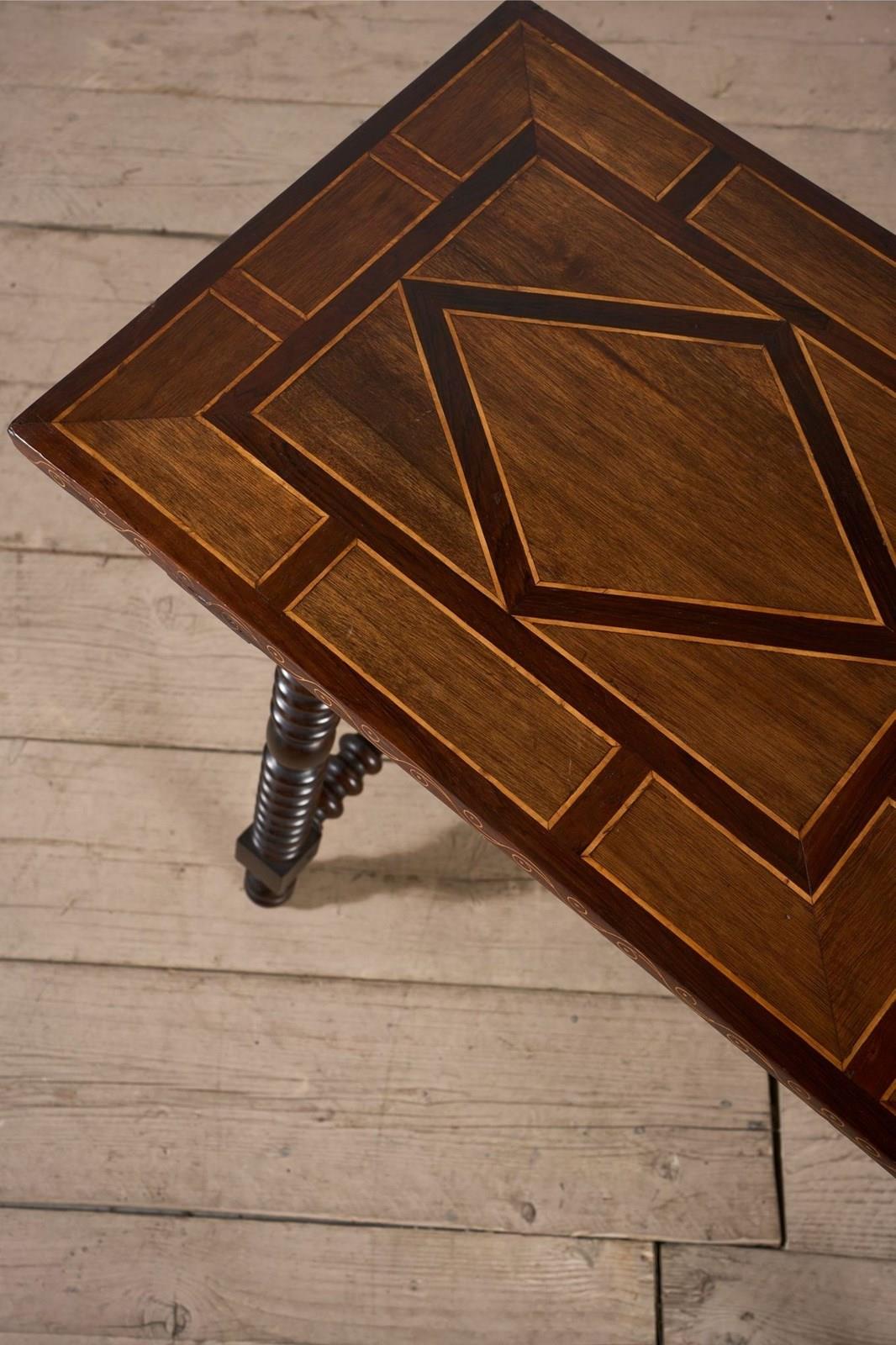 This is a very high quality Early 19th century rosewood and walnut Spanish console table with turned legs. Totally original including the metal supports. The overall condition is exceptional with no major issues. For me the bobbin turned legs and the bold Geometric pattern top make this table stand out and be hugely decorative. Neat sizes as well. There are also strung details around the edge of the top in what looks to be maple or similar which really highlight the quality.