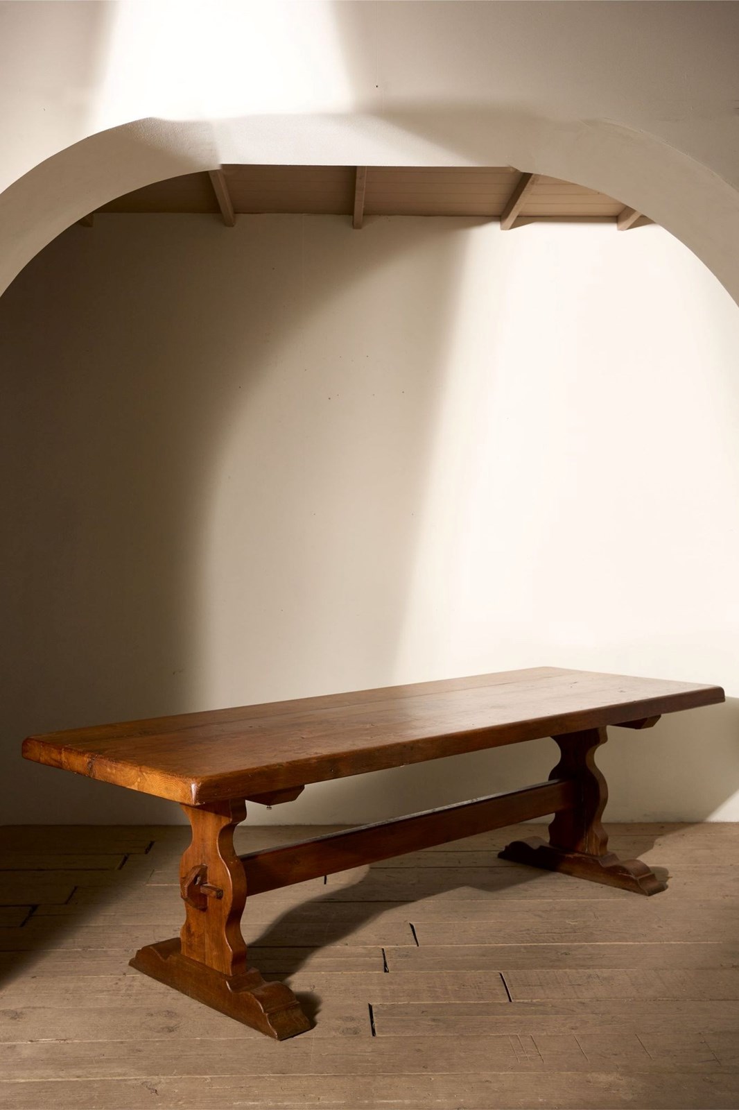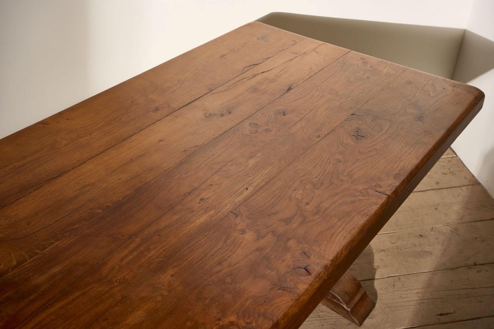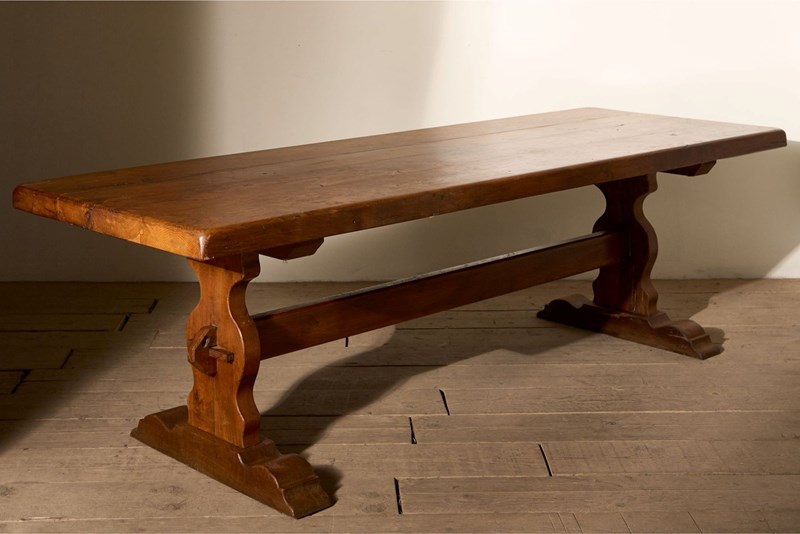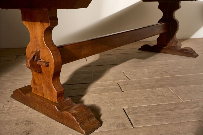 This is a very nice quality, early 20th century solid oak dining table. Lovely warm colour to the oak and wonderful figuring. The design is beautifully simple, a classic refectory style that works so well in both modern and traditional homes. The condition overall is very good with only minor age related marks. The size is extremely practical and will sit 10 people comfortably. As the table is solid oak, making it very heavy but does break down if required for delivery and access.