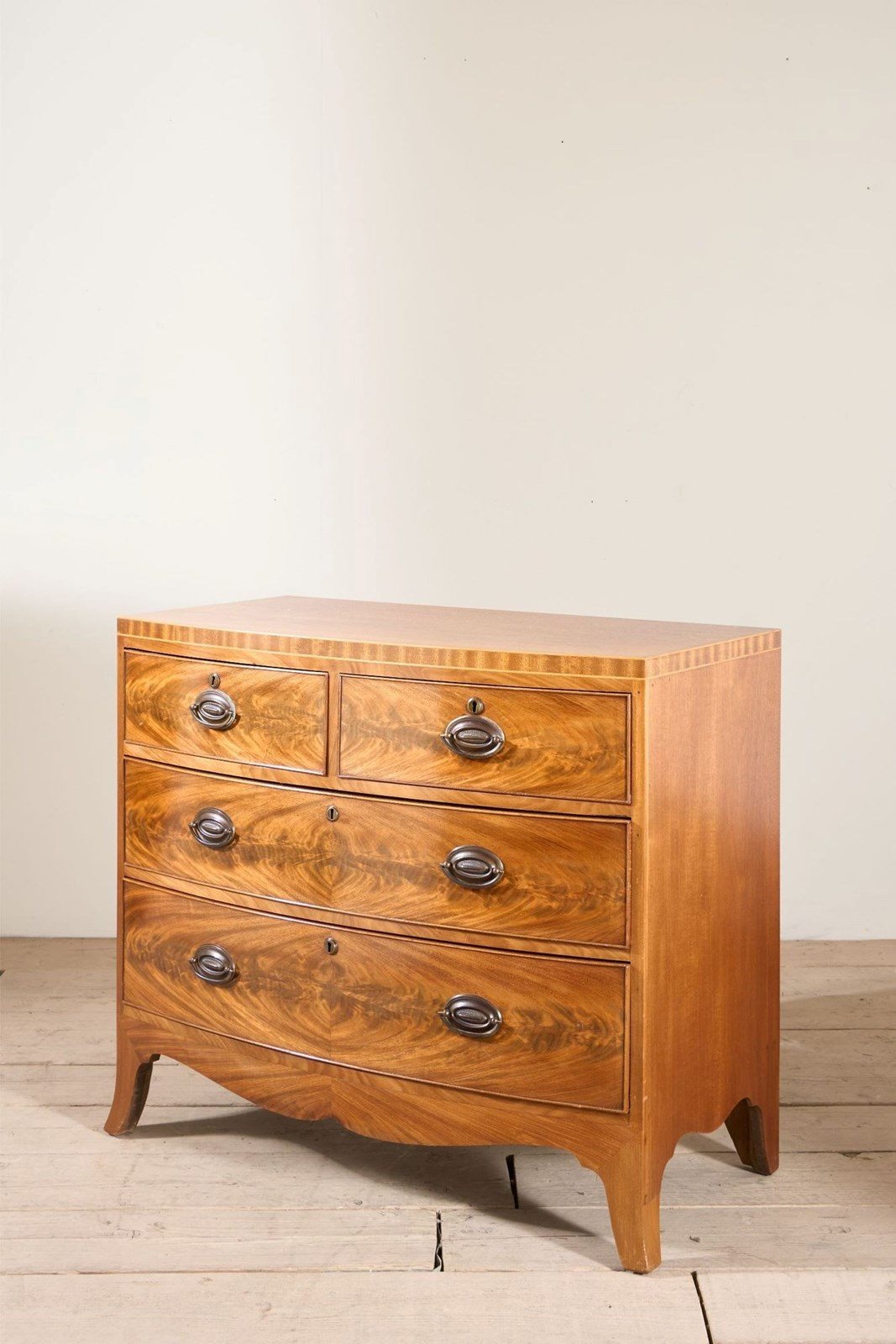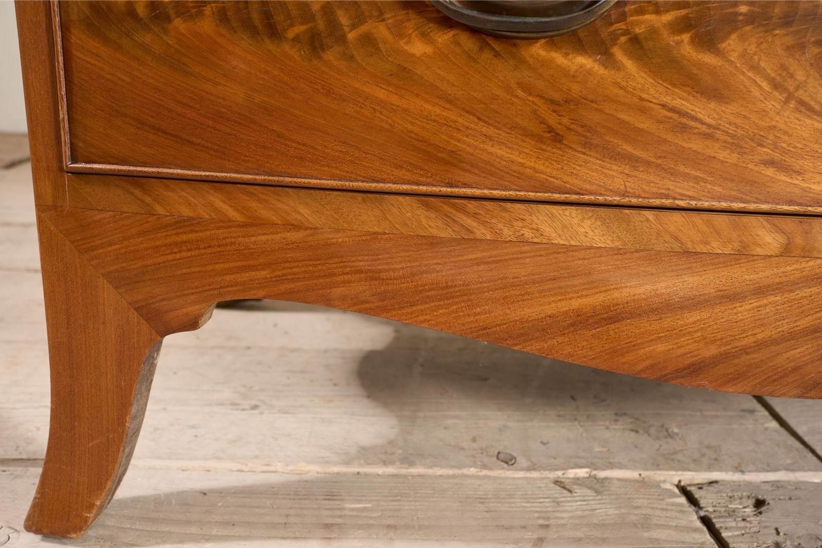 This is a lovely quality and very neat early 20th century bow fronted chest of drawers. The timber used has a beautiful grain and colour. The handles are brass and a gorgeous design. The top is clean of any major scratches and marks. The bow front design is very elegant which is emphasised by the splayed legs. The drawers all run smoothly and shut flush. The strung detail and vertical use of the timber along the top is a stunning detail that adds a lot to the piece.