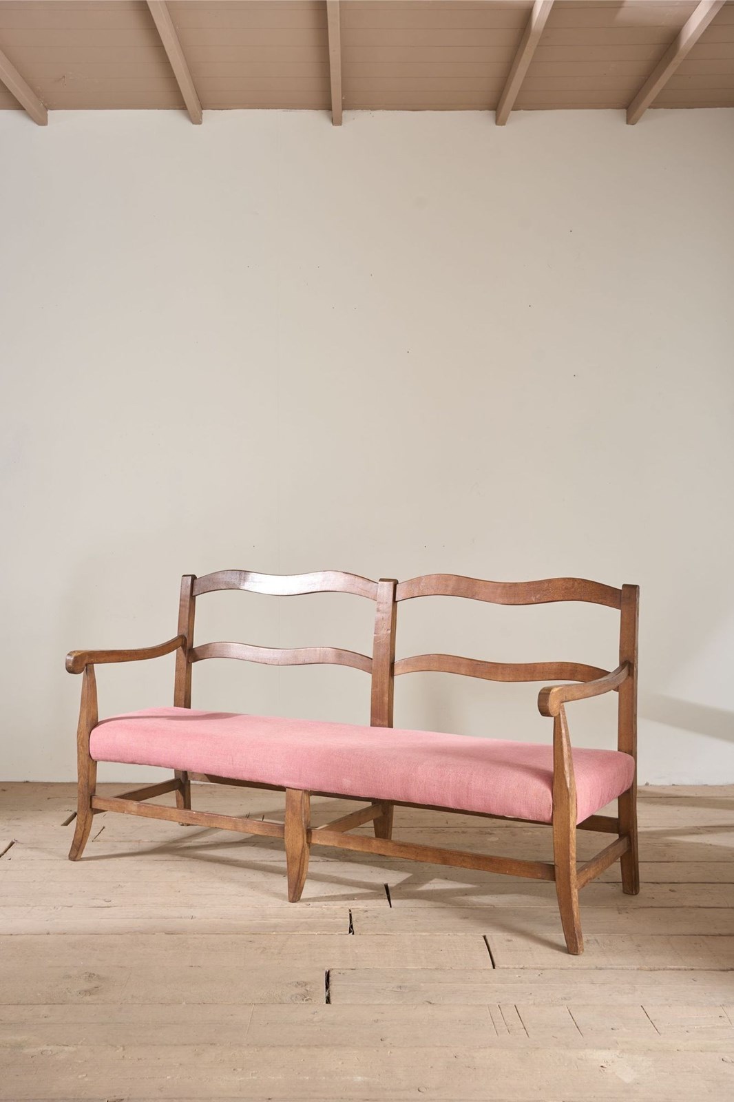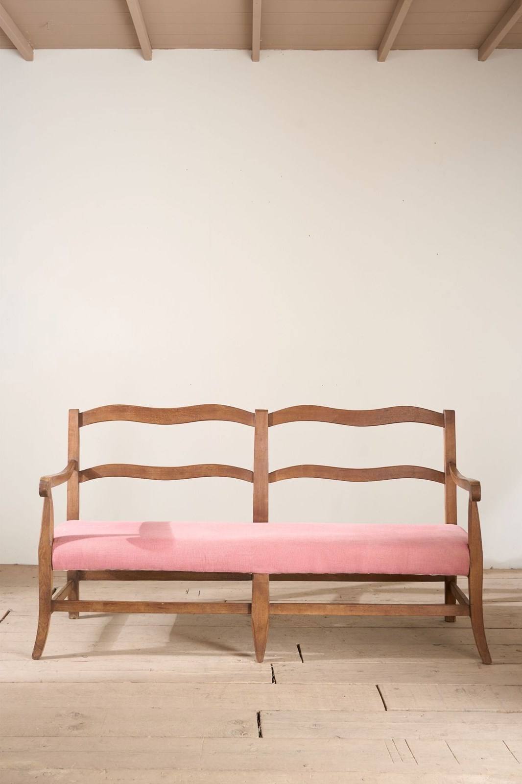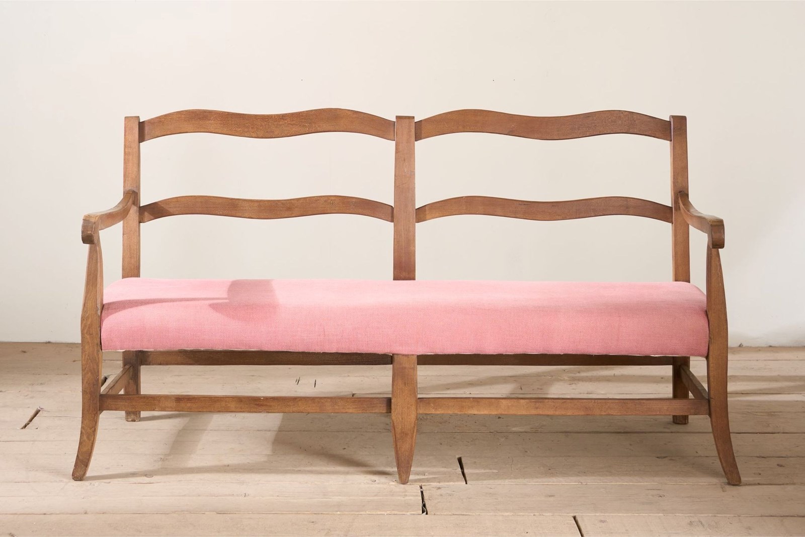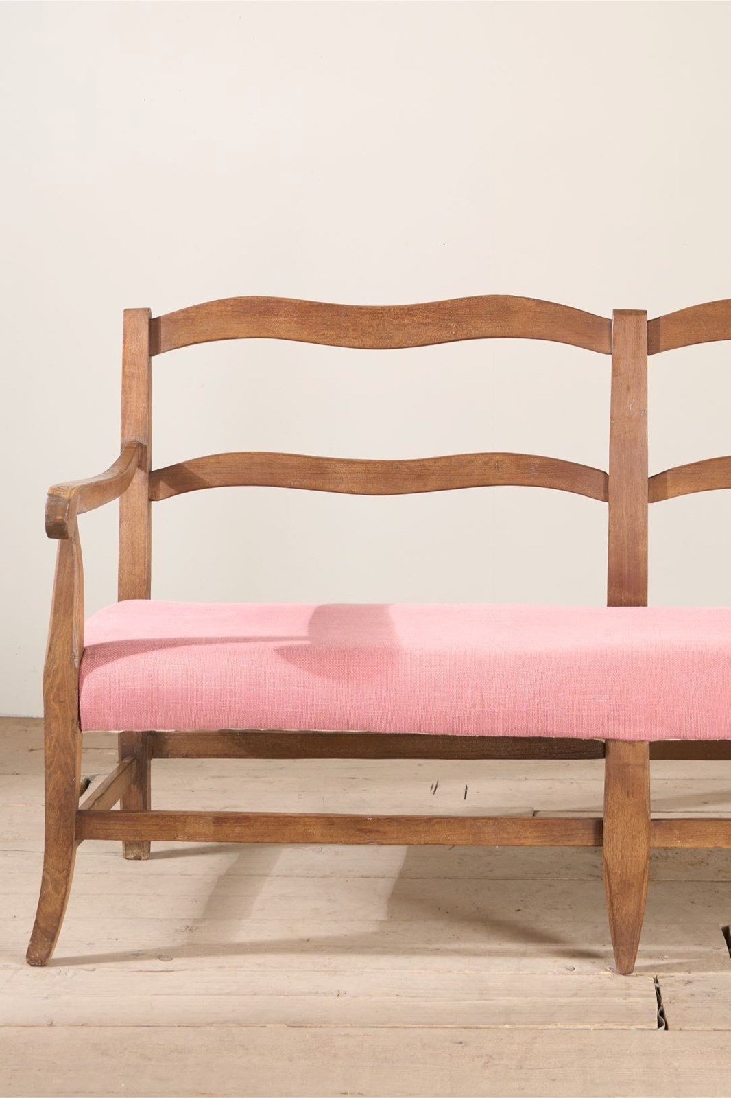 This is an effortlessly elegant early 20th century French hall bench. The wavy back rest and the splayed legs are stunning. This is recently upholstered (not by us) but clean to be used as is or we can recover if you prefer. The patina to the timber is wonderful and the size makes this the ideal hall bench or end of a bed.