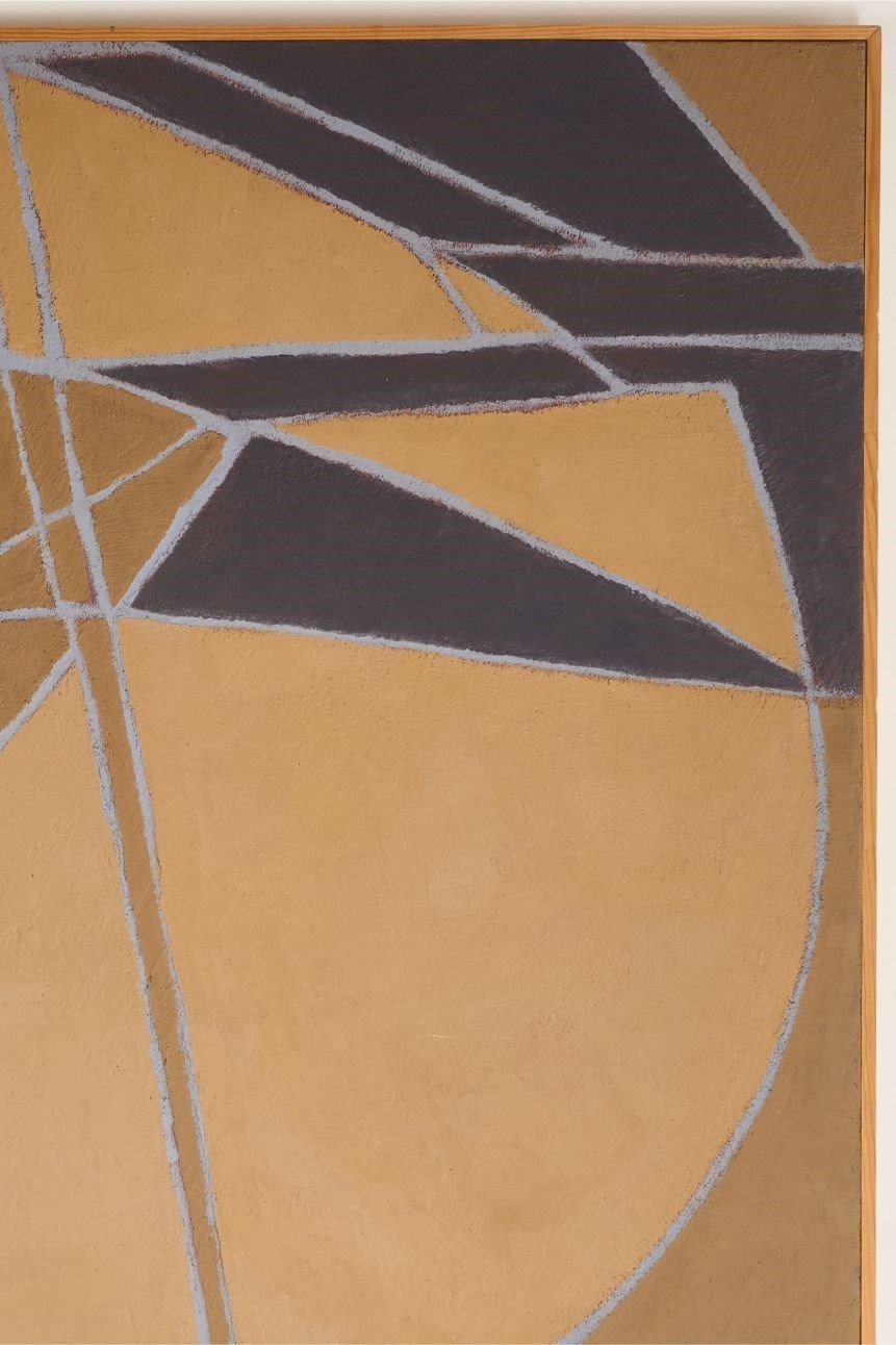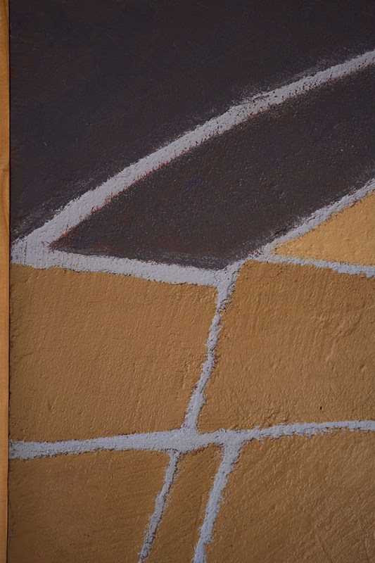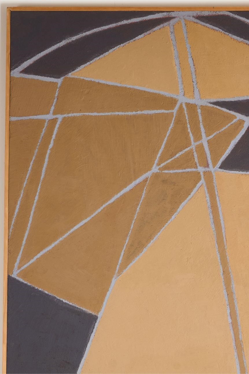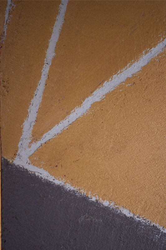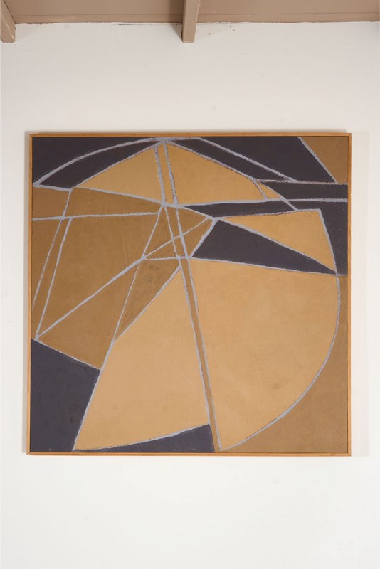This is a striking 20th century Abstract painting. It was a submission of a stain glass proposal for a church in Belgium. This piece is acrylic on board mixed with gesso and sand to create a thick hard texture. The varying shades of colour make this an ideal wall piece for a number of interiors. Its large size is perfect as well. The whole piece is bordered in a pine frame.