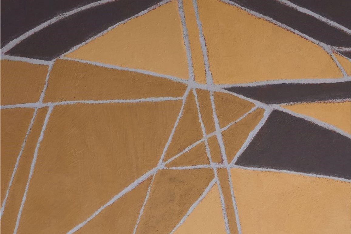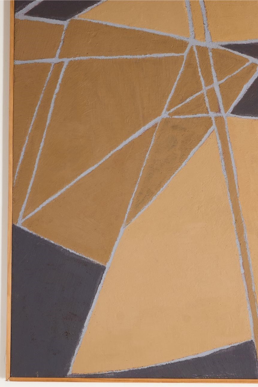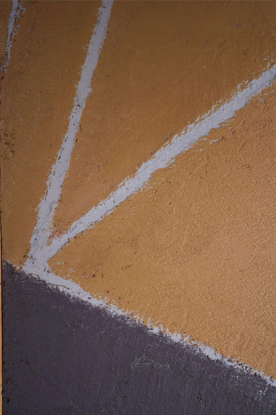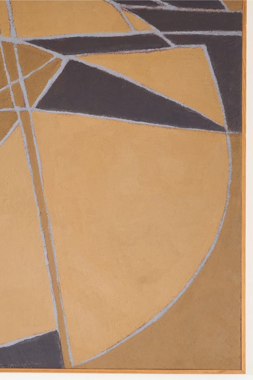This is a striking 20th century Abstract painting. It was a submission of a stain glass proposal for a church in Belgium. This piece is acrylic on board mixed with gesso and sand to create a thick hard texture. The varying shades of colour make this an ideal wall piece for a number of interiors. Its large size is perfect as well. The whole piece is bordered in a pine frame.