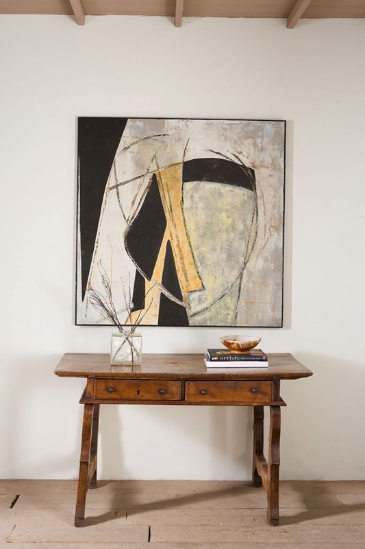 On our last buying trip to France we met Sylvia by chance and got talking about her interest in antiques and the fact she was an artist. We looked at her work and I fell in love with it immediately. She works with acrylic paint mixed with gesso and paints onto board giving her artwork a wonderful thickness and texture.