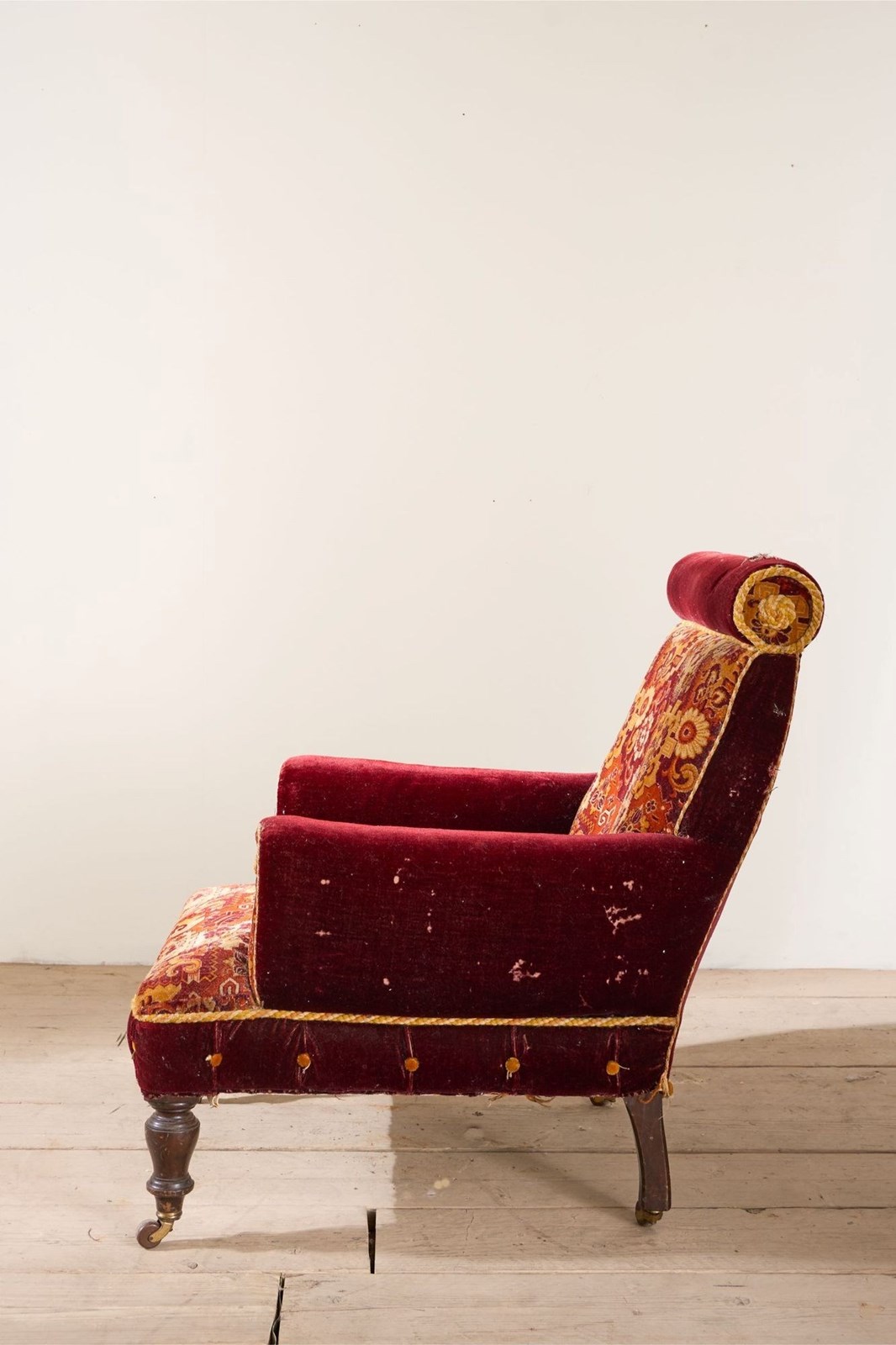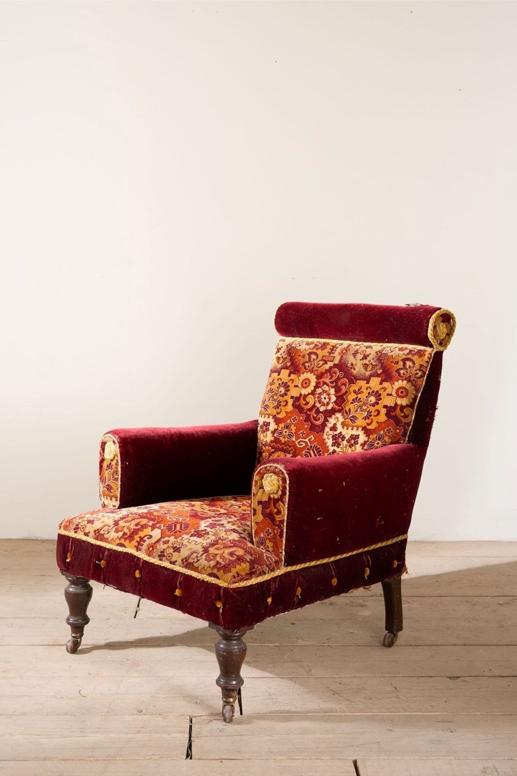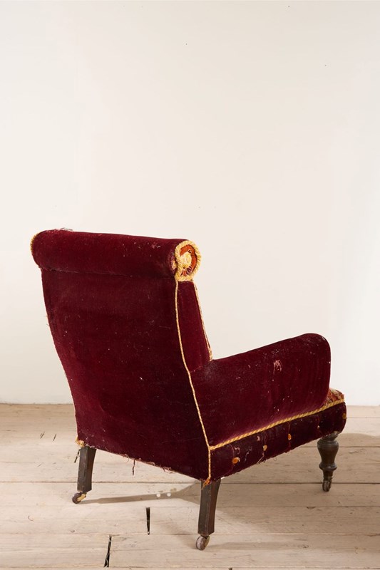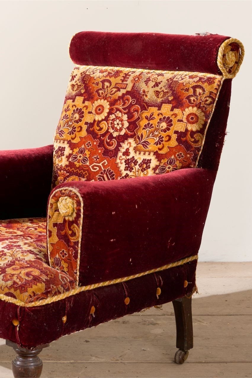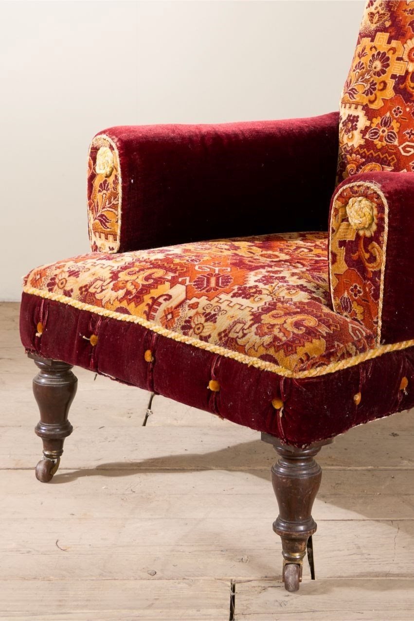 Always a joy when I find these original Victorian carpet covered chairs. This model is particularly large size with unusual design with the scroll back and pillow arms. The carpet is for the most part clean condition and vibrant in colour. There is a small hole on the top of the back scroll and the braiding around the edge are a little thin. But perfectly useable and all original. Although I am selling this as a carpet chair we can always upholster this should you like the design but not the carpet. Just get in touch.