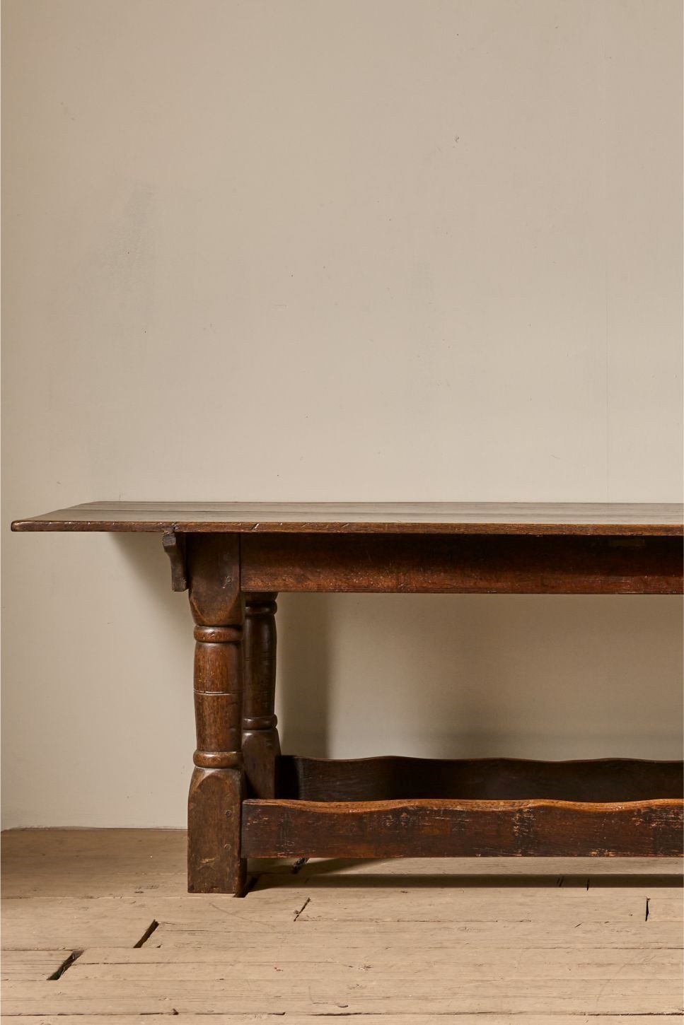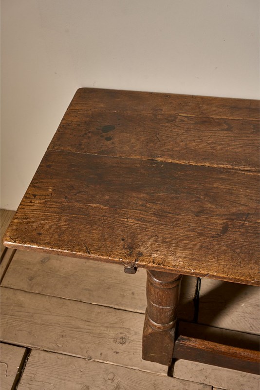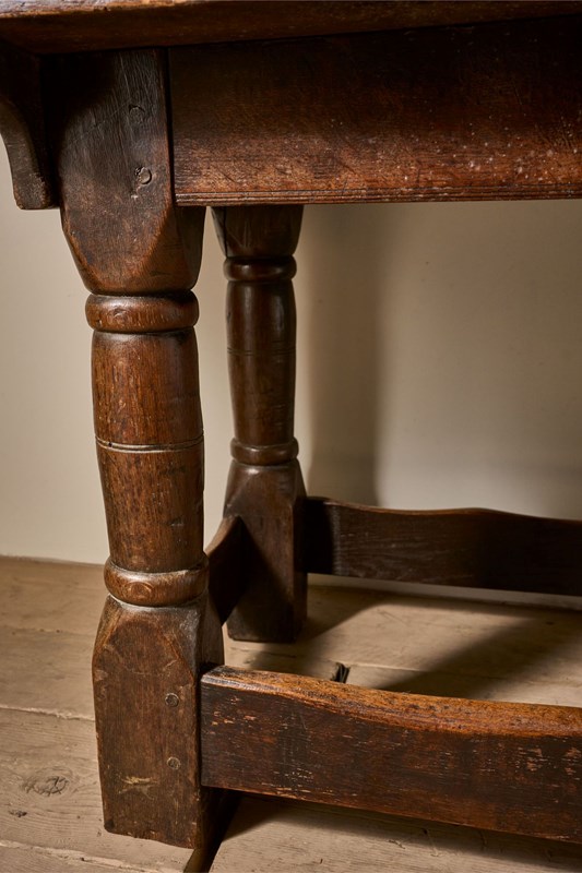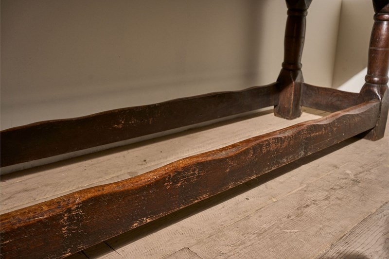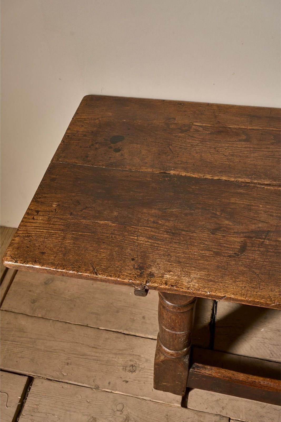 This is a fabulous quality, all original 18th century oak refectory table. Full of character from years of use and in great overall condition with aged patina. The turned thick legs and worn stretchers give this table a great presence and ideal as a narrow dining table or large console. The top is two planks of oak. The top comes off and is held in place with original pegs. Always great to find English country furniture like this in untouched honest condition.