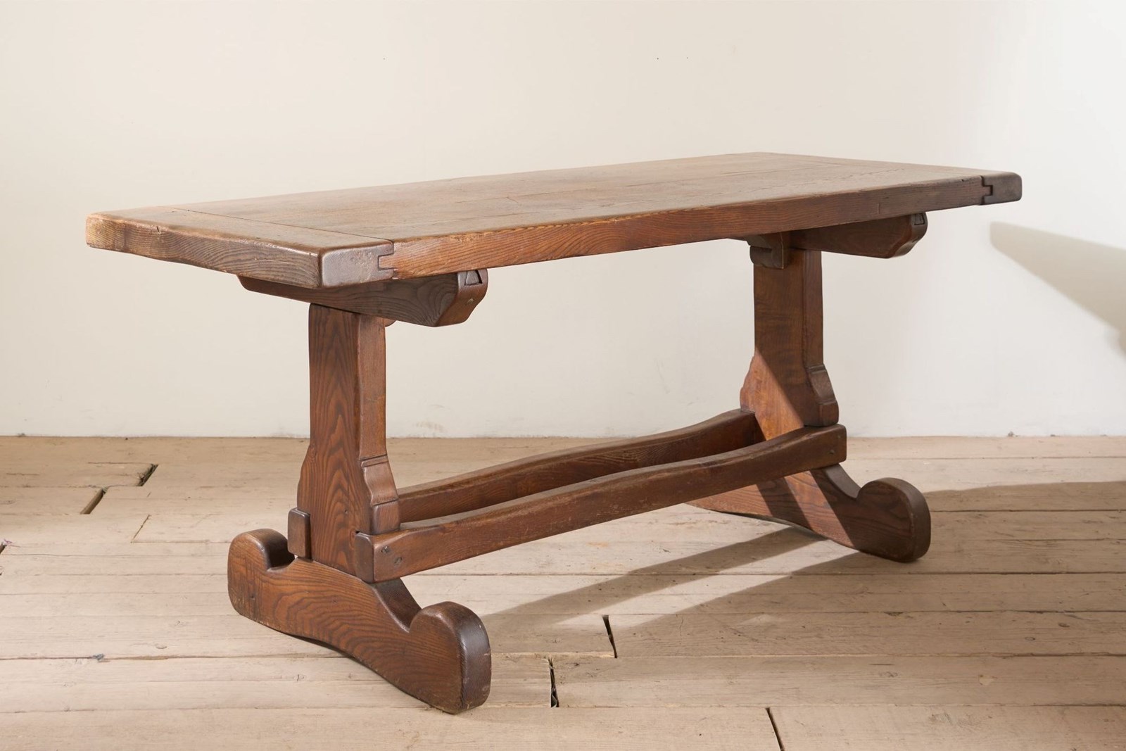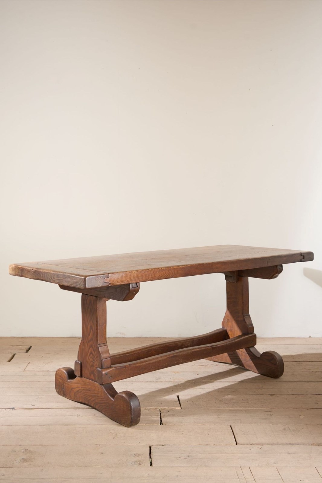 This is a beautiful bold designed mid 20th century solid elm dining table. The design is unusual as it has a double stretchered base which I absolutely love. The form is wonderful and it has a real elegance and very much a design movement of the moment. This is a perfect neat dining table or large desk. Solid condition with wonderful patina. Makers mark is stamped to the underside 'TP'. French in origin.