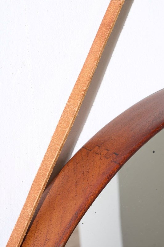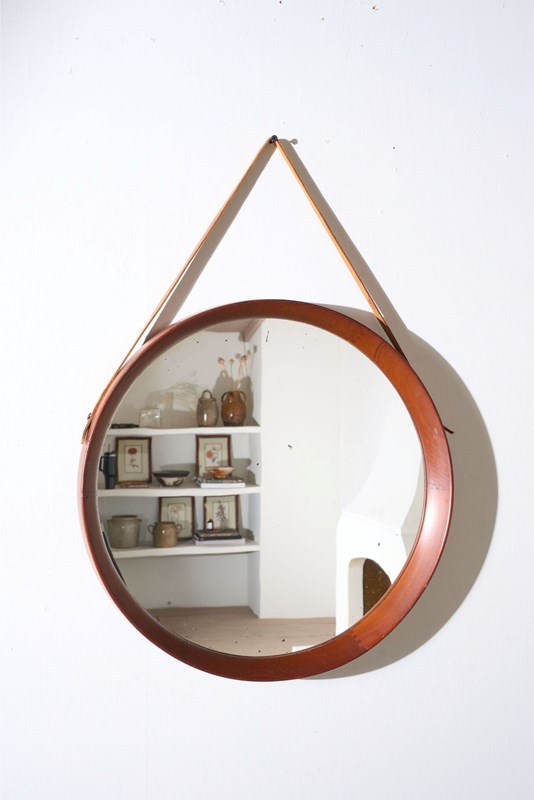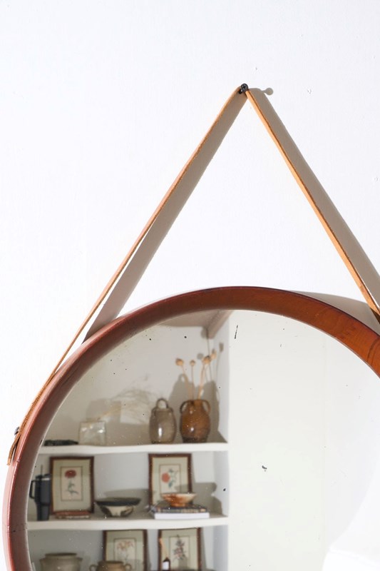 This is a stunning and effortlessly elegant Mid 20th century solid teak circular wall mirror. The quality is very high with a deep frame and attractive tooth joints. The size makes the mirror highly decorative and practical. Clean overall condition with light foxing to the original mirror plate. The hanging is leather.