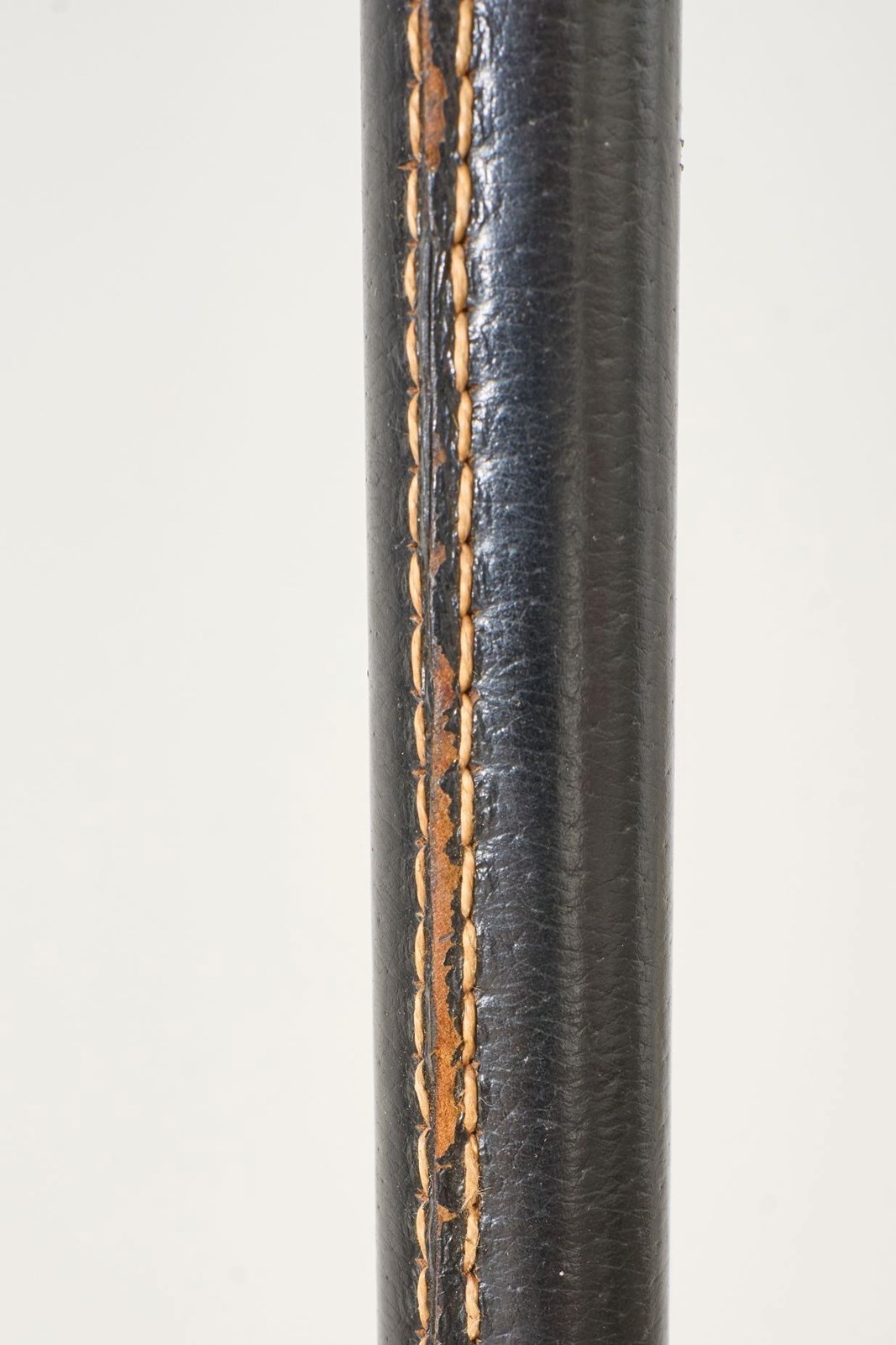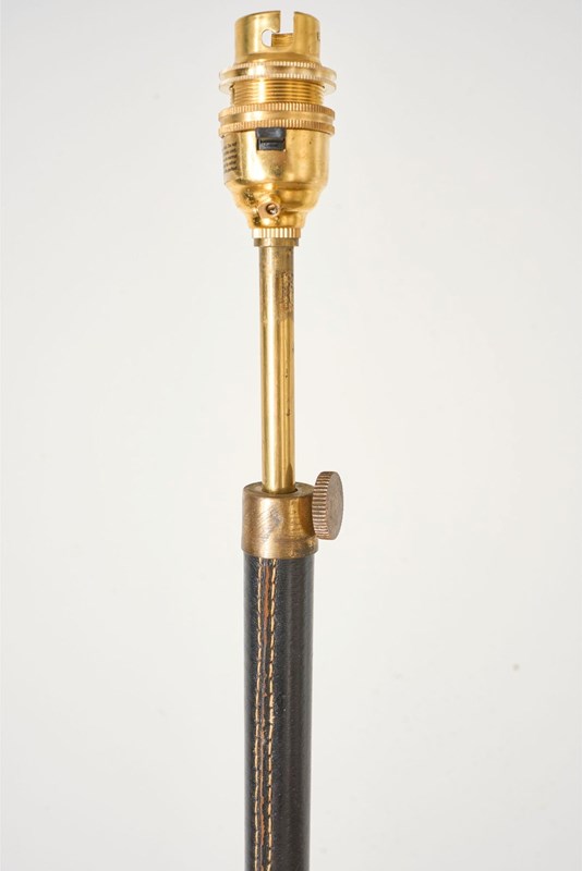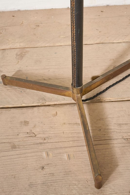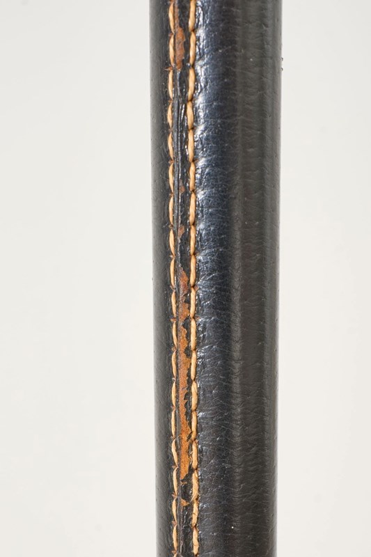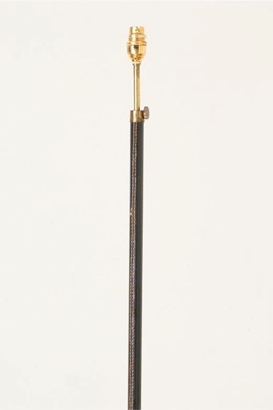 This is a stunning black leather and brass Spanish floor lamp. The stitching down the lamp is a wonderful detail and the amount of wear to the lamp is perfect. Its a neat size and classic design so will stand the test of time. The bulb holder can raise up and down a little to make adjustments.