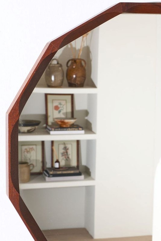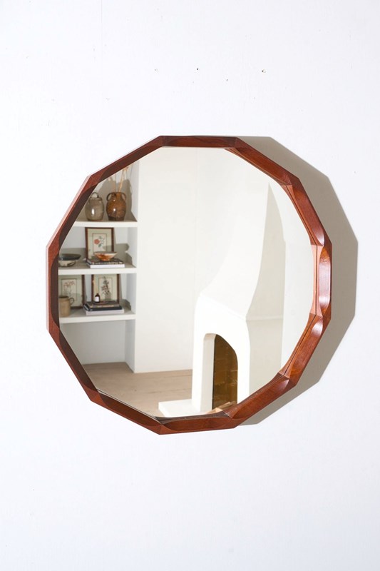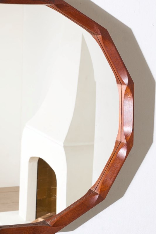 This is a striking design by Italian designer Dino Cavalli. Produced in Italy in the 1960's. The Dodecagon solid Teak frame with chamfered edges is finely done. The mirror plate is perfect condition and clean. The overall size makes these hugely decorative as well.